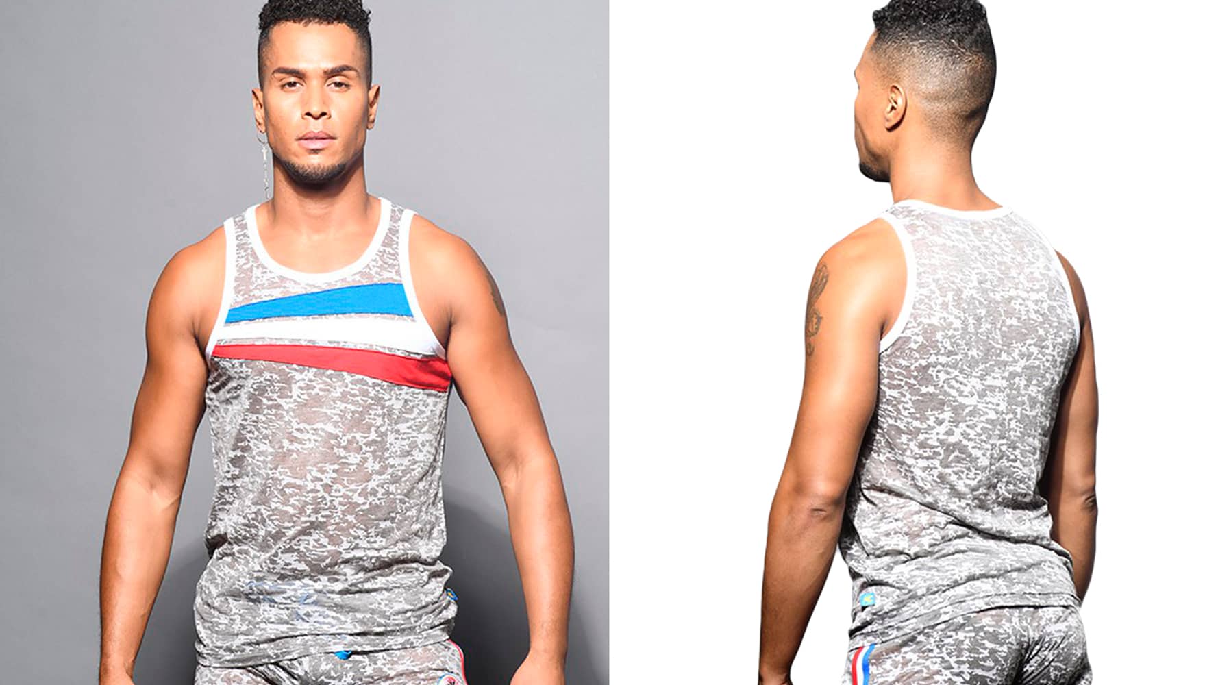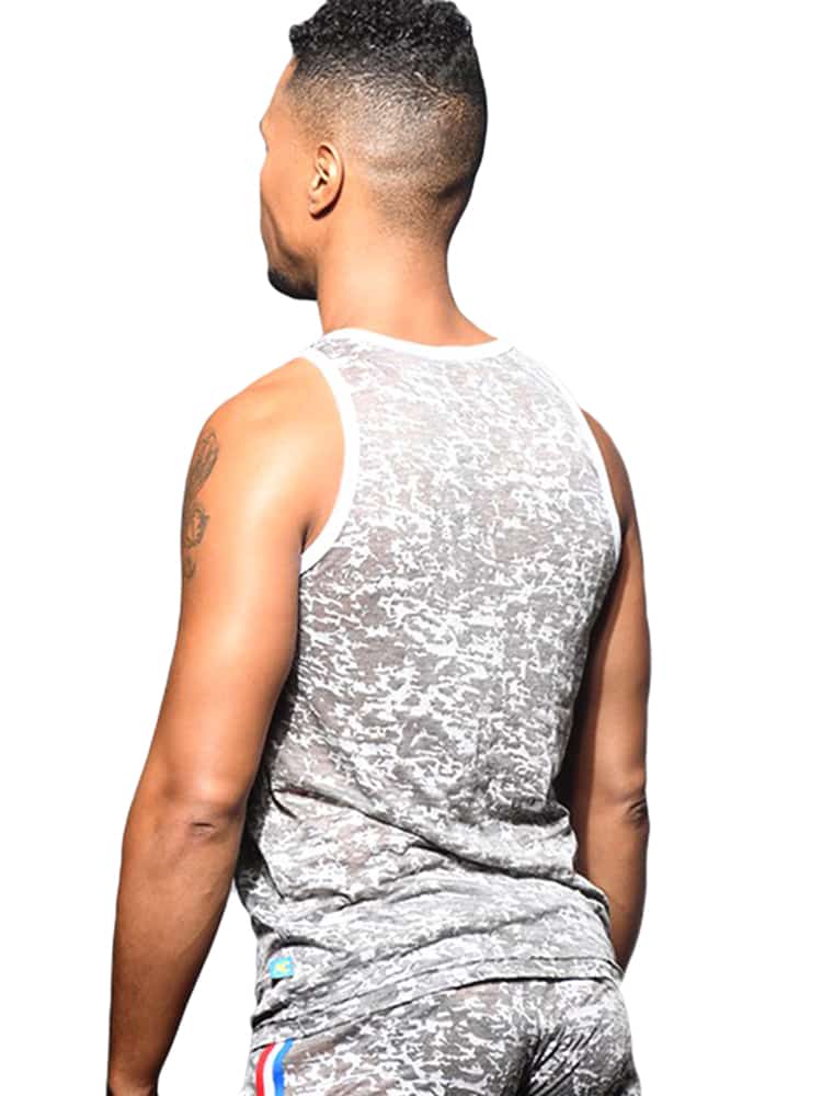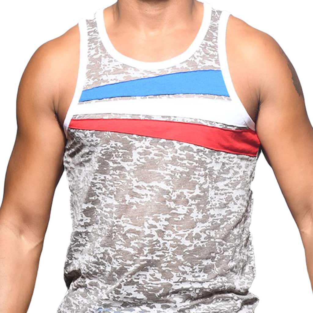De California Superhero is een tanktop van Andrew Christian die is gemaakt van gedeeltelijk transparant katoen en polyester. Daarom is hij lichtgewicht, droogt snel en is hij perfect voor de atletische man. De tanktop met zijn ronde halslijn is verkrijgbaar in lichtgrijs met contrasterende strepen op de borst.