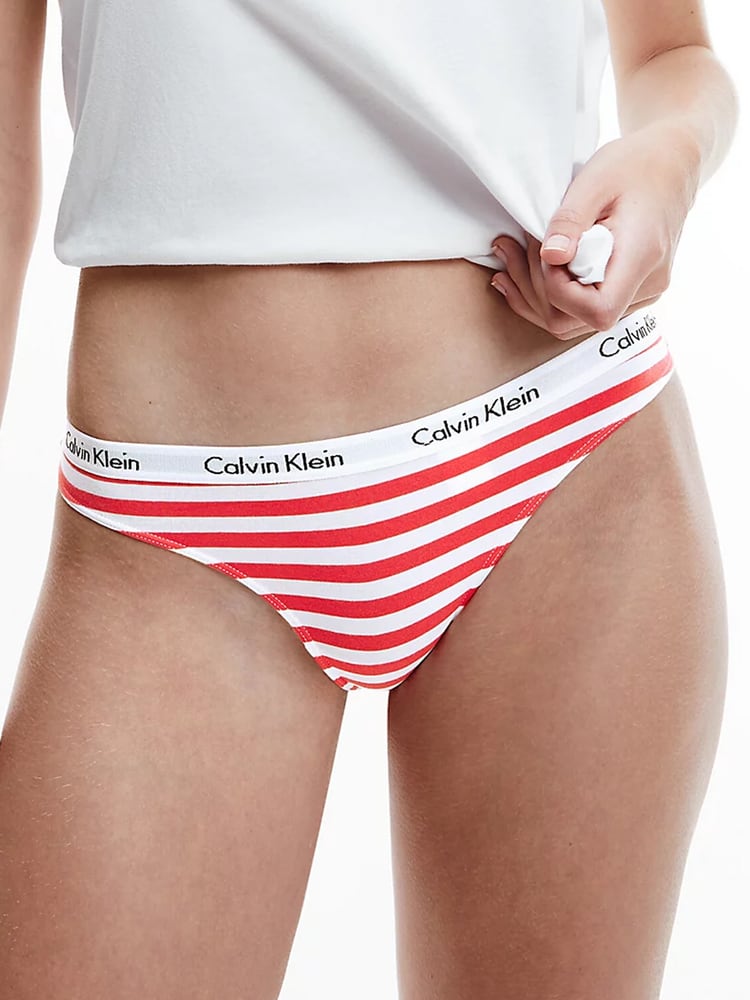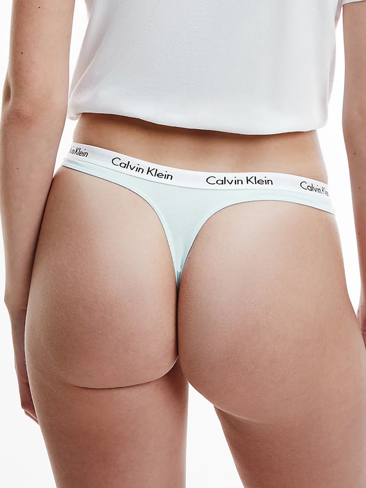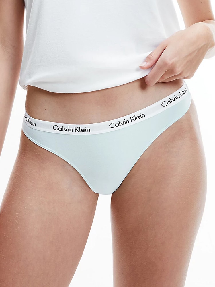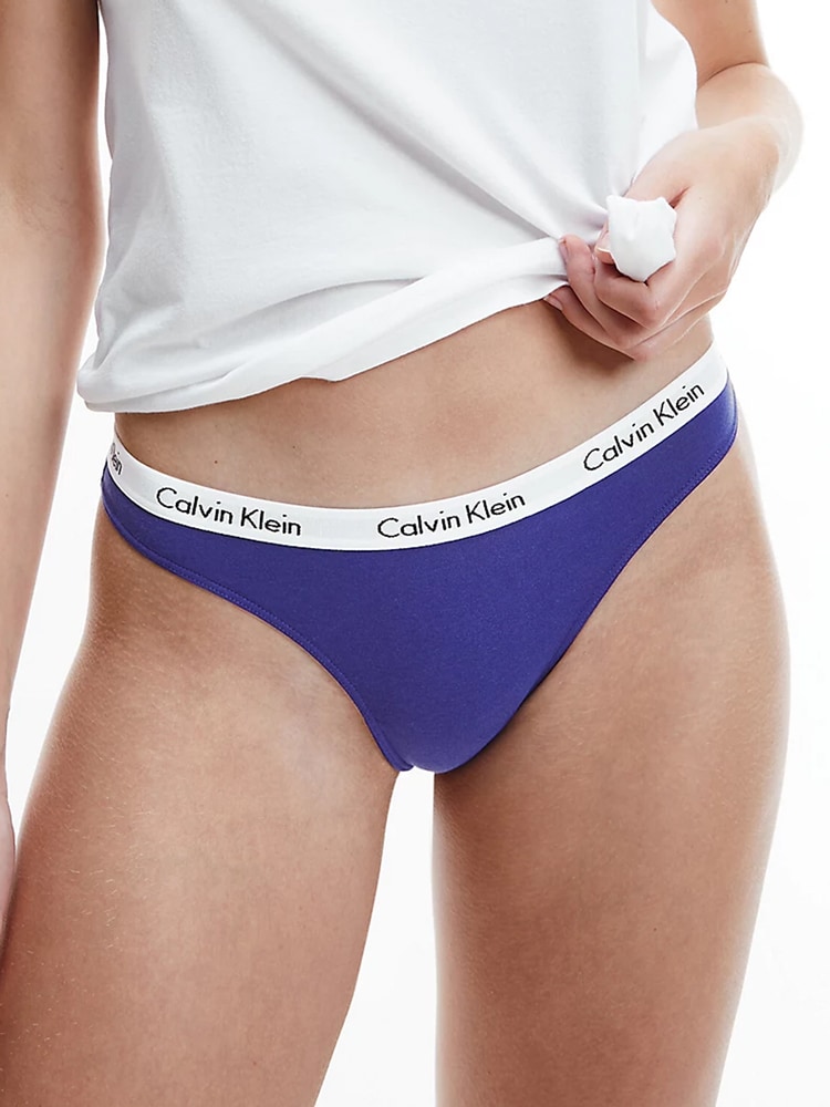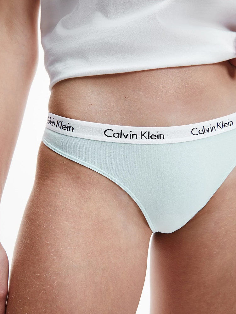 Drie dames strings van Calvin Klein in een voordeelpak, gemaakt van zacht ventilerend stretch katoen in diverse kleuren, voor de afwisseling met op elastische heupband het Calvin Klein logo.