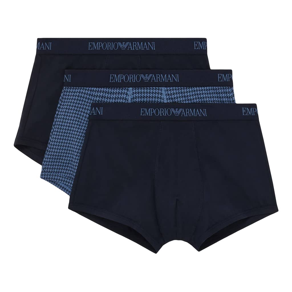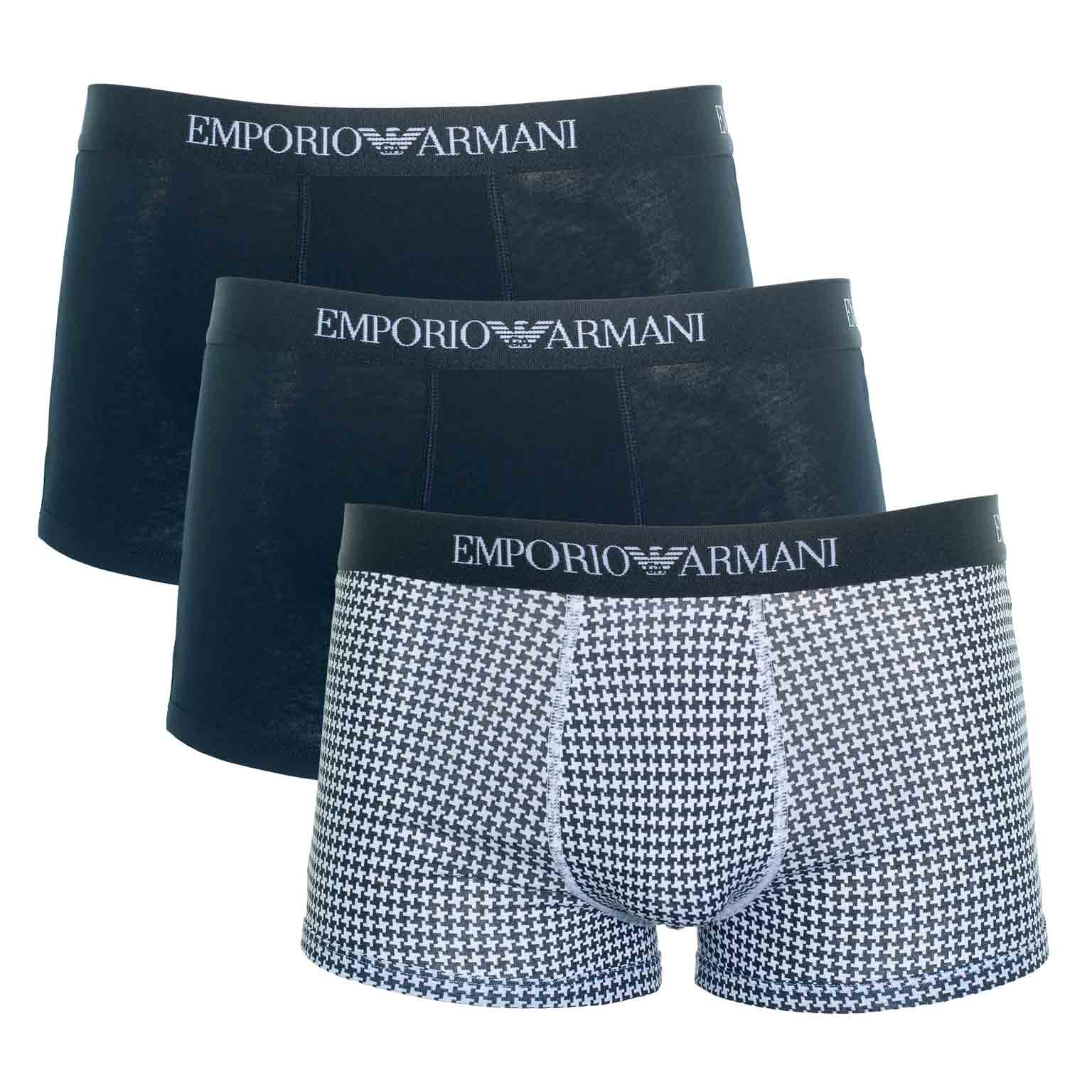 3 Trunks van Emporio Armani in een voordeelpack gemaakt van 100% katoen. De boxers zijn gebreiden in een jersey voor een elastische pasvorm en de beste fit. De perfecte heren boxer voor elke man die enkel 100% natuurlijke stoffen wil dragen. Het trunk model is een boxershort met kortere pijpjes met een chique, jong en fris uiterlijk waarbij je minder last hebt van oprollen van de pijpjes over het been. De boxer-set is verkrijgbaar in diverse kleurcombinaties, waarvan 2 boxers in een uni kleur en 1 boxer met een chique all-over print.