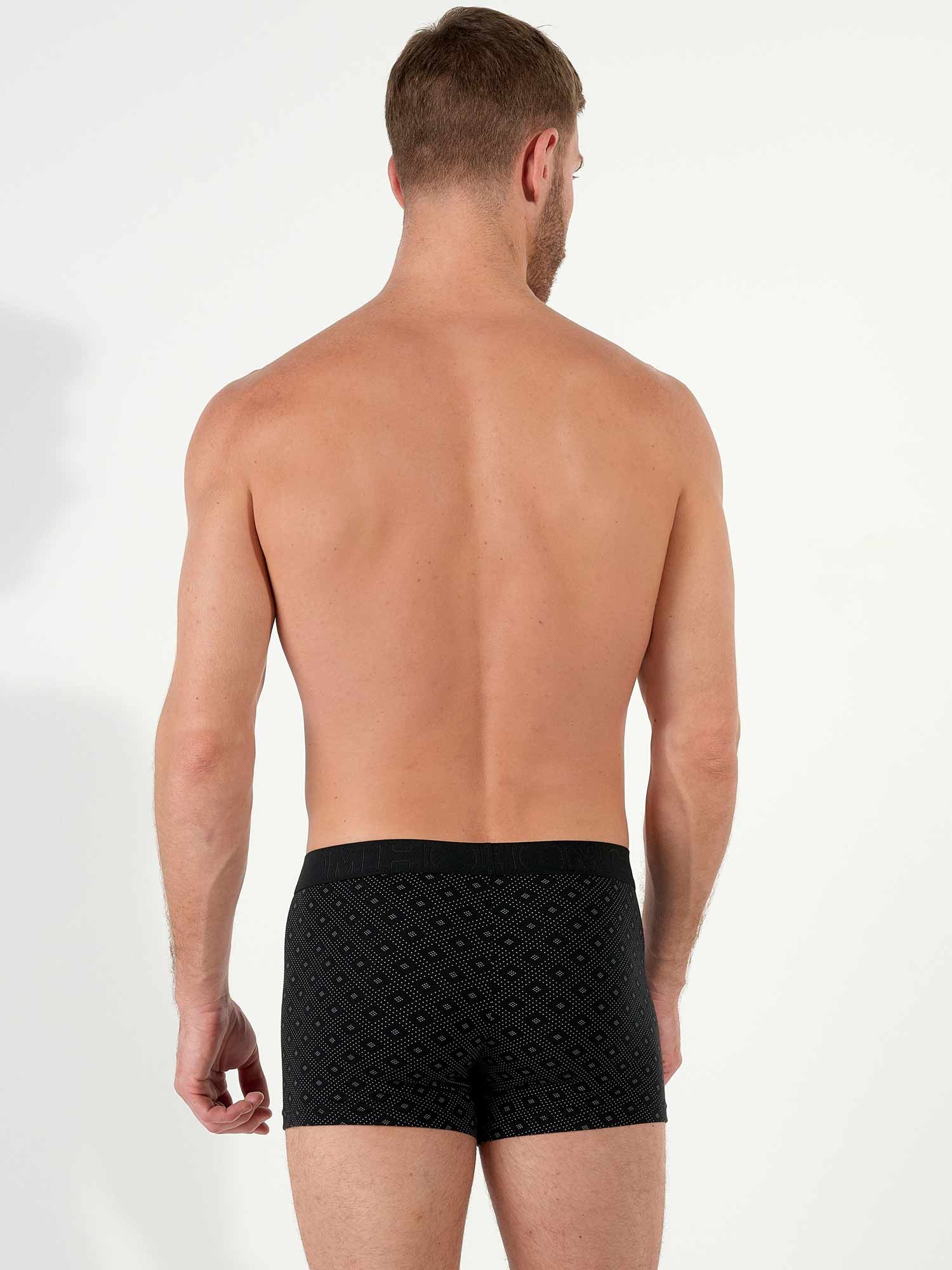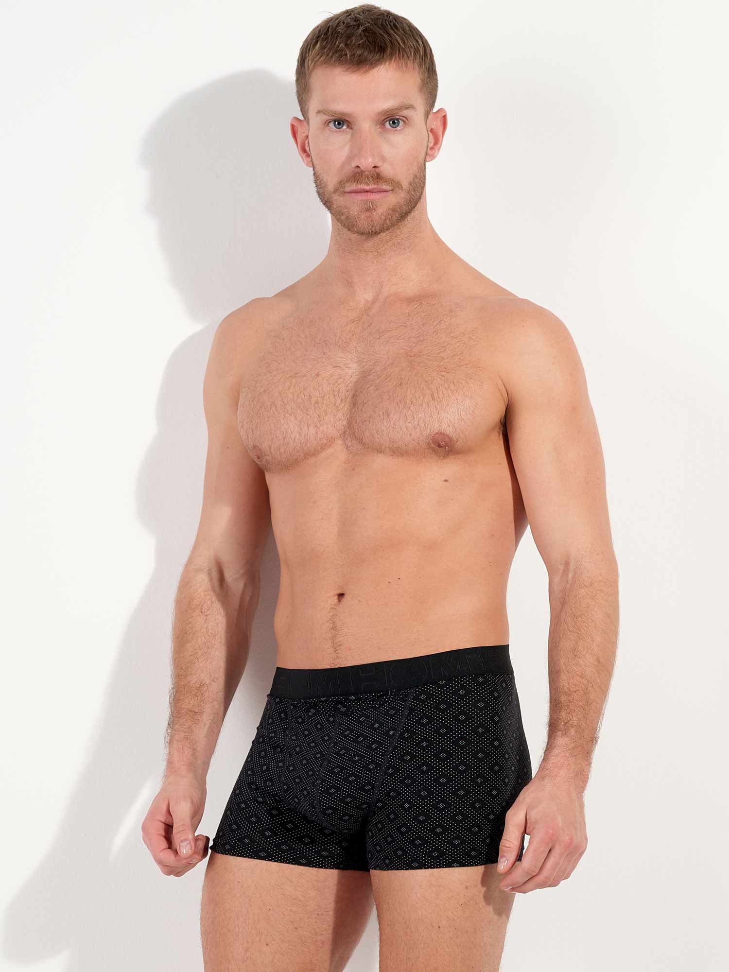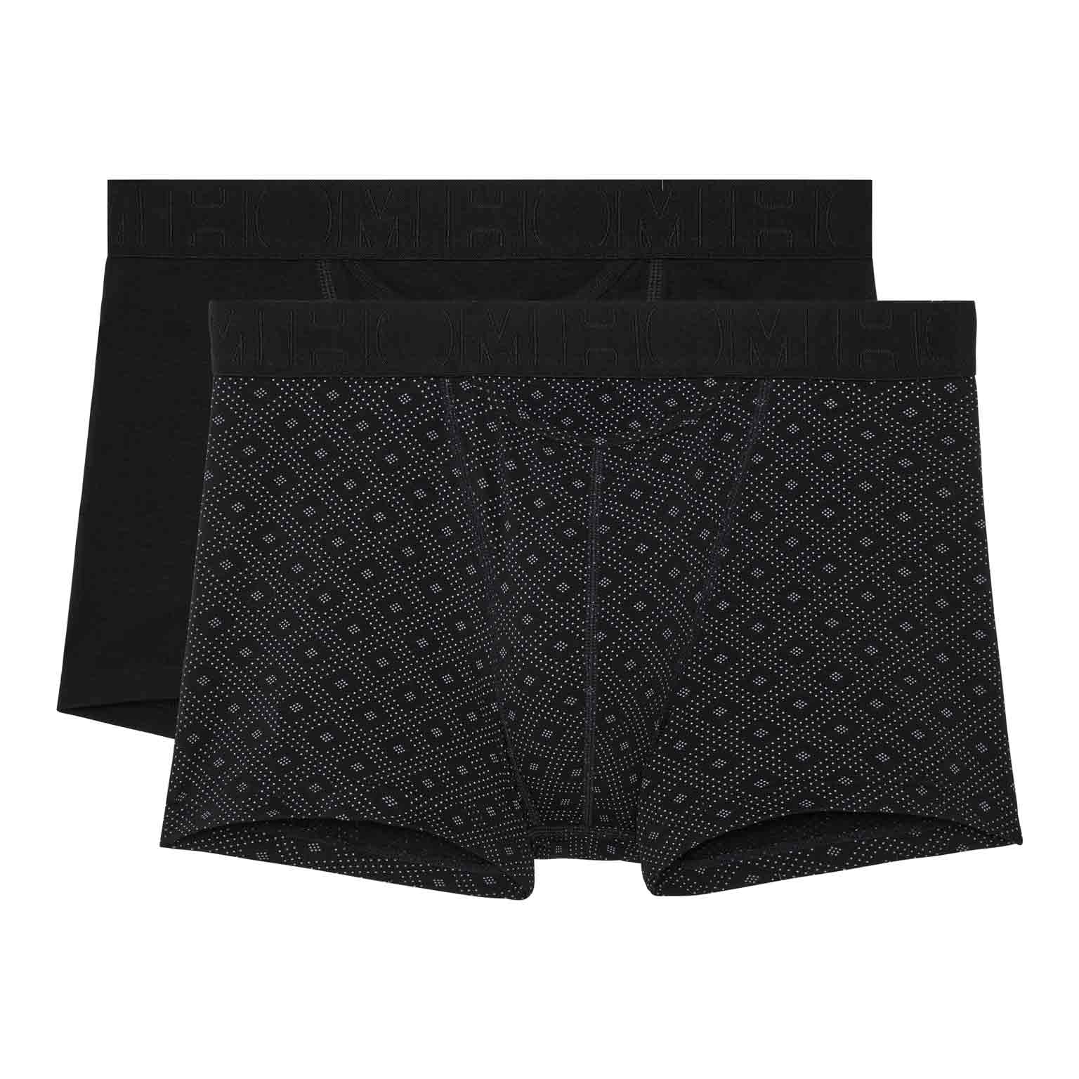 De boxers zijn uitgevoerd in effen zwart en met een verfijnde microprint in stropdasstijl. De pouch aan de voorzijde is gevoerd voor extra ondersteuning, en de elastische tailleband is rondom voorzien van het subtiele HOM-logo. Een ideale keuze voor wie comfort en stijl wil combineren.