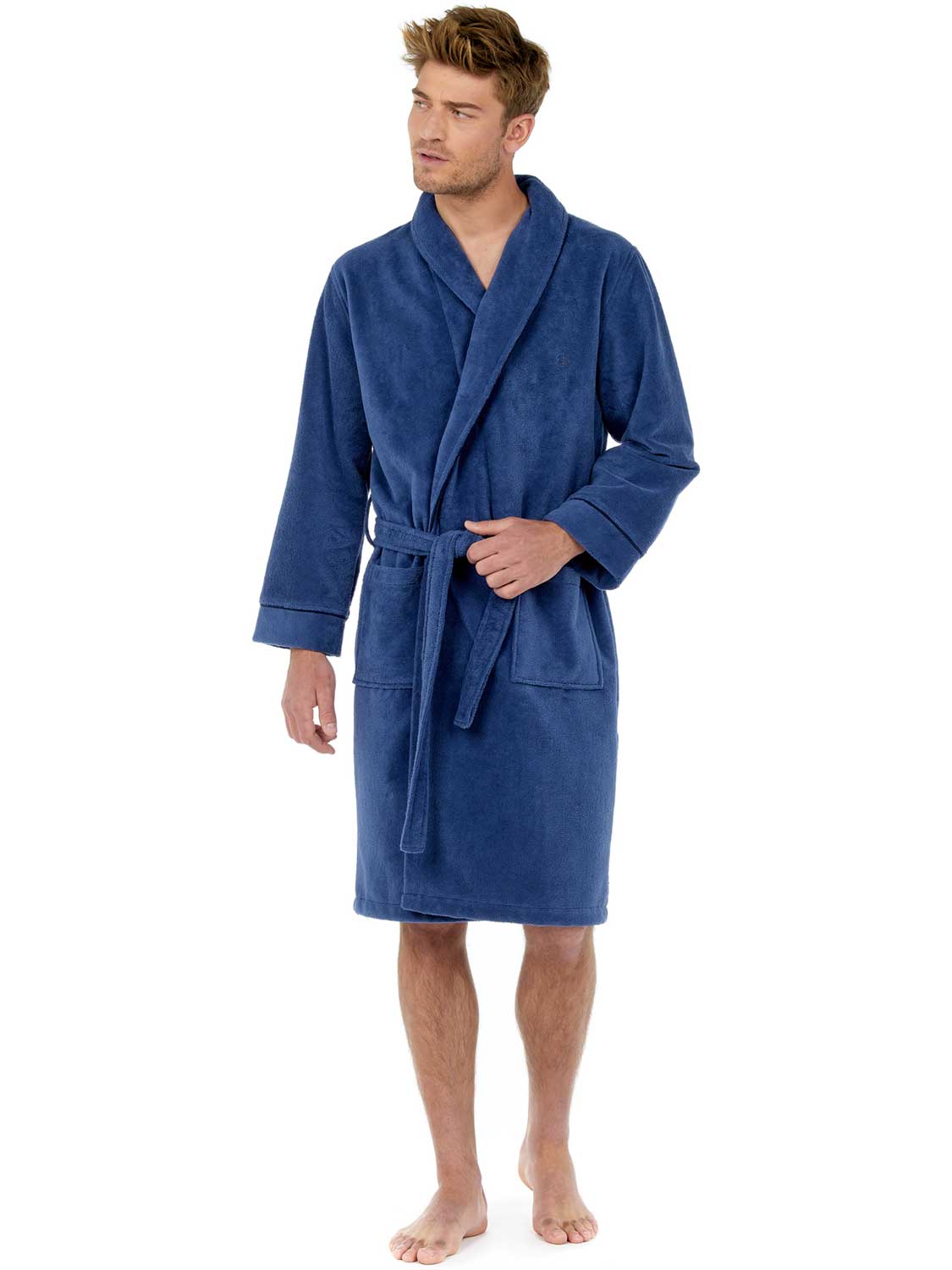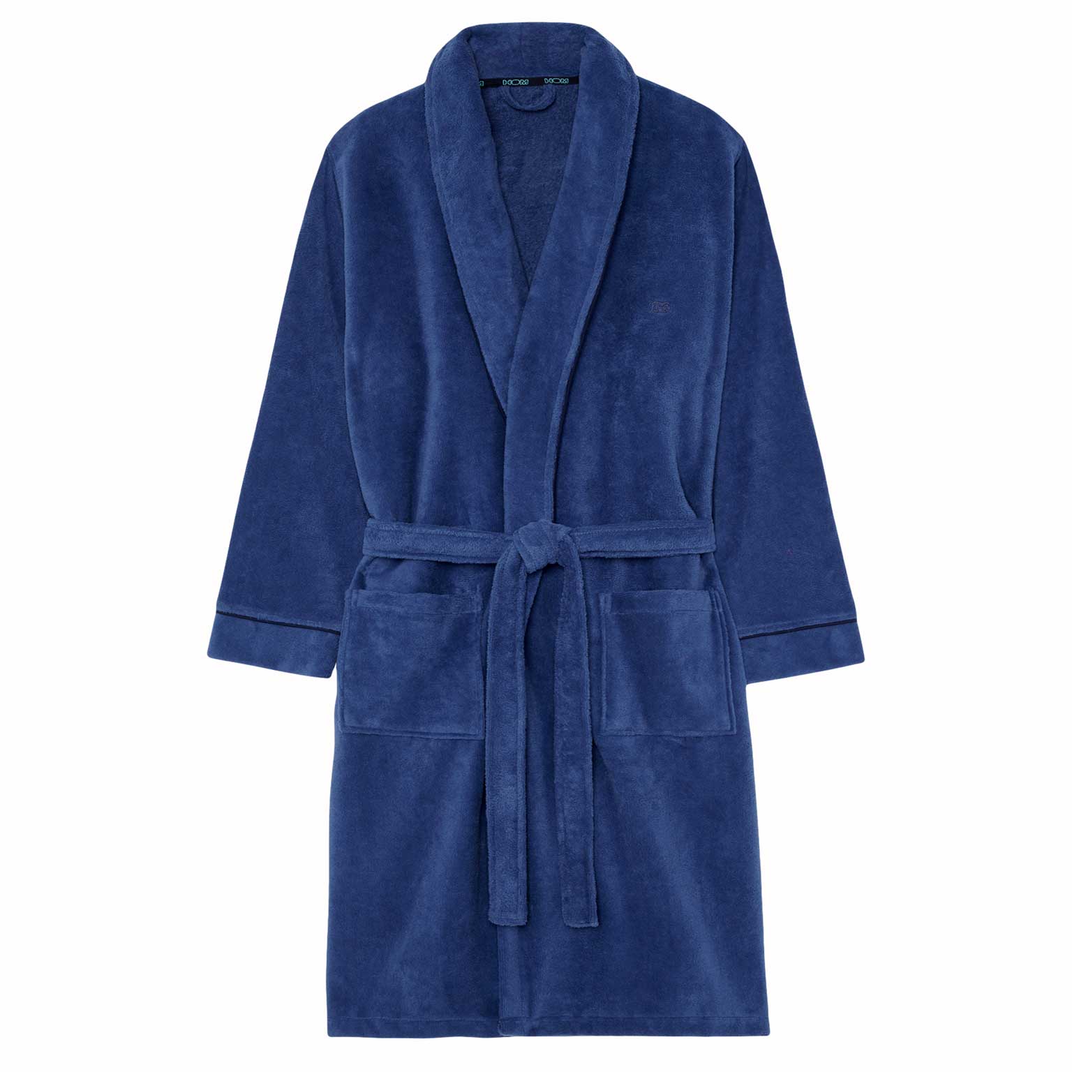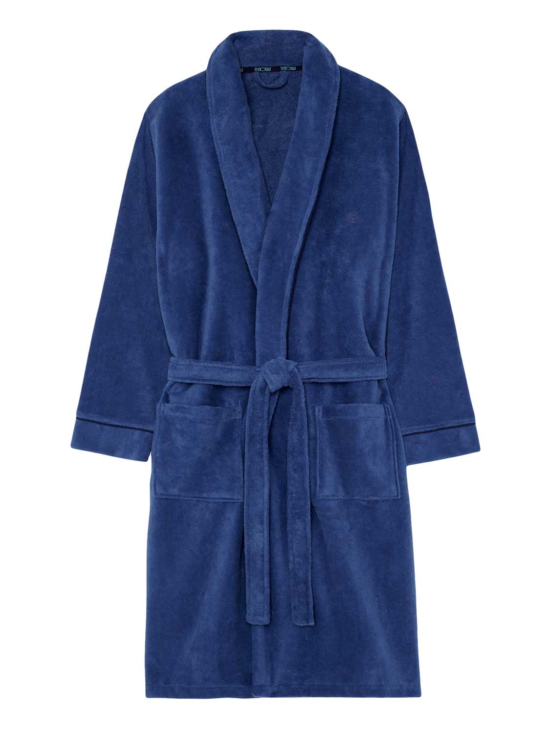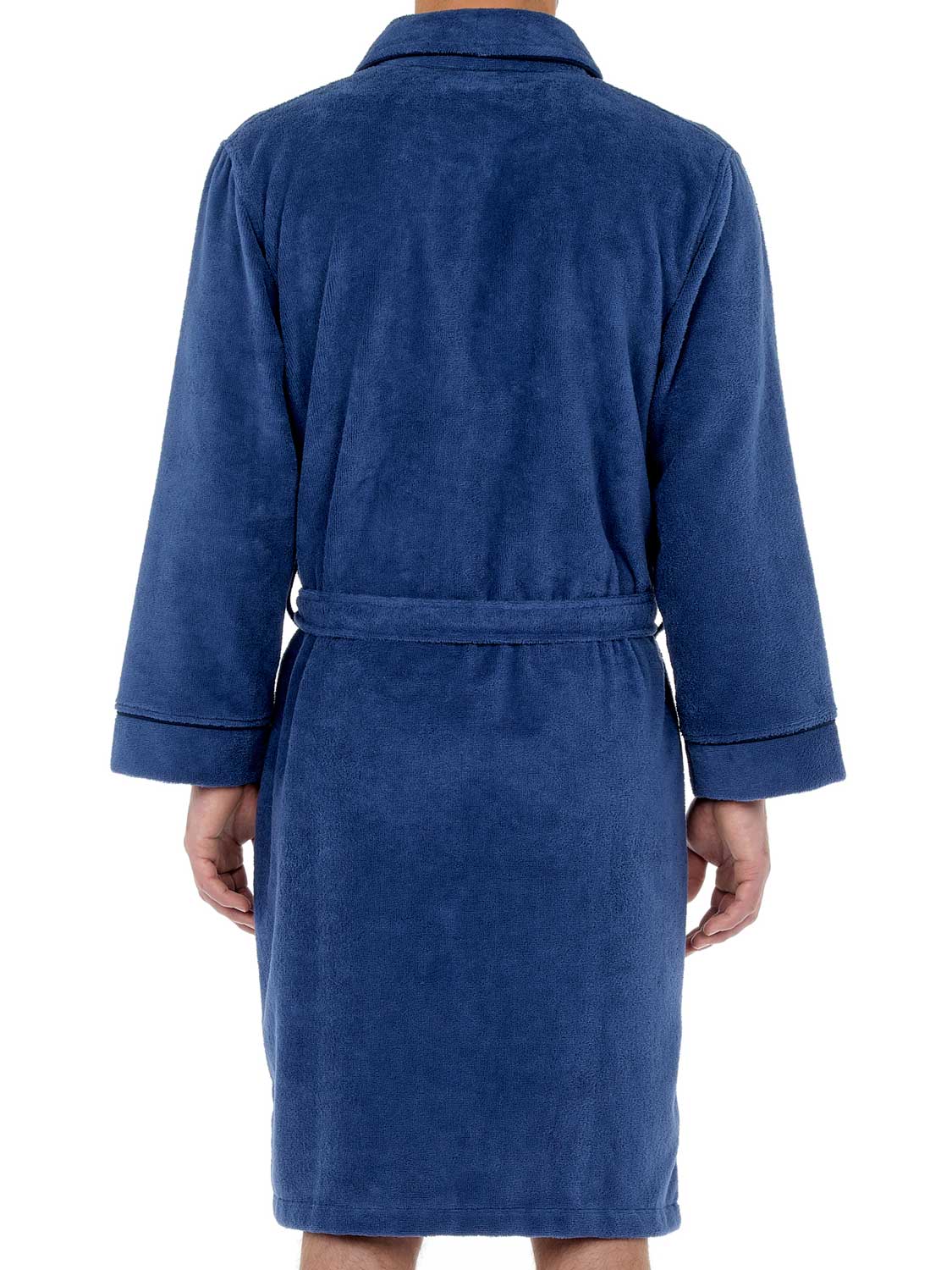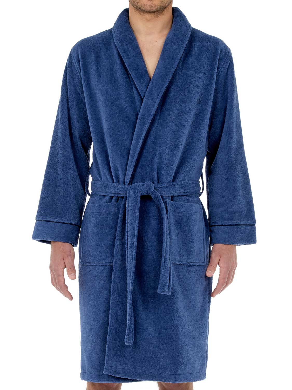 De Yvan - bathrobe is een lange badjas voor de man uitgevoerd in de kleur denim blauw, afgewerkt met marine blauwe contrastlijnen. De badjas voelt dik en zacht aan en is gemaakt van 90% katoen en 10% polyester. Het materiaal van deze fluwelen badstof badjas voelt zacht aan en is licht glanzend. Je sluit de badjas met het koord aan de binnenzijde of de bijpassende riem. Katoen is comfortabel gemakkelijk te reinigen en heeft uitstekende absorberende en temperatuur regulerende eigenschappen. Ideaal voor wanneer je net uit de douche stapt of voor in de sauna.