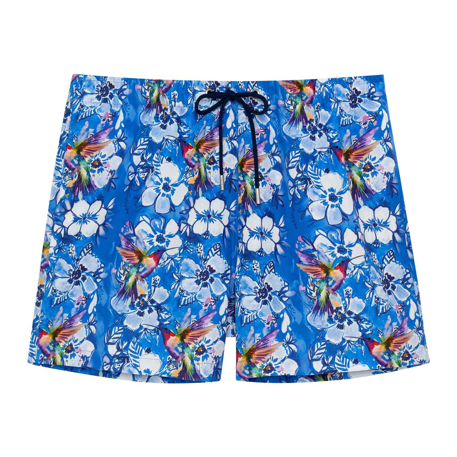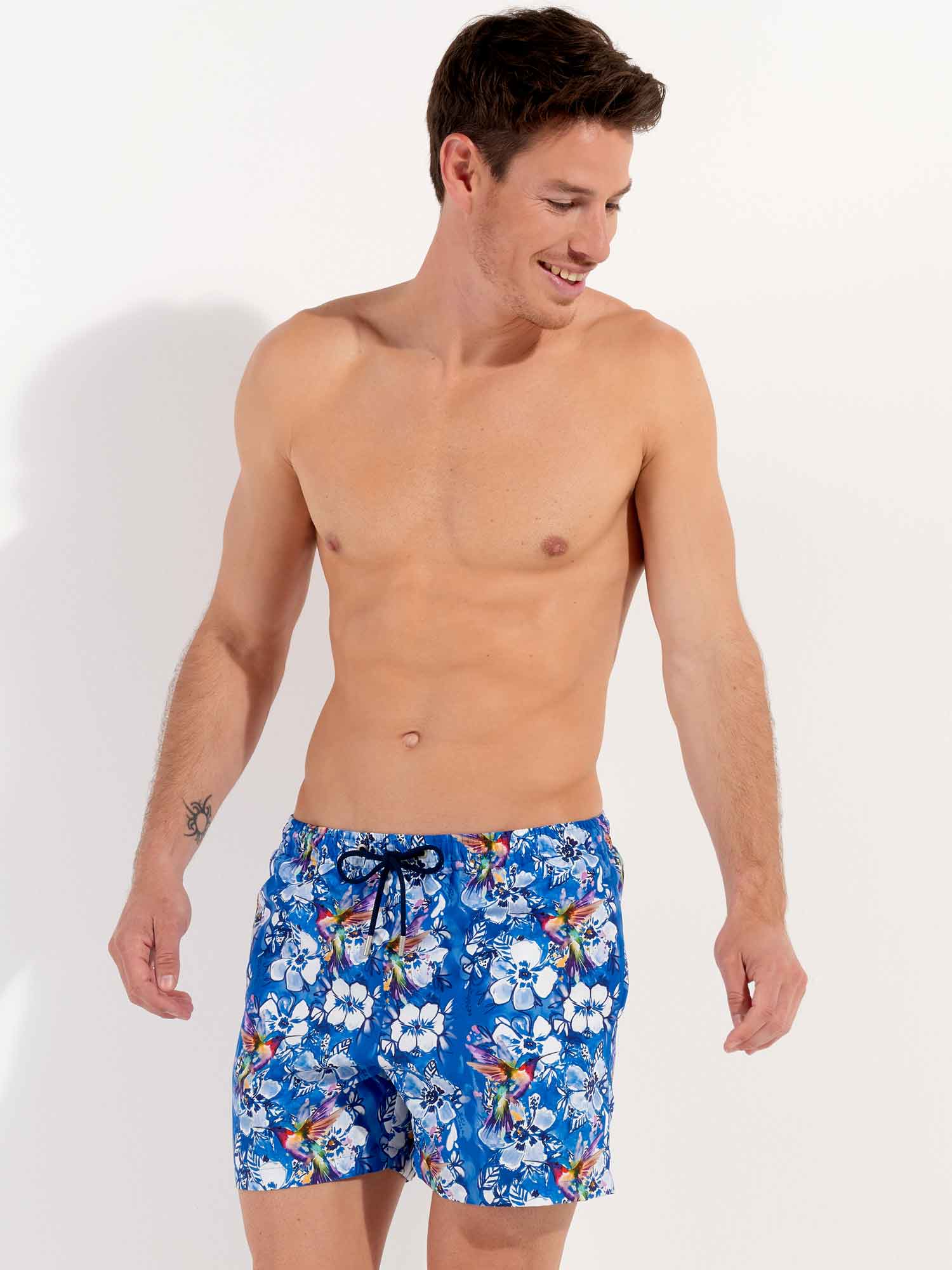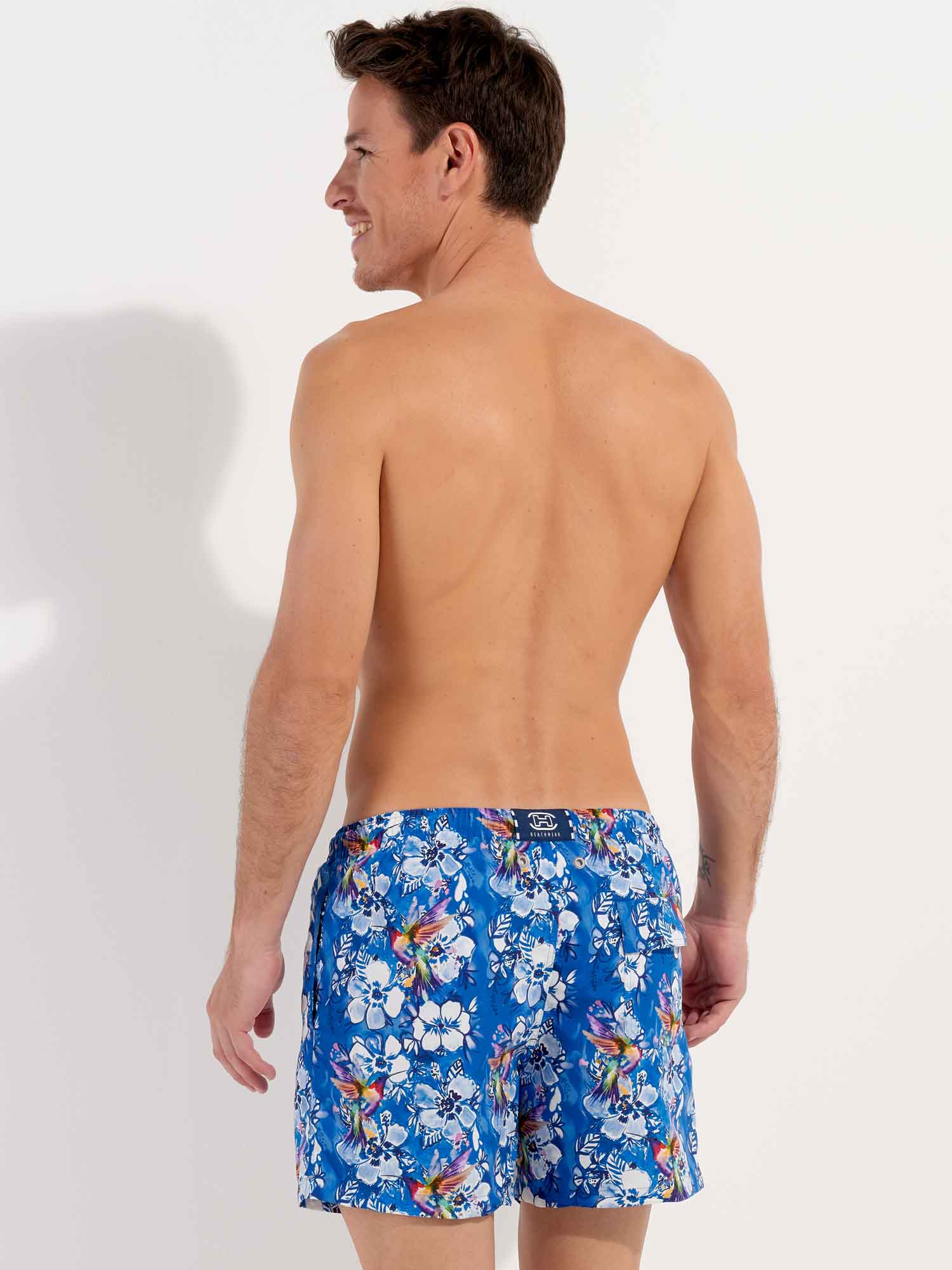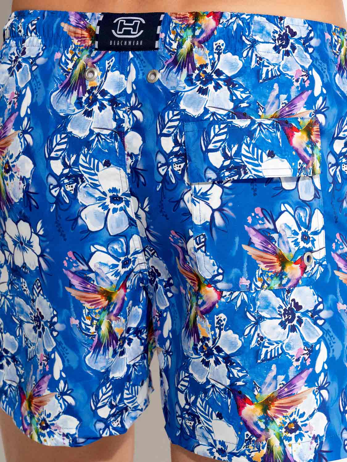 De Colibris - Beach Boxer heeft een prachtige bloemenprint met kolibries. Felgekleurde kolibries op een exotisch bloemenontwerp in blauwtinten roepen de tropische natuur van het Caribisch gebied op. De Beach Boxer heeft zakken aan de linker- en rechterzijde in de naad en bevat een binnenvoering voor extra comfort en ondersteuning. Het trekkoord in de tailleband maakt het mogelijk om de Beach Boxer perfect af te stellen op jouw maat, zodat je met vertrouwen een verfrissende duik kunt nemen. De stof is gemaakt van polyester, waardoor de Beach Boxer snel droogt. Ideaal voor op het strand of op het terras daarna.