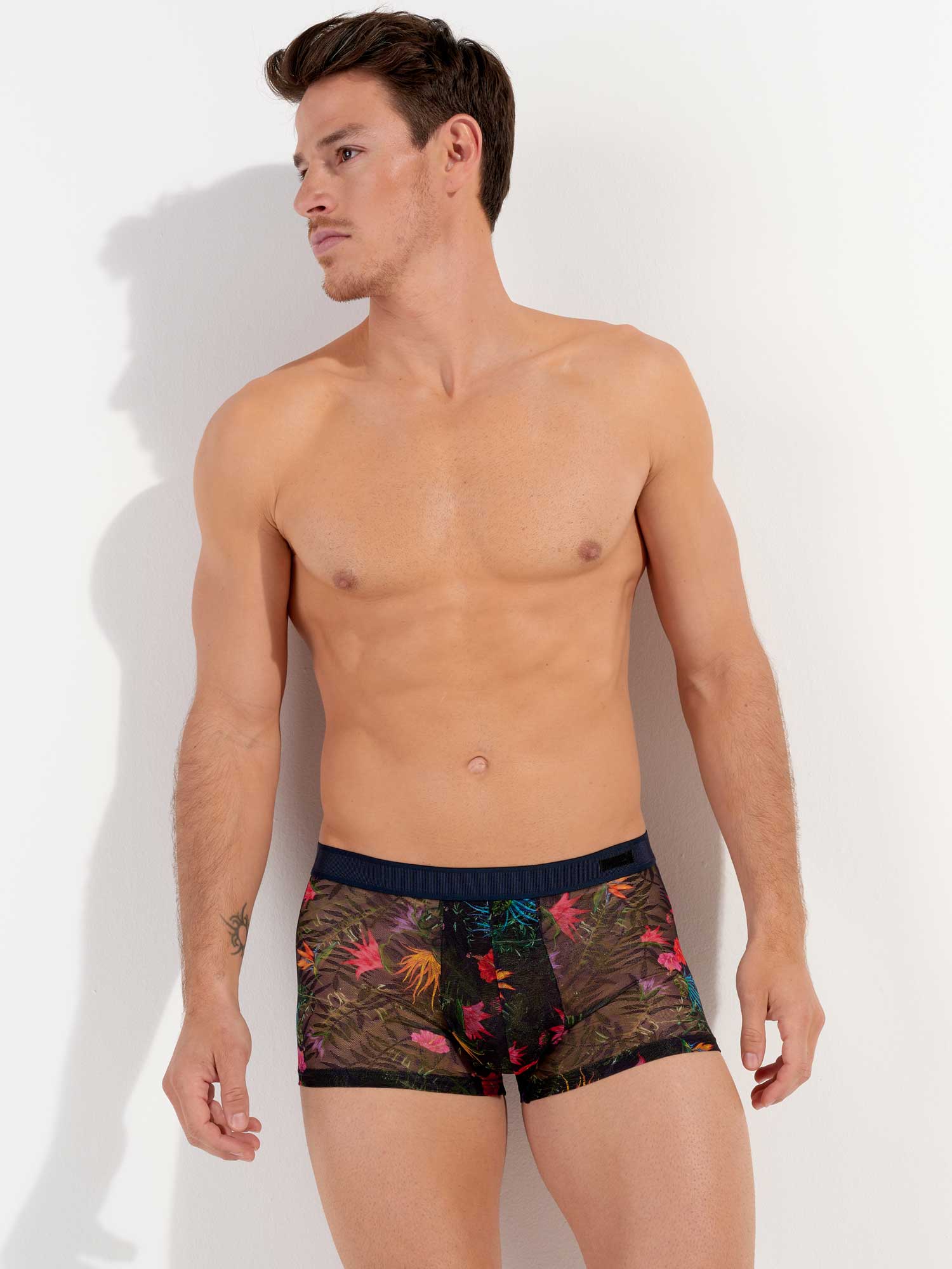 De Exotica - Boxer Brief is een uitdagend en tropisch element in de HOM Temptation lijn. De Exotica is gemaakt van een sierlijke mesh met een prachtig kleurrijk patroon met rode, gele en roe tropische plantmotieven op een achtergrond van groene bladeren. De transparante stof speelt op erotische wijze met de huid voor een sensueel effect. De pouch is gevoerd, waardoor deze niet doorschijnend is.