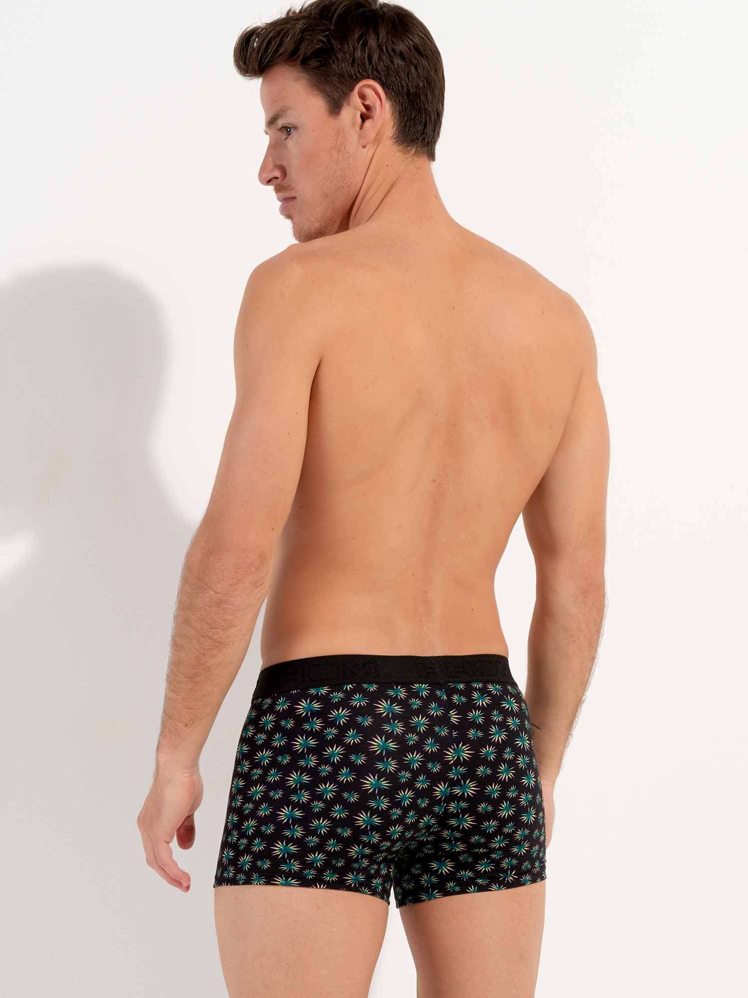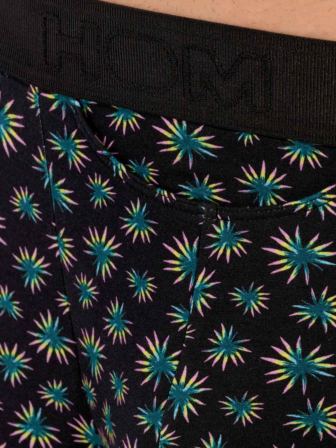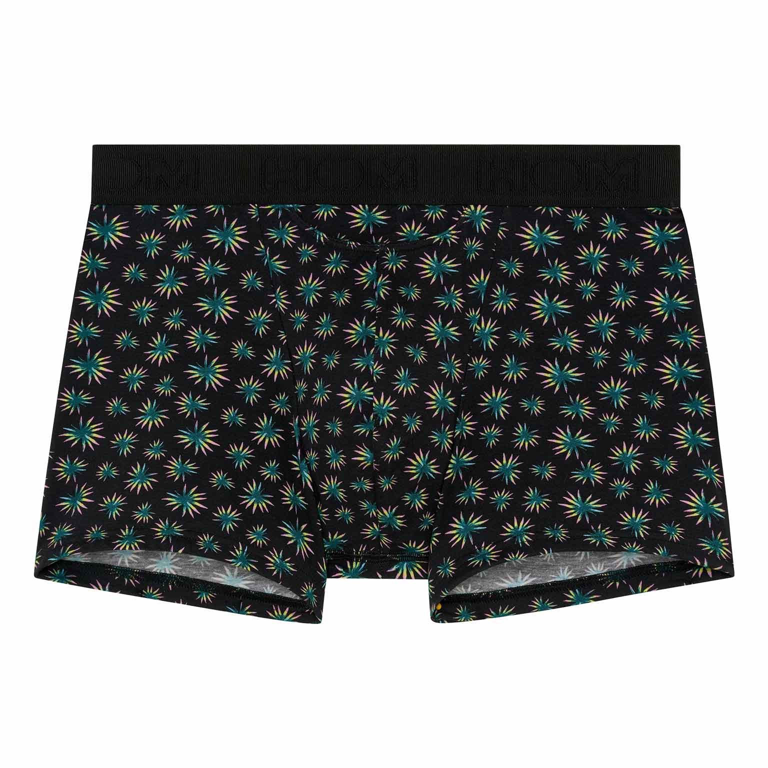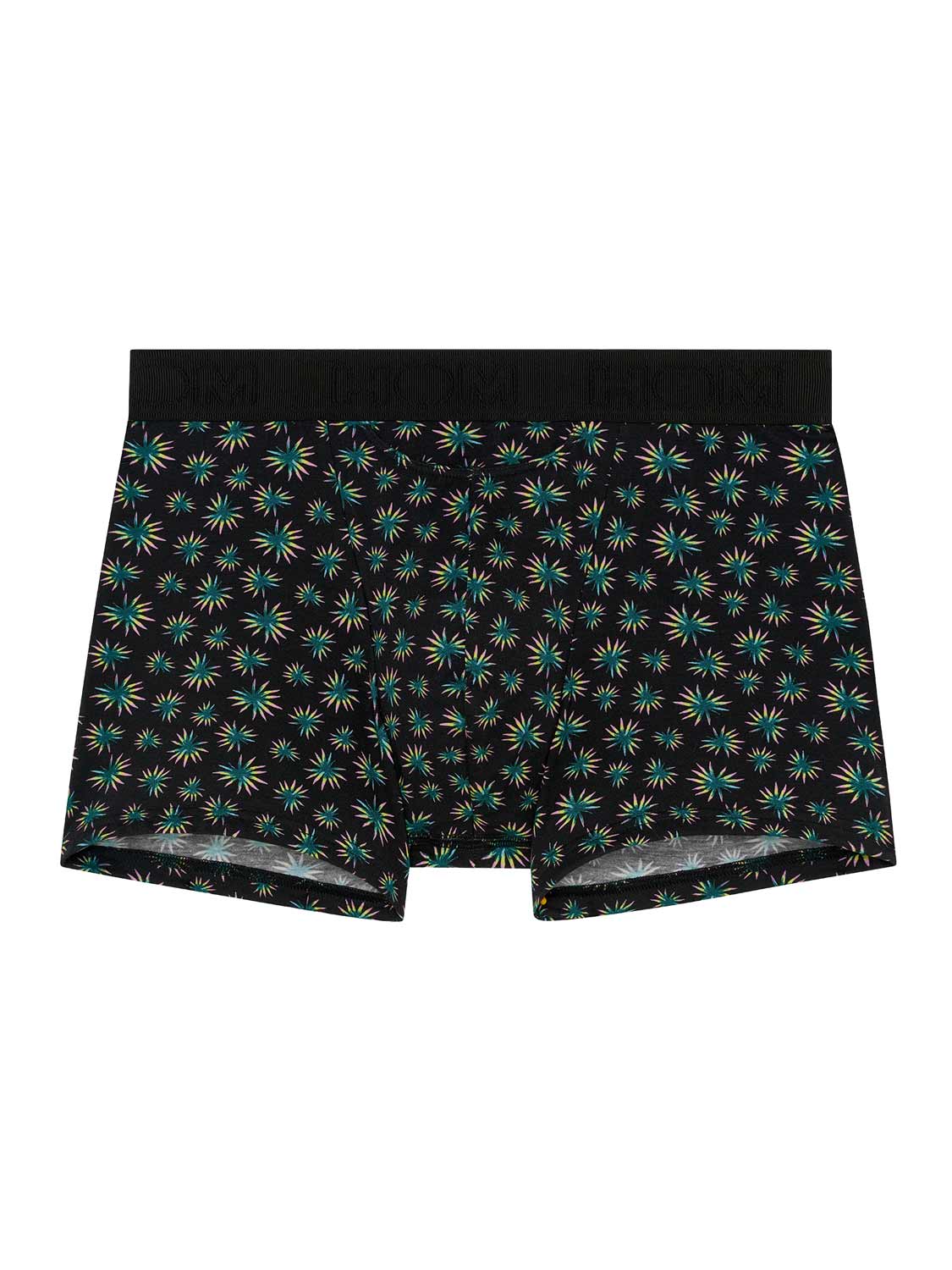 De Dizzy - HO1 Boxer Briefs is gemaakt van katoenmodal en uitgevoerd met de 'horizontale opening', de speciale gulp voor extra gemak, waar HOM bekend om staat. Deze heren boxer heeft een abstracte botanische microprint met groene, gele en roze palmbladeren op een zwarte achtergrond. De Dizzy heren boxer is uitgevoerd met een elastische heupband met een rib met daarin het HOM logo geborduurd in ton sur ton.