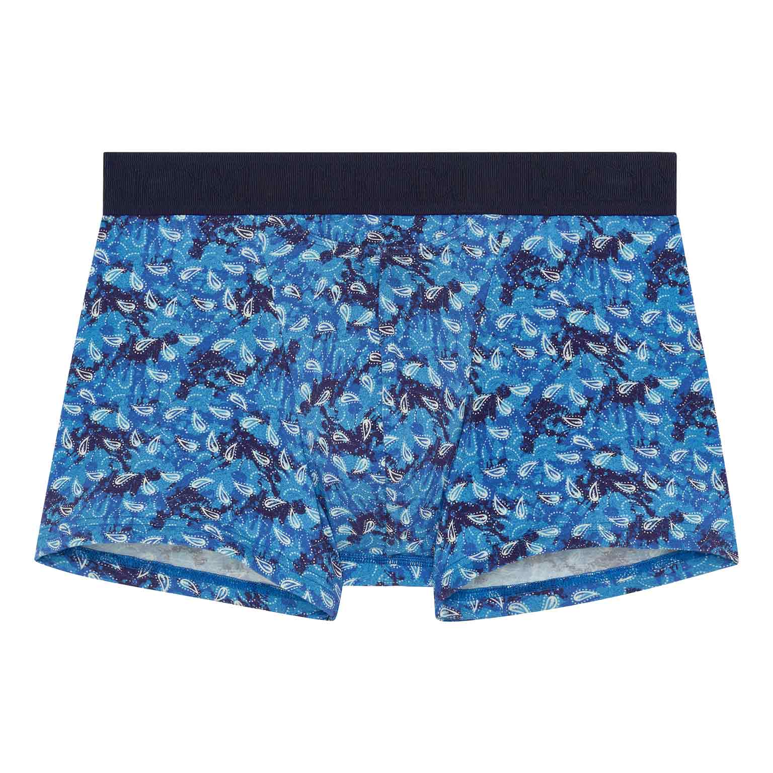 De Vibe - HO1 Boxer Briefs is gemaakt van katoenmodal en uitgevoerd met de 'horizontale opening', de speciale gulp voor extra gemak, waar HOM bekend om staat. Deze heren boxer heeft een vintage print met witte paisleys op een blauwe achtergrond. De Vibe heeft een elastische heupband in marine blauw, uitgevoerd met een rib. De heupband is voorzien van het HOM logo in ton sur ton.