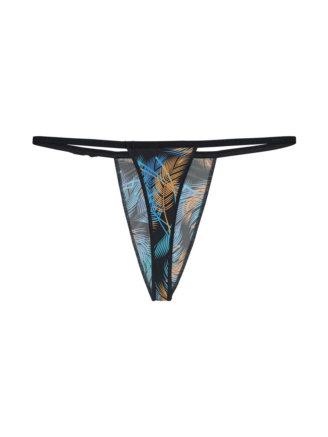 De Chico - G-string is een sensuele toevoeging aan de HOM collectie. Deze G-string is gemaakt van dezelfde stof als de reguliere Plumes string, een semi-transparante polyamide met een speelse print van grote veren in de kleuren blue en oranje op een zwarte achtergrond.