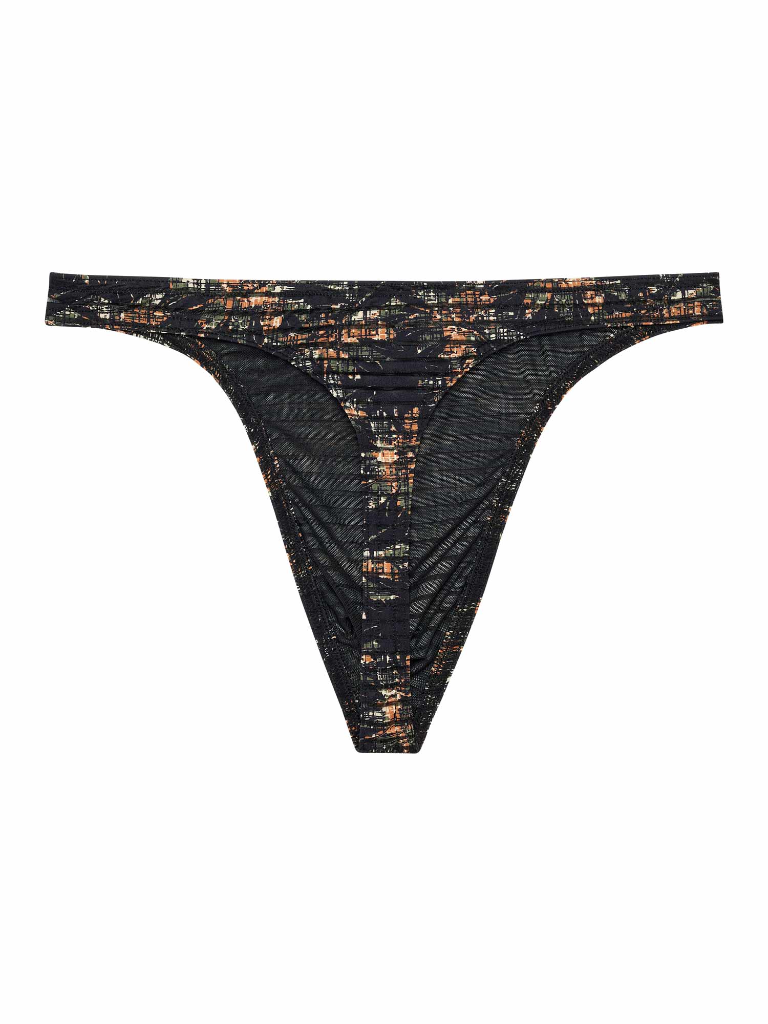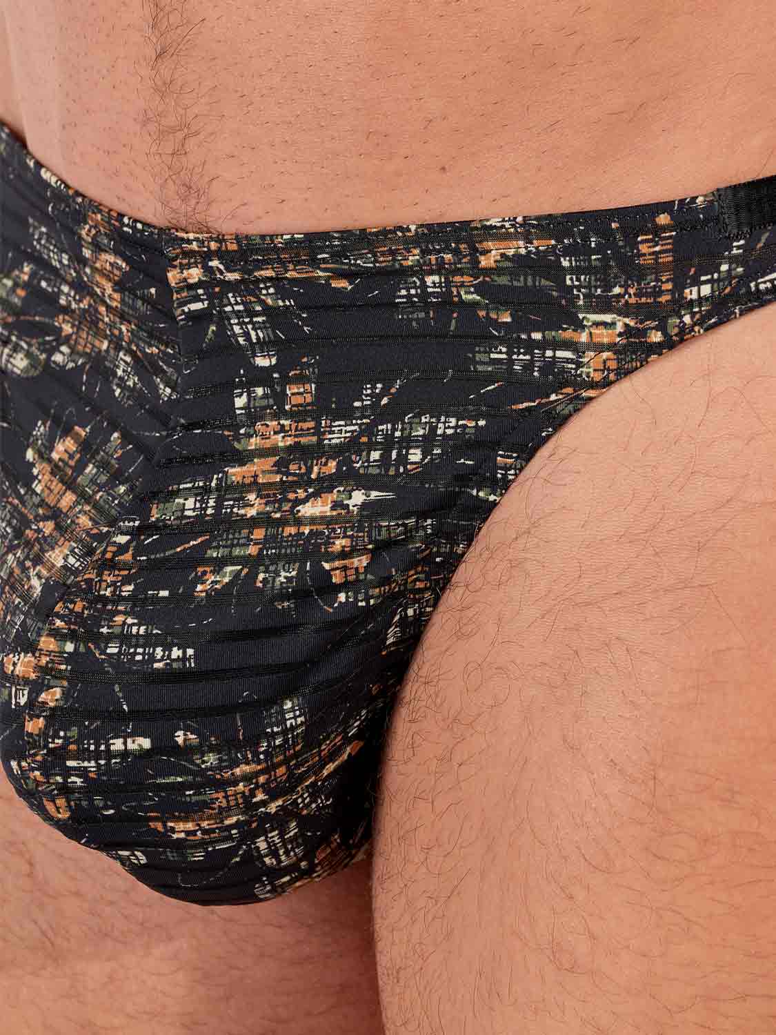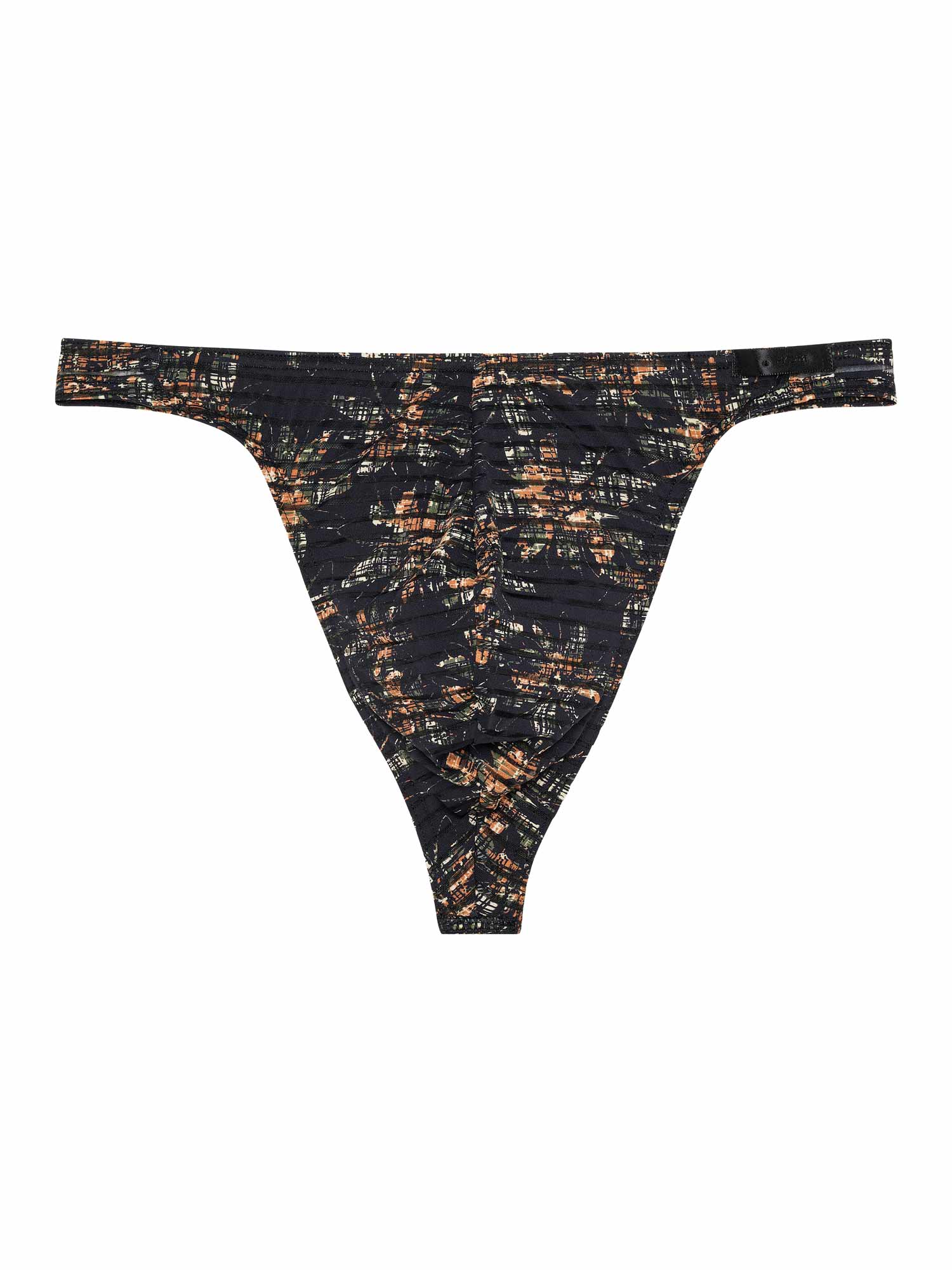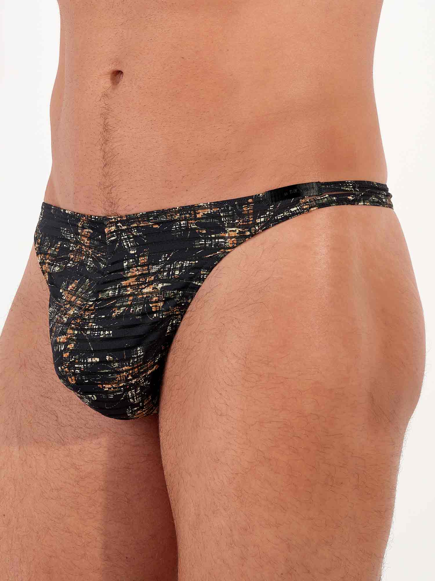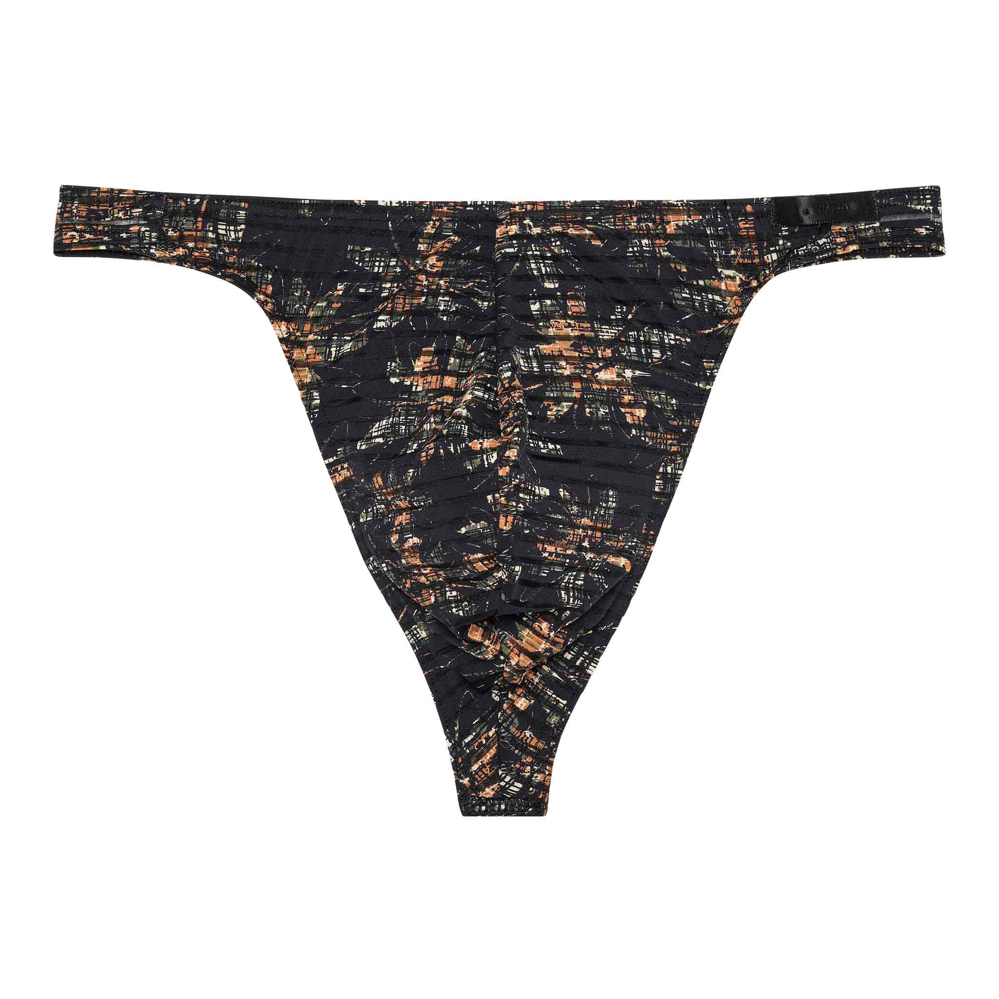 De Iraty G-string uit de HOM Temptation collectie is een gedurfd spel van lijnen en contrasten. De camouflageprint met florale elementen in mysterieus groen en oker danst over een gestreepte microvezel, waar transparantie en textuur samen een zinnenprikkelend effect creëren. De flinterdunne stof voelt fluweelzacht aan en volgt de contouren van je lichaam als een tweede huid. De gevoerde pouch zorgt voor net dat beetje extra comfort, zonder af te doen aan de verleidelijke uitstraling. Een G-string voor mannen die het lef hebben om te verleiden met finesse en flair.