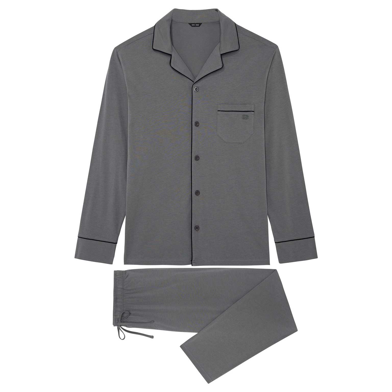 De pyjama is beschikbaar in de kleuren marine blauw en grijs.