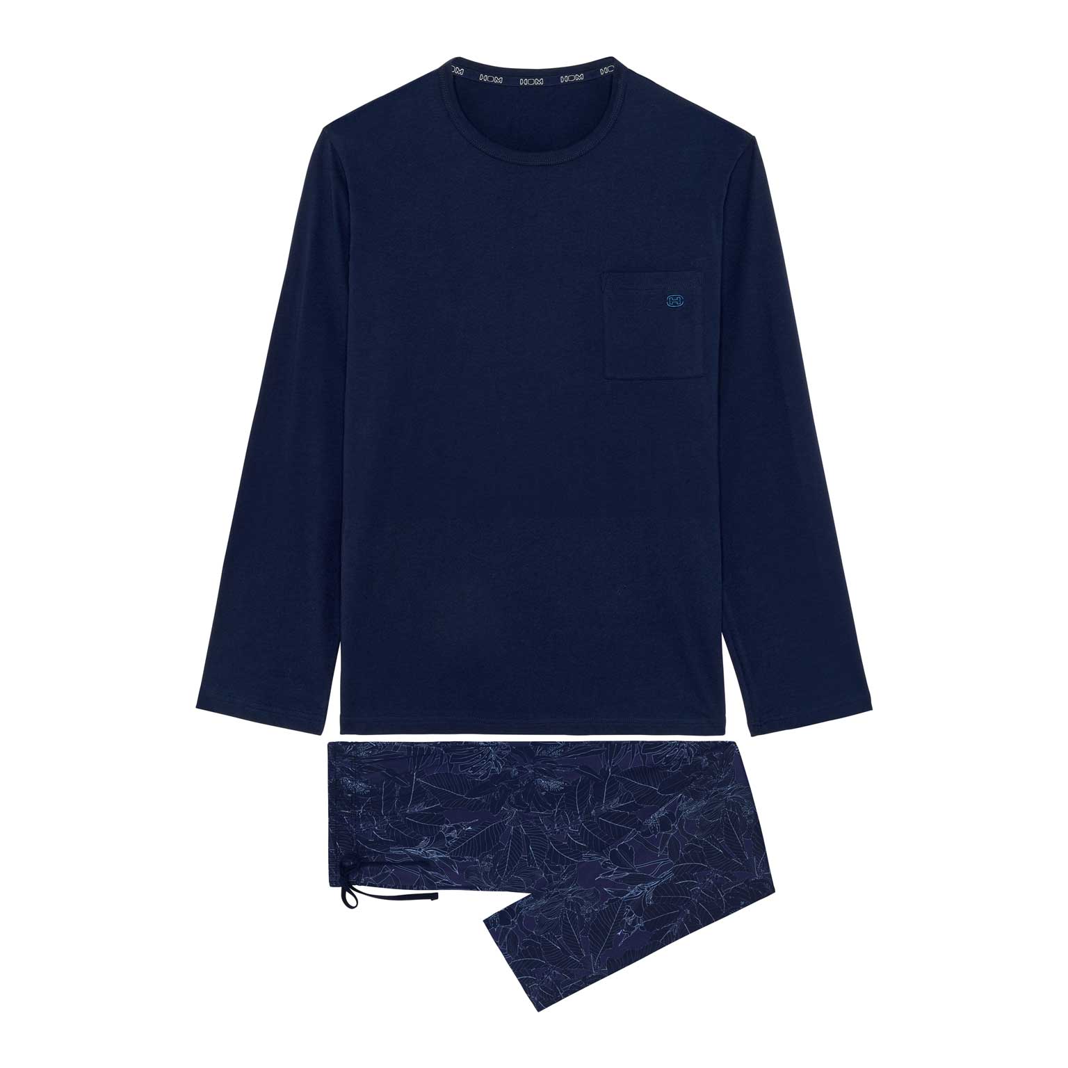 De Kenny - Long Sleepwear is gemaakt van 100% katoen uitgevoerd in een jersey. De pyjama beschikt over een effen T-shirt met lange mouwen en een ronde kraag met knopen met linksvoor een borstzakje. De lange broek heeft een print met een donkerblauw bloemenpatroon op een indigo blauwe achtergrond. De steekzakken in de zoom, aan de linker en rechterzijde zorgen voor extra gemak. Daarnaast beschikt de lange broek over een trekkoord om deze perfect op maat te brengen.
