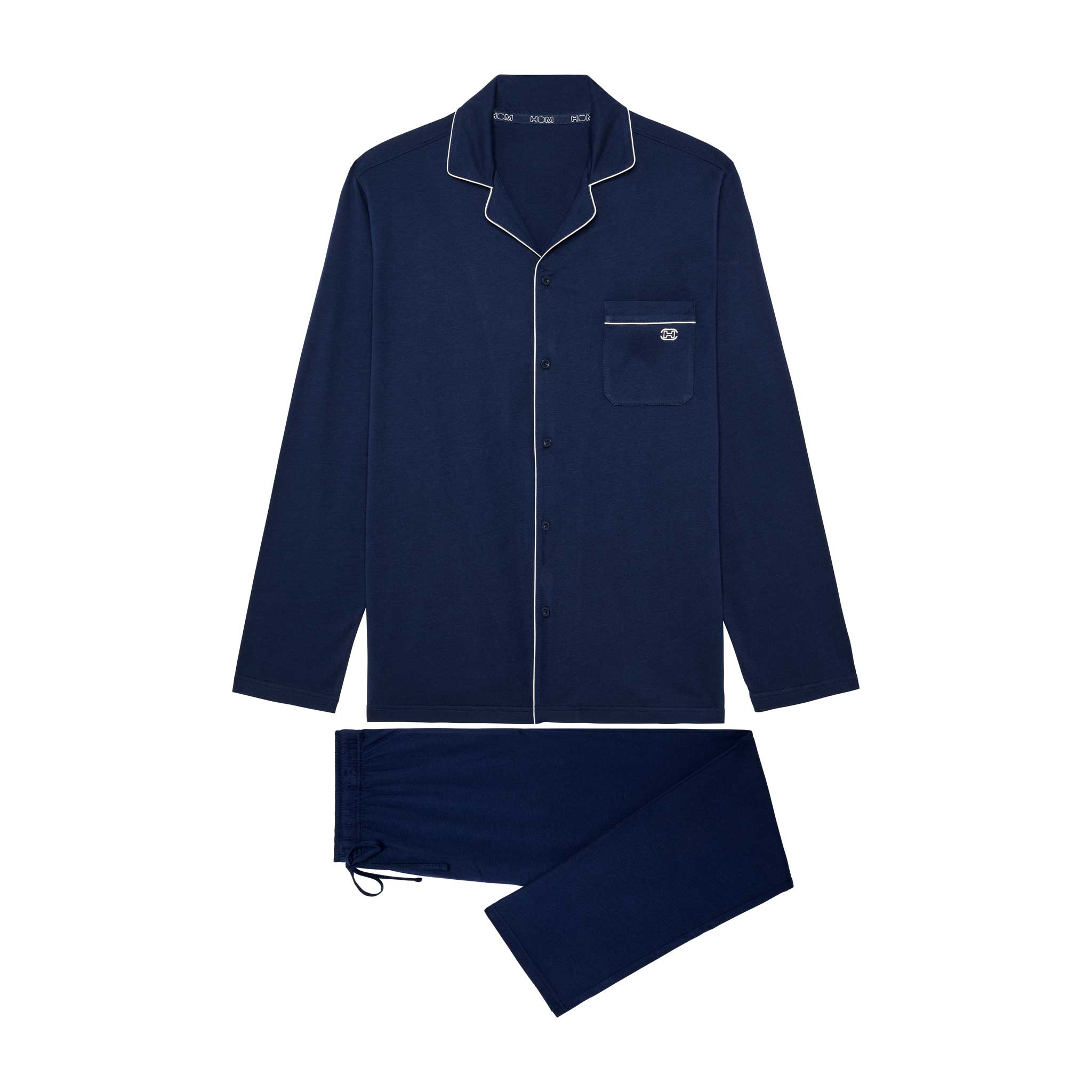 De Rafaeldoorknoop pyjama is een stijlvolle klassieker voor de moderne man die waarde hecht aan comfort én uitstraling. Deze lange heren pyjama is gemaakt van een zachte katoen-modal mix. Daardoor heeft deze pyjama een ademend gevoel en een soepele fit. De wit afgezette paspel geeft een elegante touch, terwijl de klassieke kraag, gegraveerde HOM-knopen en borstzak met subtiele geborduurde branding het geheel verfijnen. Of je nu een rustige avond thuis beleeft of ontspannen wakker wordt: met de Rafael slaap je comfortabel in stijl.