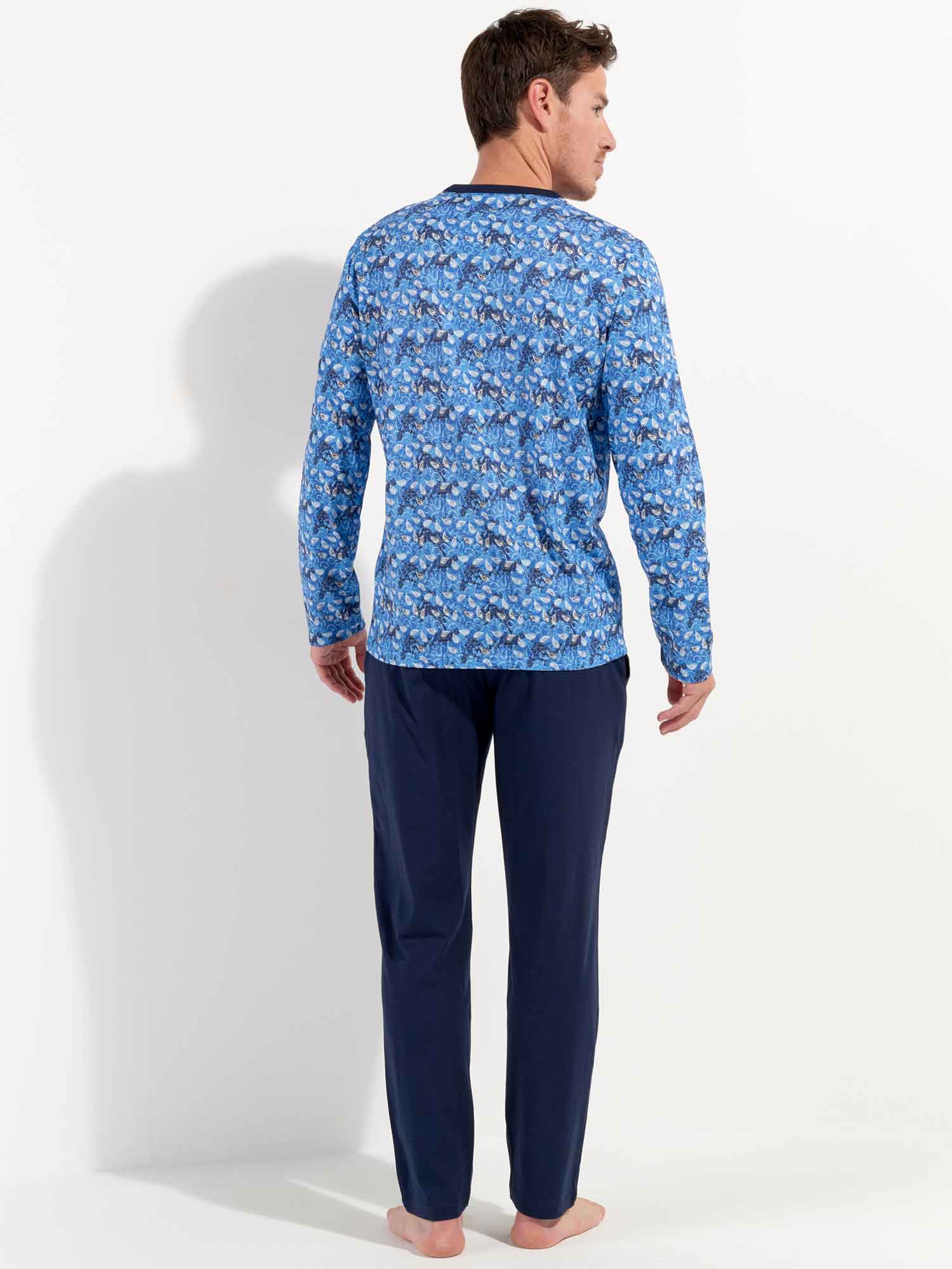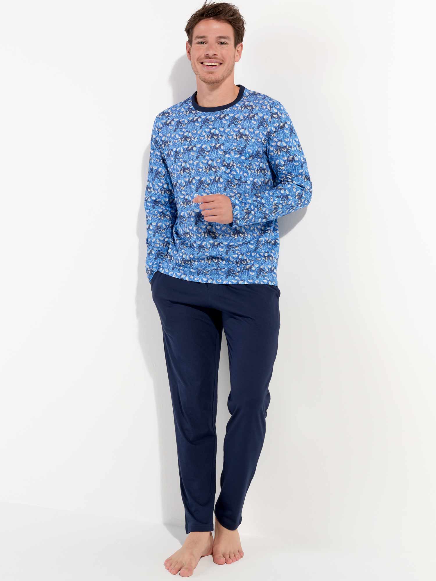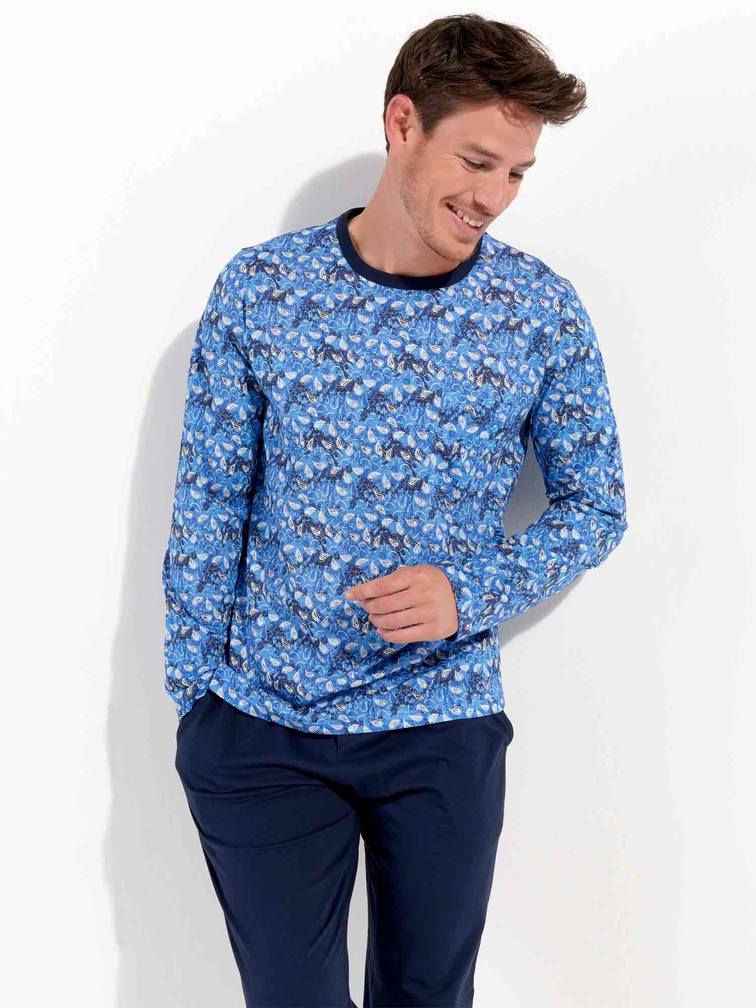 De Vibe - Long Sleepwear is gemaakt van 100% katoen uitgevoerd in een jersey. De pyjama beschikt over een T-shirt met lange mouwen en een ronde kraag. Het shirt heeft een speelse print met witte paisley motieven op een abstracte vintage achtergrond in blauwtinten. De lange broek is effen uitgevoerd met steekzakken in de zoom, aan de linker en rechterzijde. Daarnaast beschikt de lange broek over een trekkoord in de heupband om de broek perfect op maat te brengen.