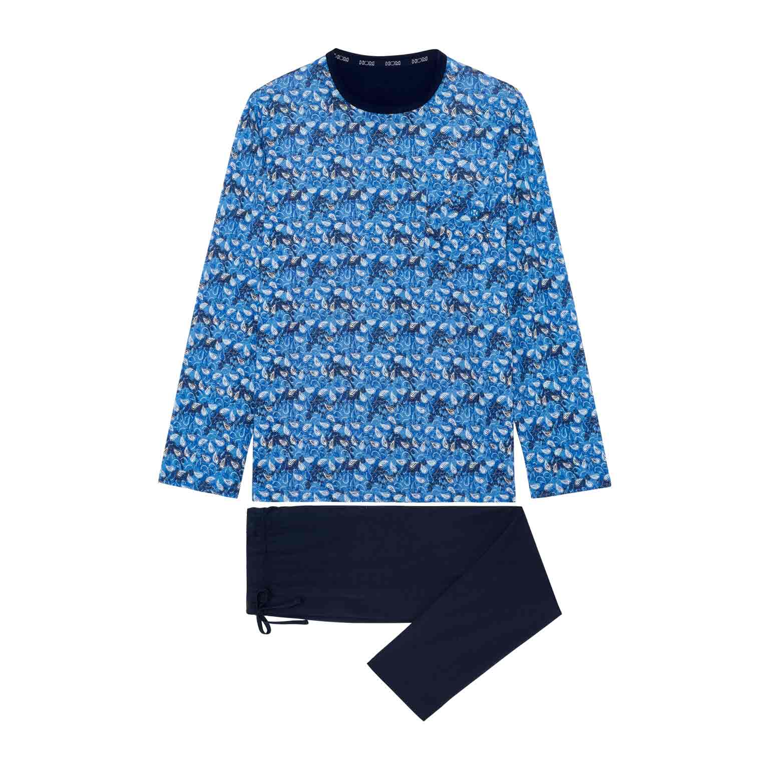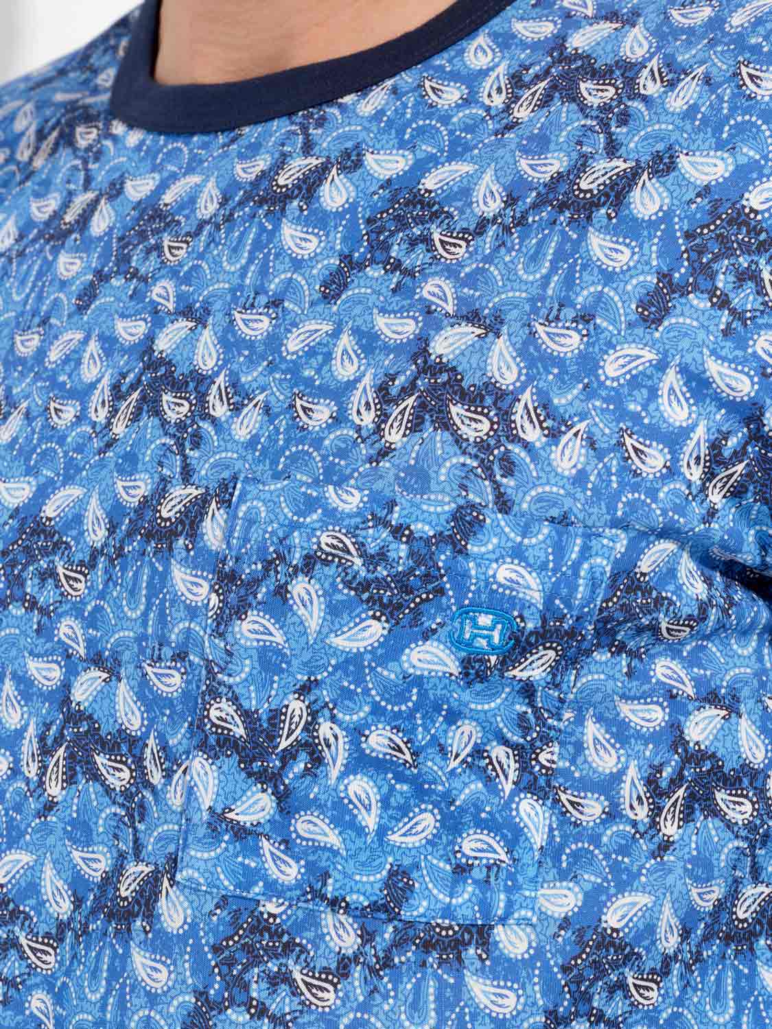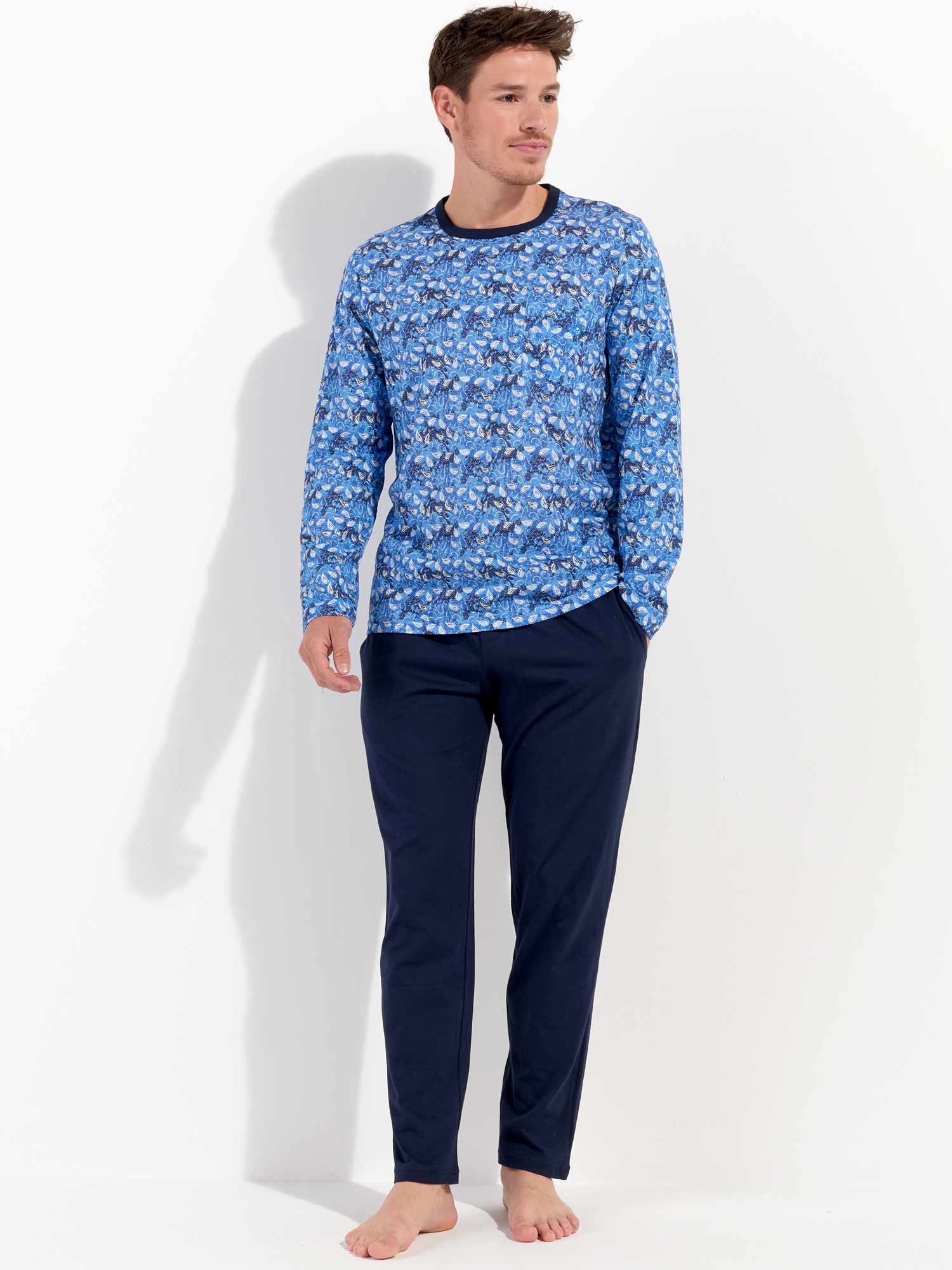 De Vibe - Long Sleepwear is gemaakt van 100% katoen uitgevoerd in een jersey. De pyjama beschikt over een T-shirt met lange mouwen en een ronde kraag. Het shirt heeft een speelse print met witte paisley motieven op een abstracte vintage achtergrond in blauwtinten. De lange broek is effen uitgevoerd met steekzakken in de zoom, aan de linker en rechterzijde. Daarnaast beschikt de lange broek over een trekkoord in de heupband om de broek perfect op maat te brengen.
