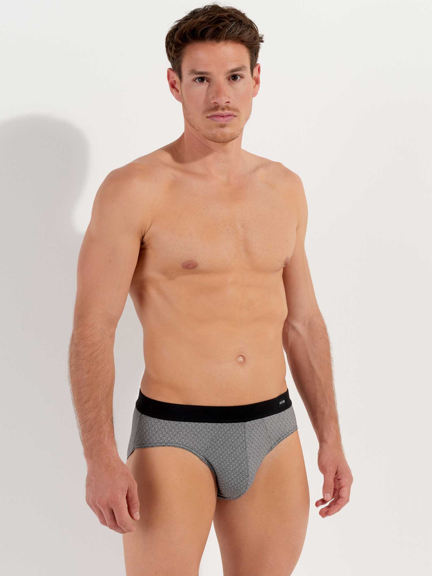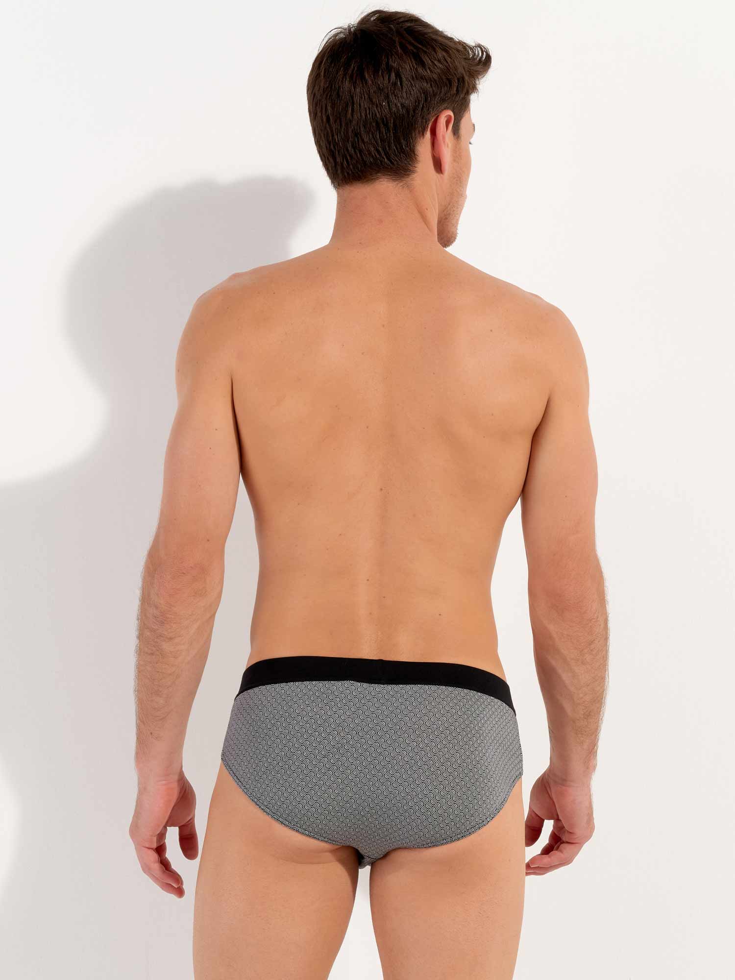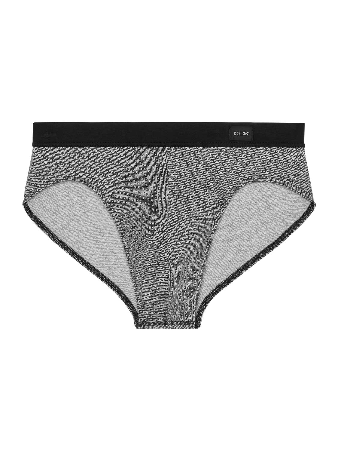 De Herbie - Comfort Mini Briefs is gemaakt van hoogwaardig katoenmodal en uitgevoerd met een comfort heupband, waarbij de stof is doorgetrokken en naar binnen is geslagen over de elastische band voor extra comfort. Deze heren mini slip beschikt over een print met diagonale geometrische patronen met illustraties van zwarte en witte golven. Linksvoor op de comfortband is een klein label van HOM geplaatst.