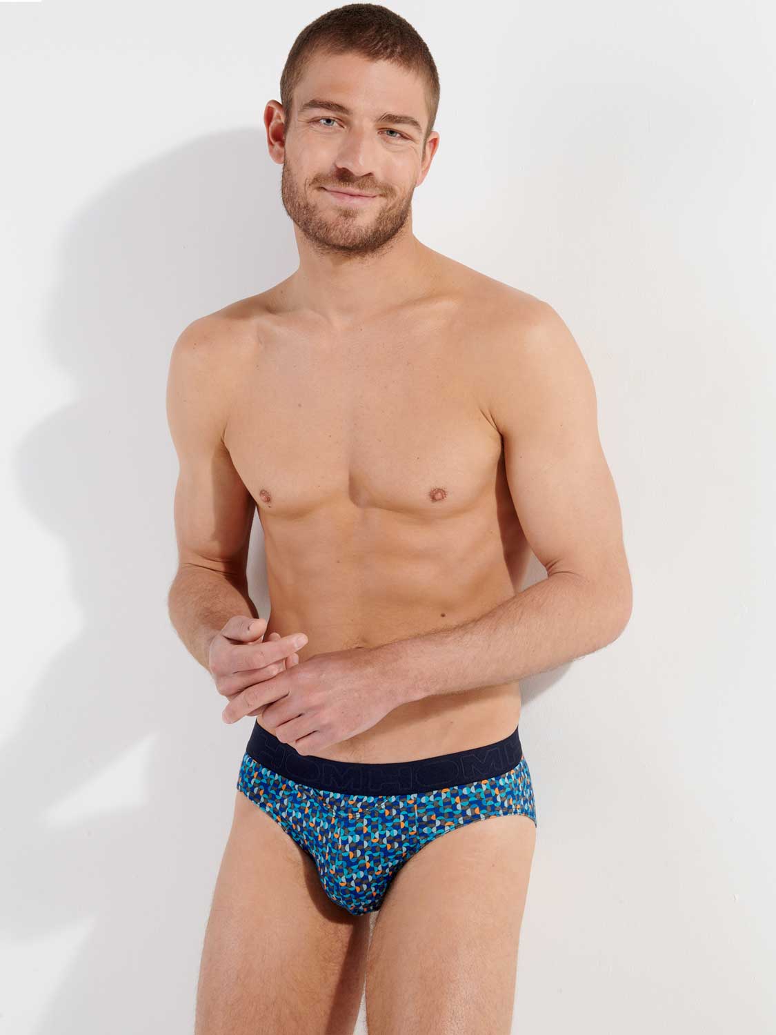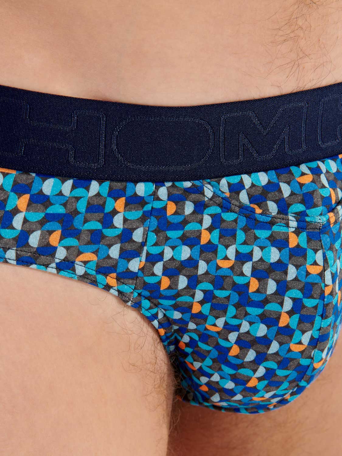 De Ralphy - HO1 Mini Briefs is gemaakt van hoogwaardig katoenmodal en uitgevoerd met de 'horizontale opening', de speciale gulp voor extra gemak, waar HOM bekend om staat. Deze heren slip is uitgevoerd met een prachtige print in blauw, grijs met oranje accenten op een marine blauwe achtergrond. De Ralphy heeft een elastische heupband met daarop het HOM Logo.