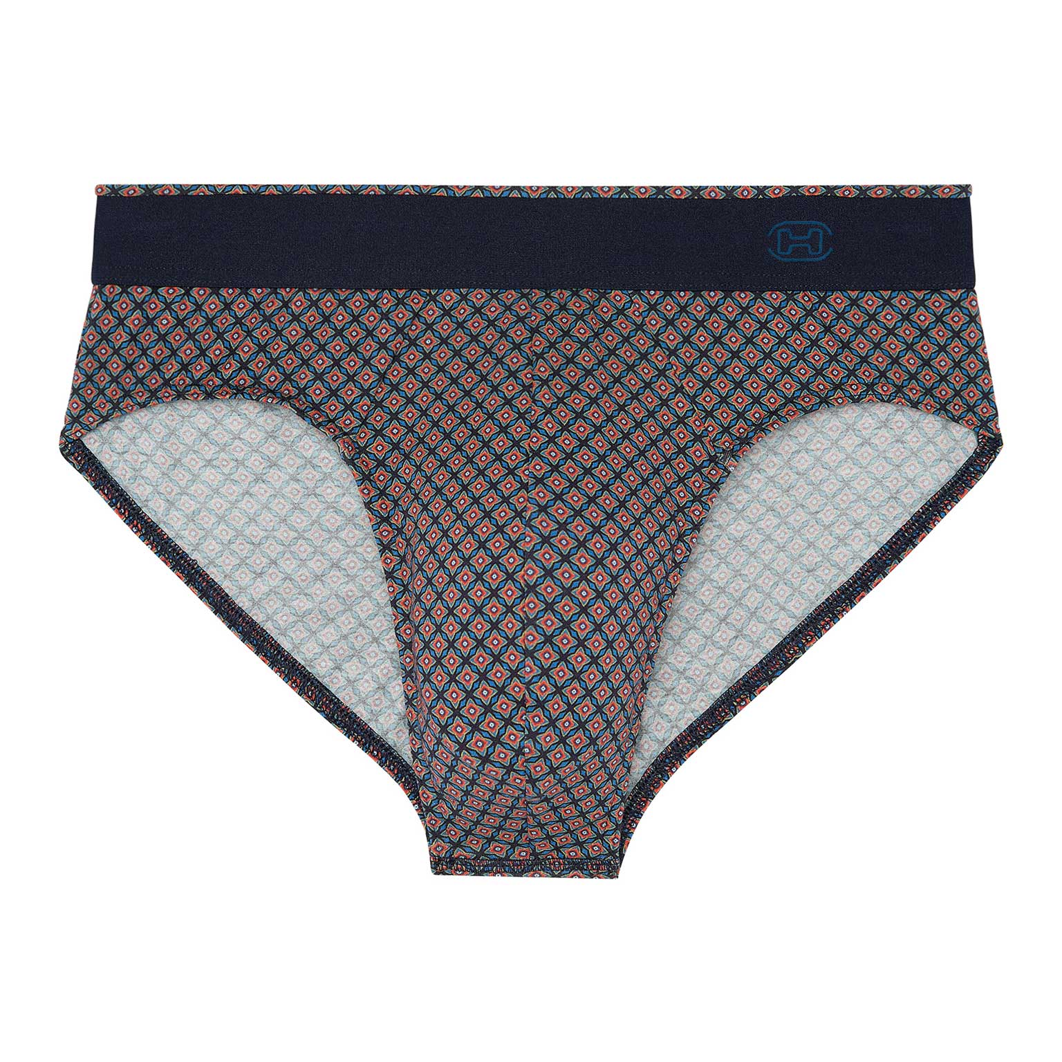 De Jordan - Comfort Mini Briefs is gemaakt van hoogwaardig katoenmodal, een natuurlijke stof wat heerlijk zacht aanvoelt. Deze heren slip heeft een opvallende print met een ruitpatroon in warme tinten op een marine blauwe achtergrond. De heren slip is uitgevoerd met een comfort heupband, waarbij de stof over de elastische heupband is getrokken voor extra comfort en een modieuze look. De band is effen uitgevoerd in marine blauw met daarop linksvoor het HOM logo geborduurd.