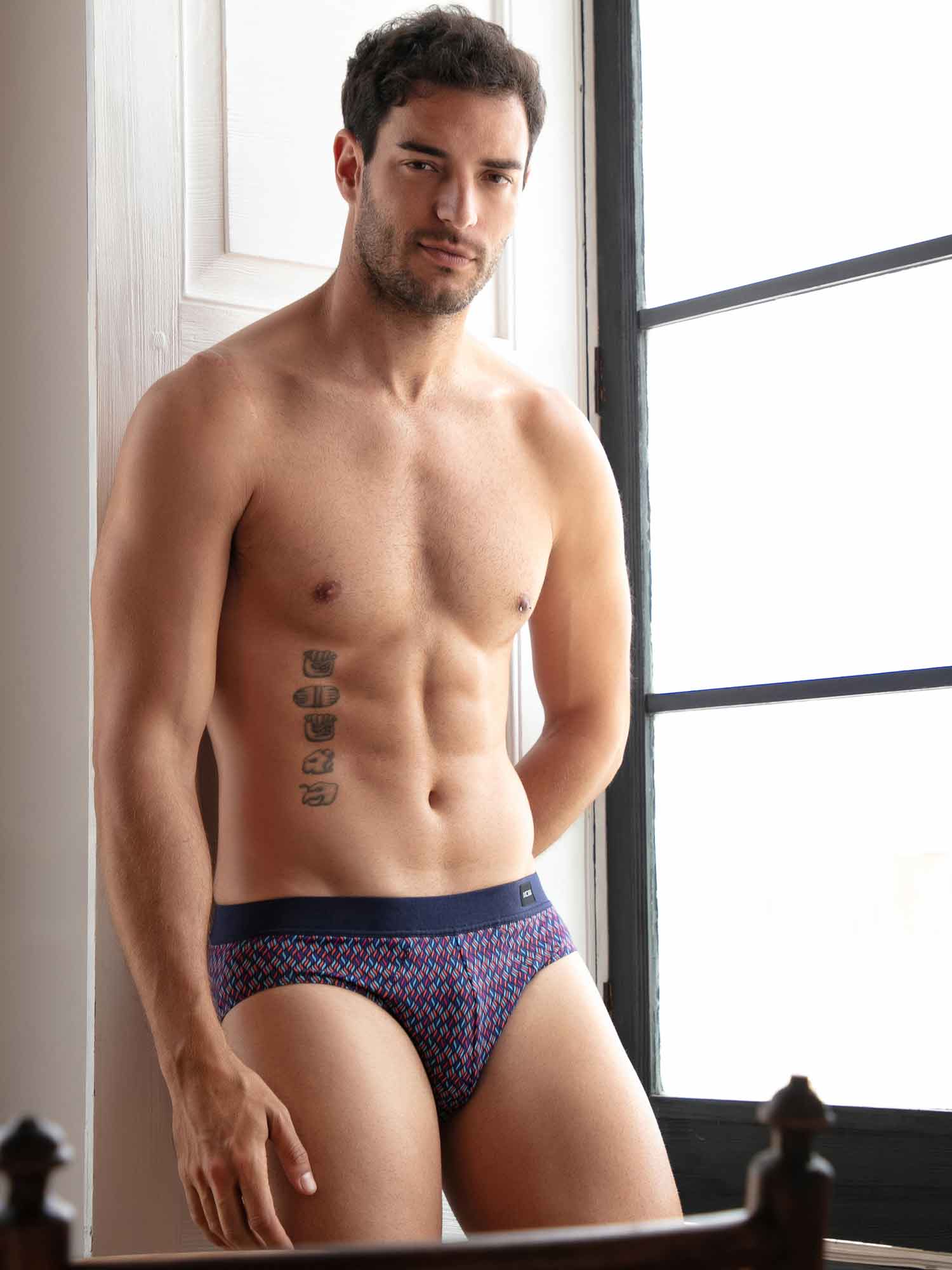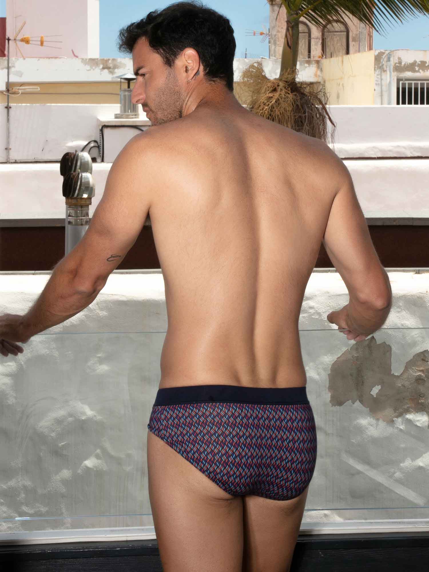 De Ocean Drive Comfort Mini Briefs brengen Miami nights tot leven met een levendig patroon dat oogt als meerkleurige vlammen op een midnight blue achtergrond, alsof stadslichten weerspiegelen op de boulevard. De moderne mini brief snit zit laag op de heupen met een hoger uitgesneden beenlijn voor bewegingsvrijheid en een strakke, sportieve look. Afgewerkt met een comfort tailleband die volledig met stof is overtrokken, zodat het elastiek de huid niet raakt, voor een zachter en luxer gevoel.