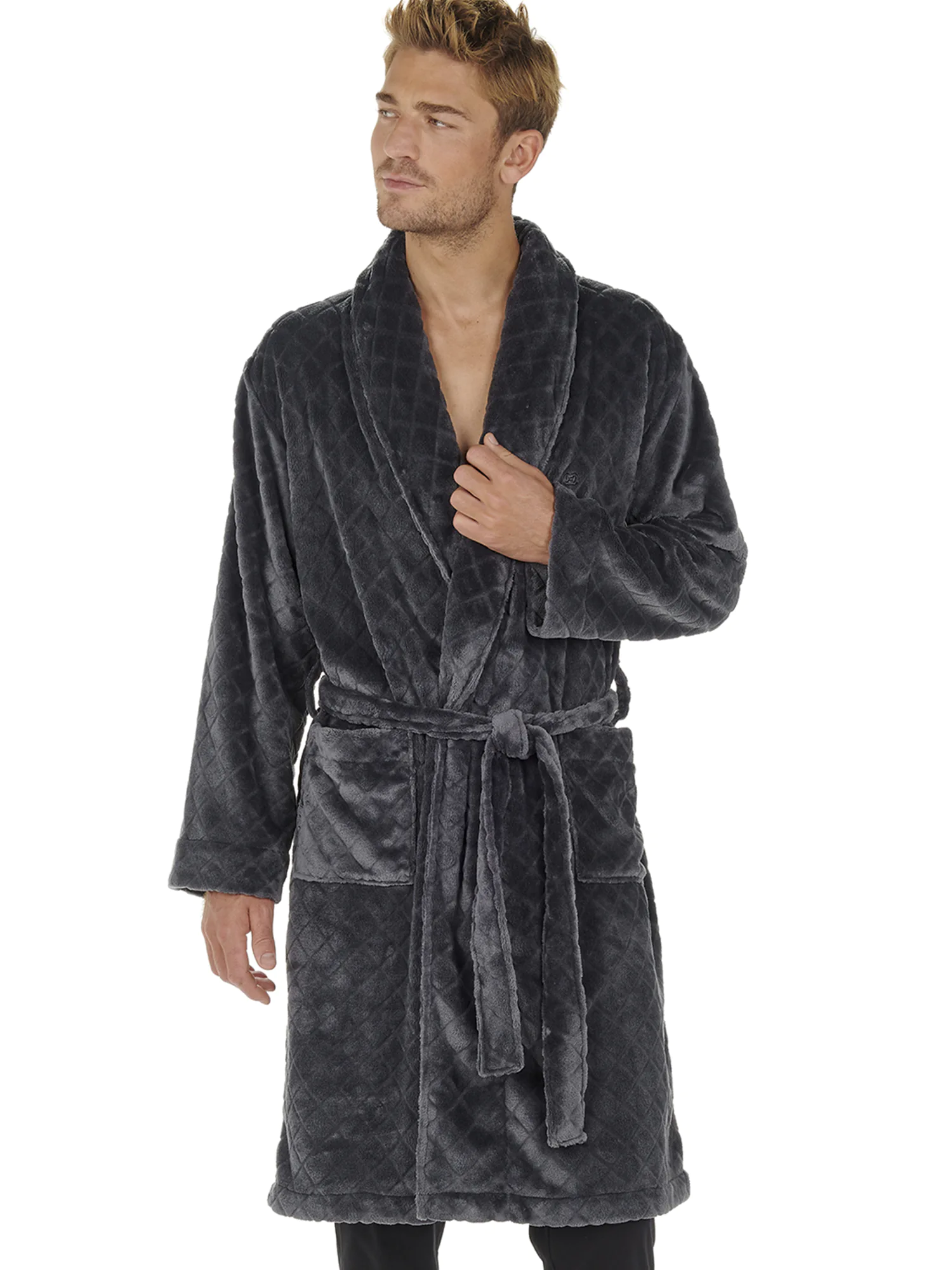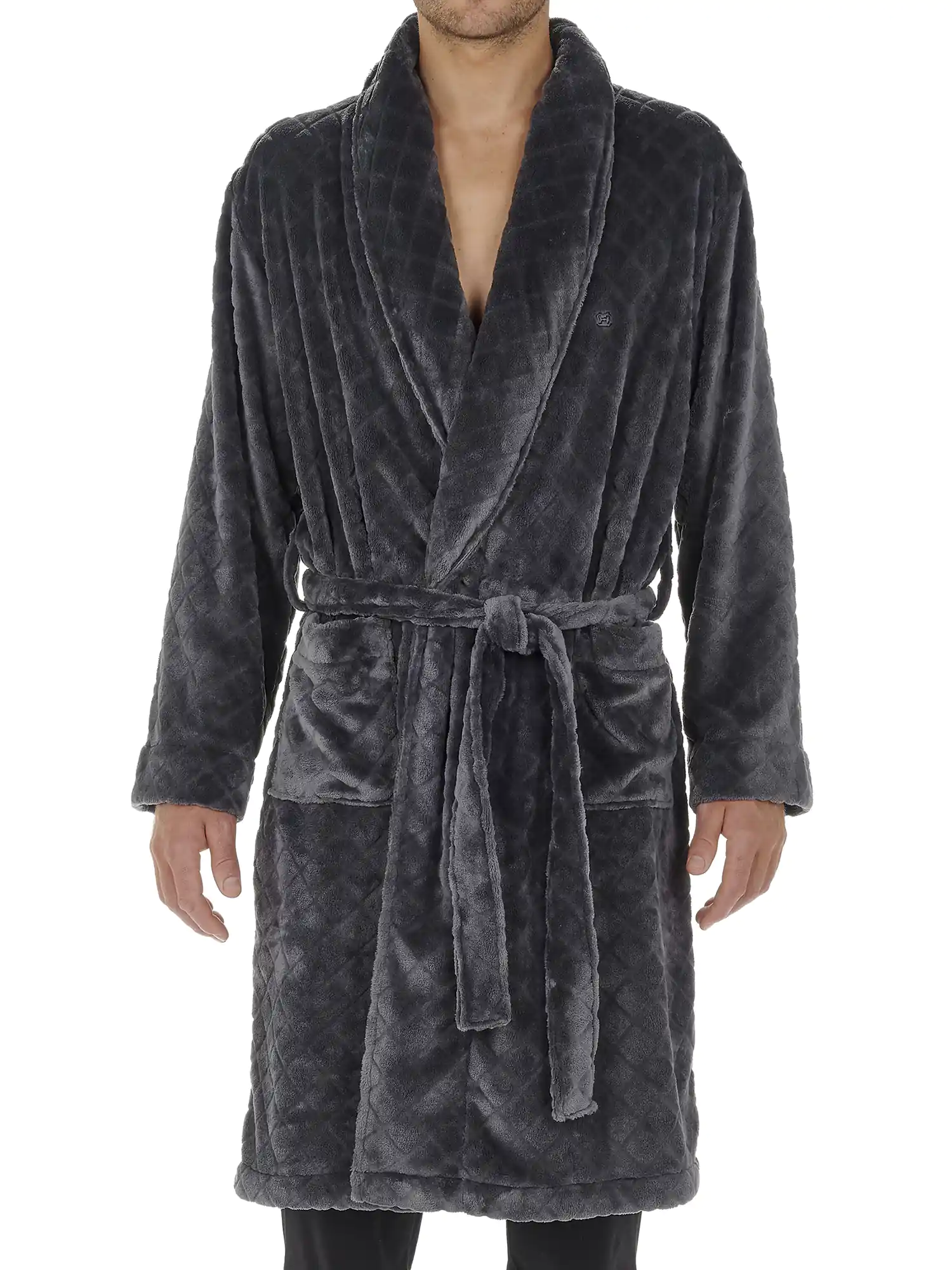 De Monaco is een kamerjas die lang is uitgevoerd en gemaakt van dik, zacht fleece materiaal van polyester, wat uitstekend de temperatuur reguleert en je lekker warm houdt. De kamerjas heeft een chique uitstraling door de ingeschoren lijnen voor een prachtig reliëf in de grijze stof. Met de bijpassende riem kun je de kamerjas sluiten.