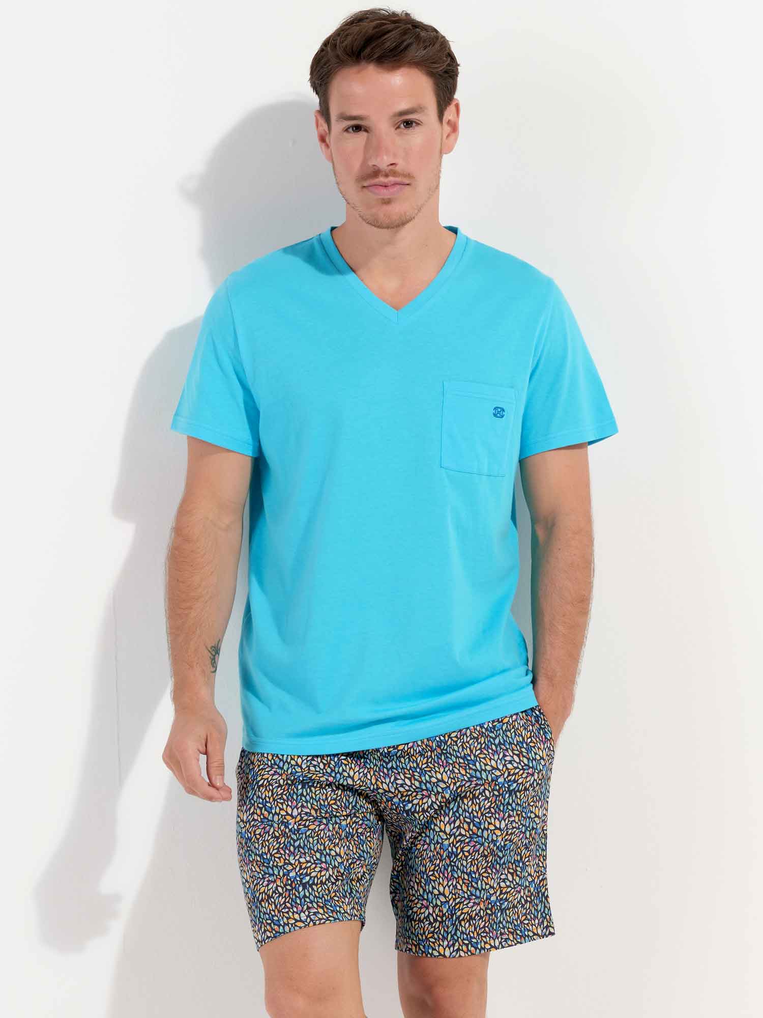 De Buddy - Shortama heeft een speels en kleurrijk karakter en is gemaakt van 100% katoen, uitgevoerd in een jersey. De pyjama beschikt over een effen T-shirt met korte mouwen uitgevoerd in lichtblauw en heeft een V-hals. De korte broek heeft een meerkleurige bladerprint, ingelegd met geometrische motieven op een marine blauwe achtergrond. De pyjama short heeft steekzakken in de zoom, aan de linker en rechterzijde en beschikt over een trekkoord in de heupband om deze perfect op maat te brengen.