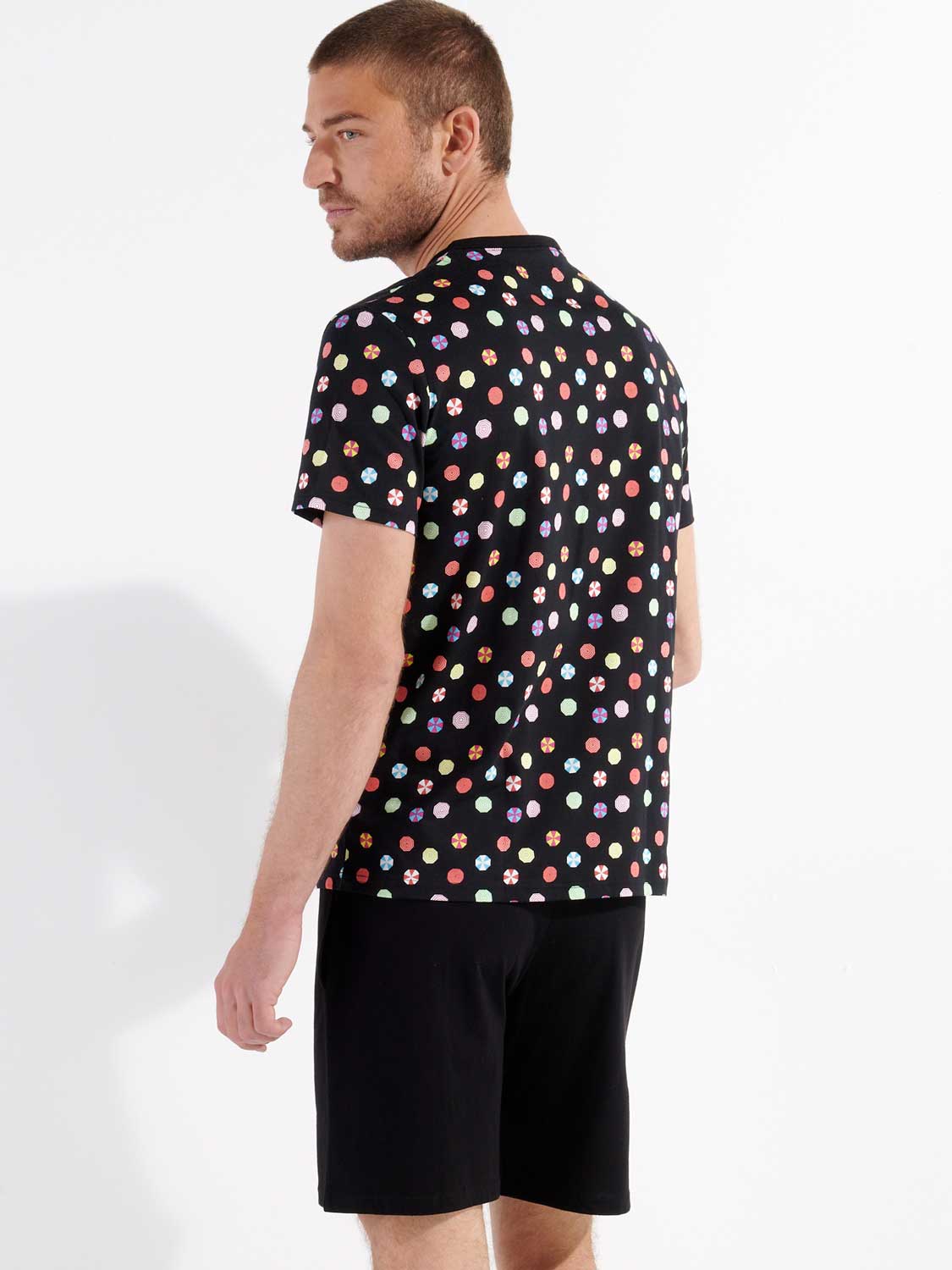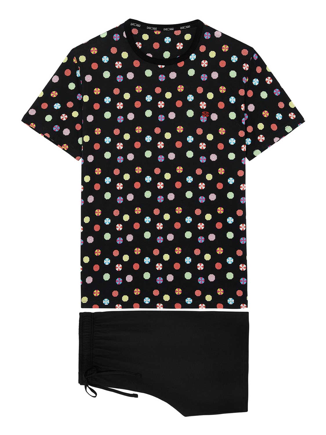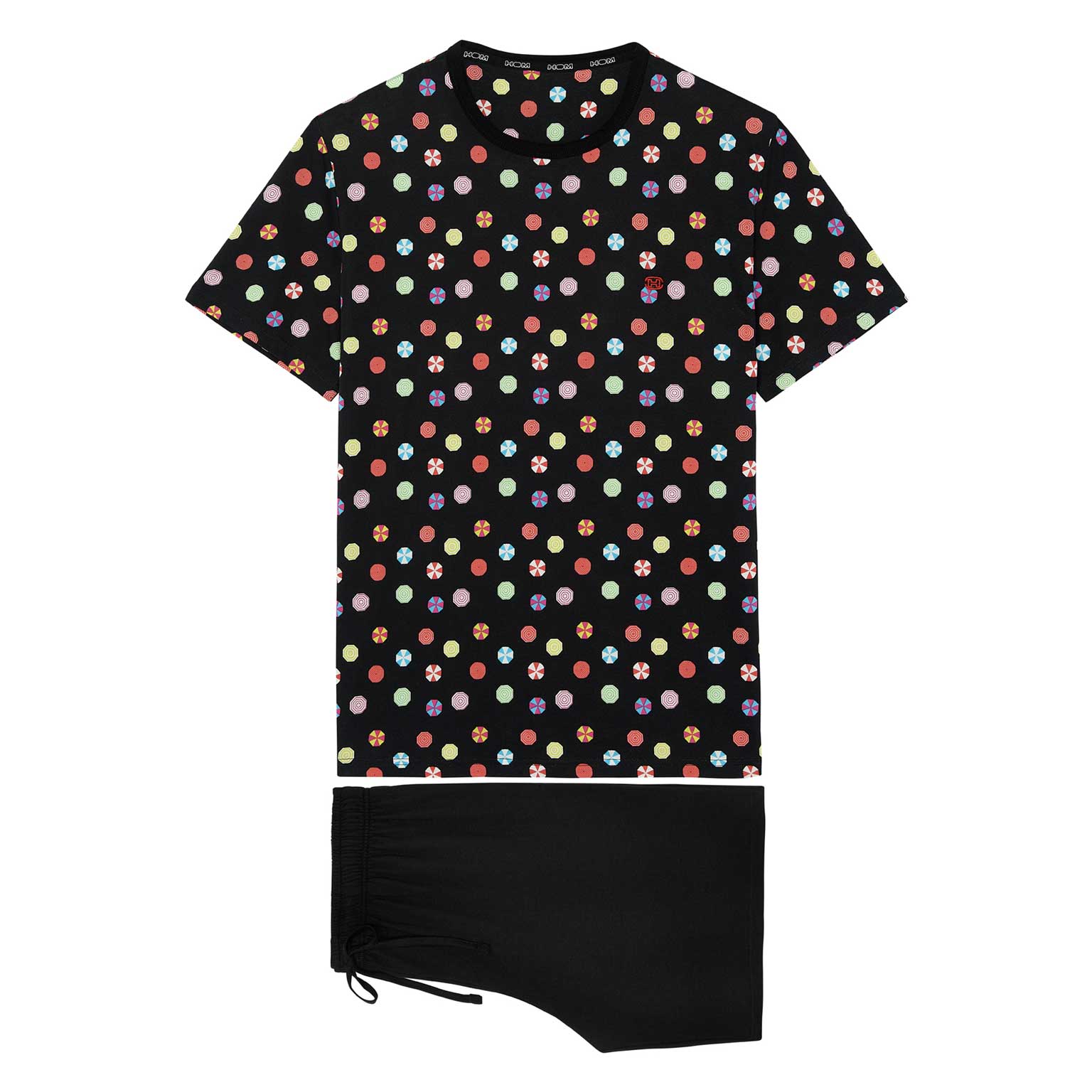 De Fabian - Short Sleepwear is gemaakt van 100% katoen uitgevoerd in een jersey. Deze shortama beschikt over een T-shirt met een speelse kleurrijke print met parasols op een zwarte achtergrond. Het shirt heeft korte met mouwen en een ronde neklijn met HOM tape aan de binnenzijde van de neklijn. Het short is in effen zwart uitgevoerd met steekzakken aan de linker en rechterzijde in de zoom. In de heupband bevindt zich een trekkoord om het short perfect op maat te brengen.
