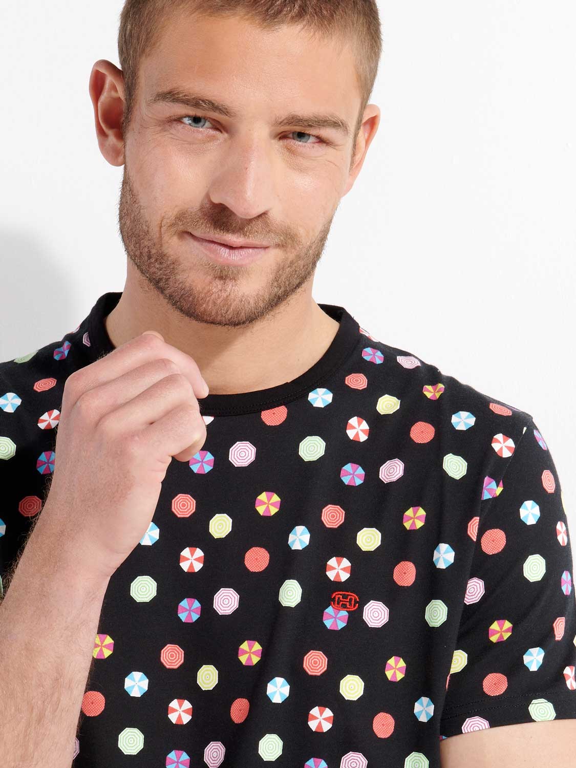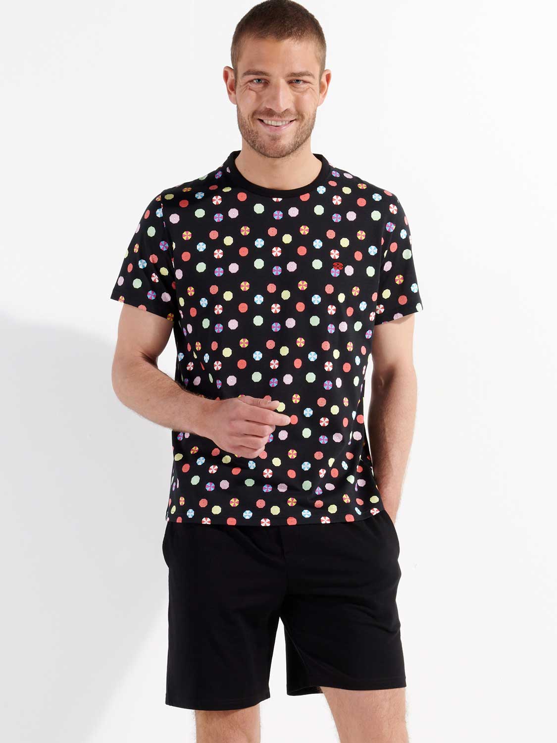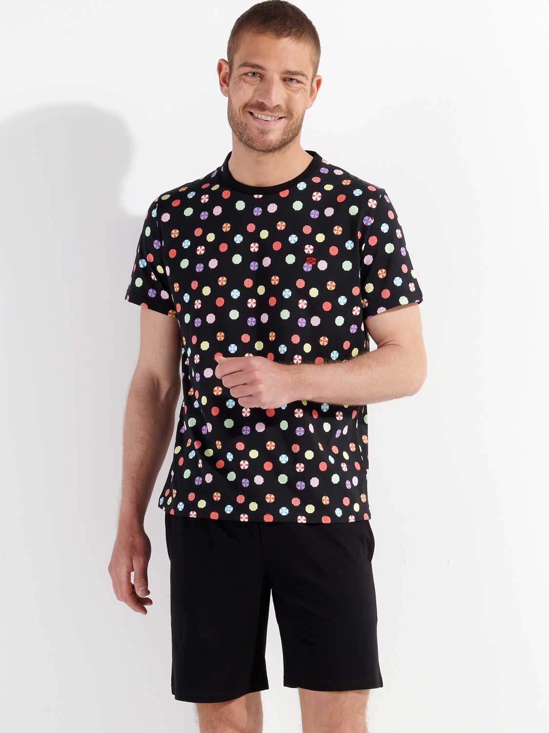 De Fabian - Short Sleepwear is gemaakt van 100% katoen uitgevoerd in een jersey. Deze shortama beschikt over een T-shirt met een speelse kleurrijke print met parasols op een zwarte achtergrond. Het shirt heeft korte met mouwen en een ronde neklijn met HOM tape aan de binnenzijde van de neklijn. Het short is in effen zwart uitgevoerd met steekzakken aan de linker en rechterzijde in de zoom. In de heupband bevindt zich een trekkoord om het short perfect op maat te brengen.