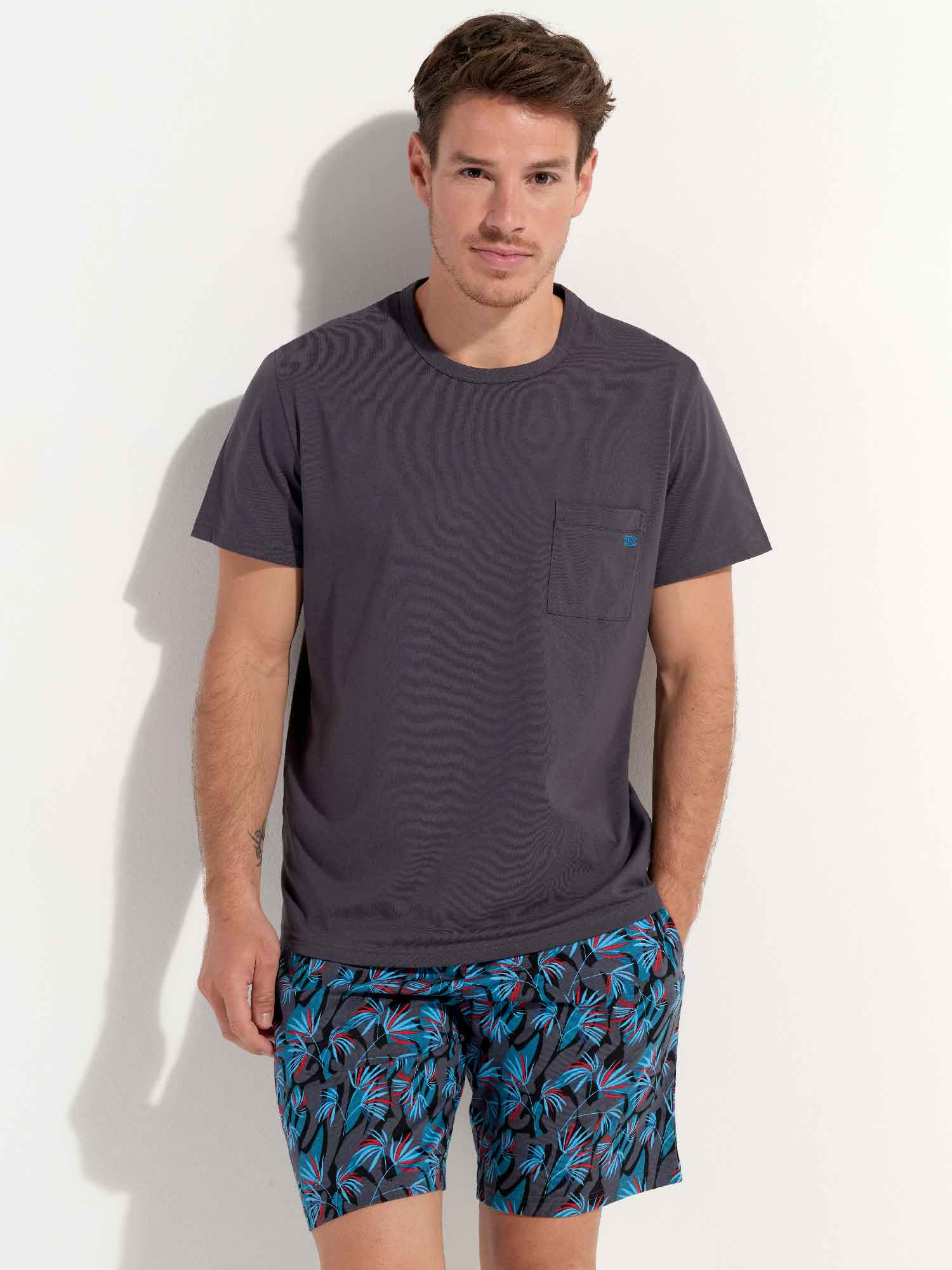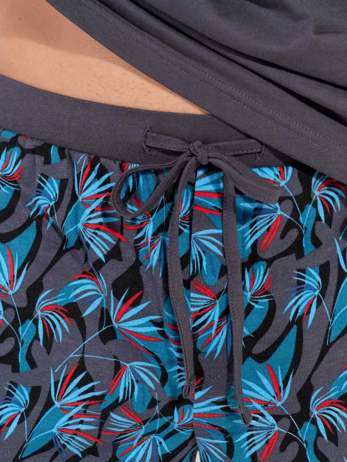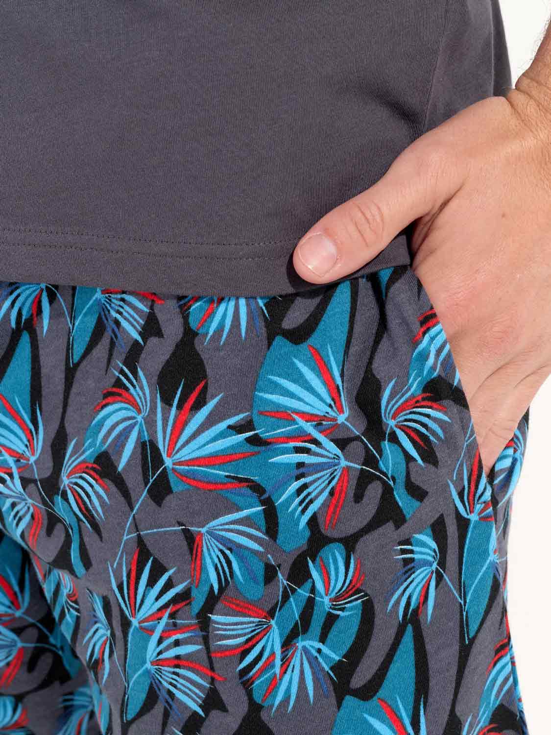 De Hanoï- Shortama is gemaakt van 100% katoen, uitgevoerd in een jersey. De pyjama beschikt over een effen grijs T-shirt met korte mouwen en heeft een ronde kraag. De korte broek is uitgevoerd met een exotische meerkleurige blader print op een grijze achtergrond. De broek beschikt over steekzakken in de zoom, aan de linker en rechterzijde en heeft een trekkoord in de heupband om deze perfect op maat te brengen.
