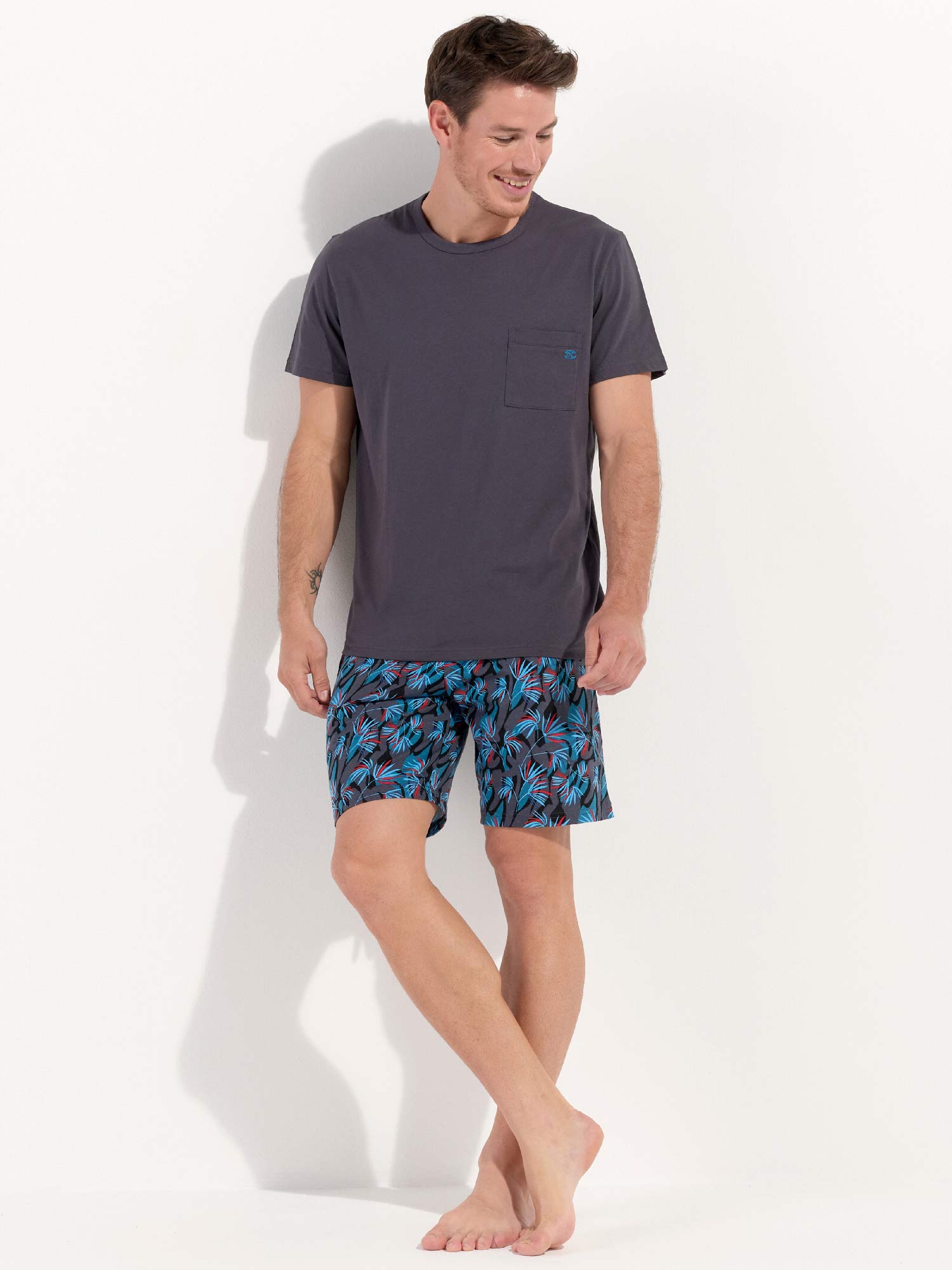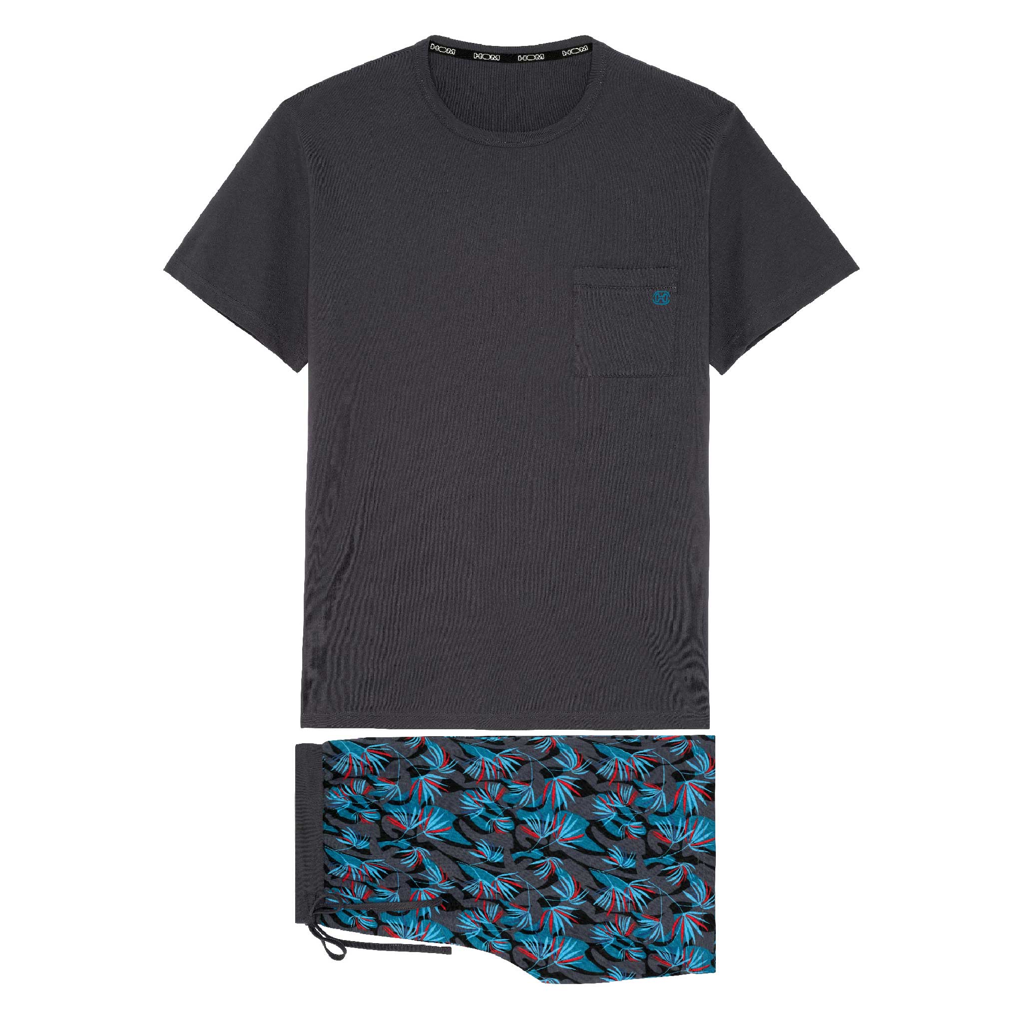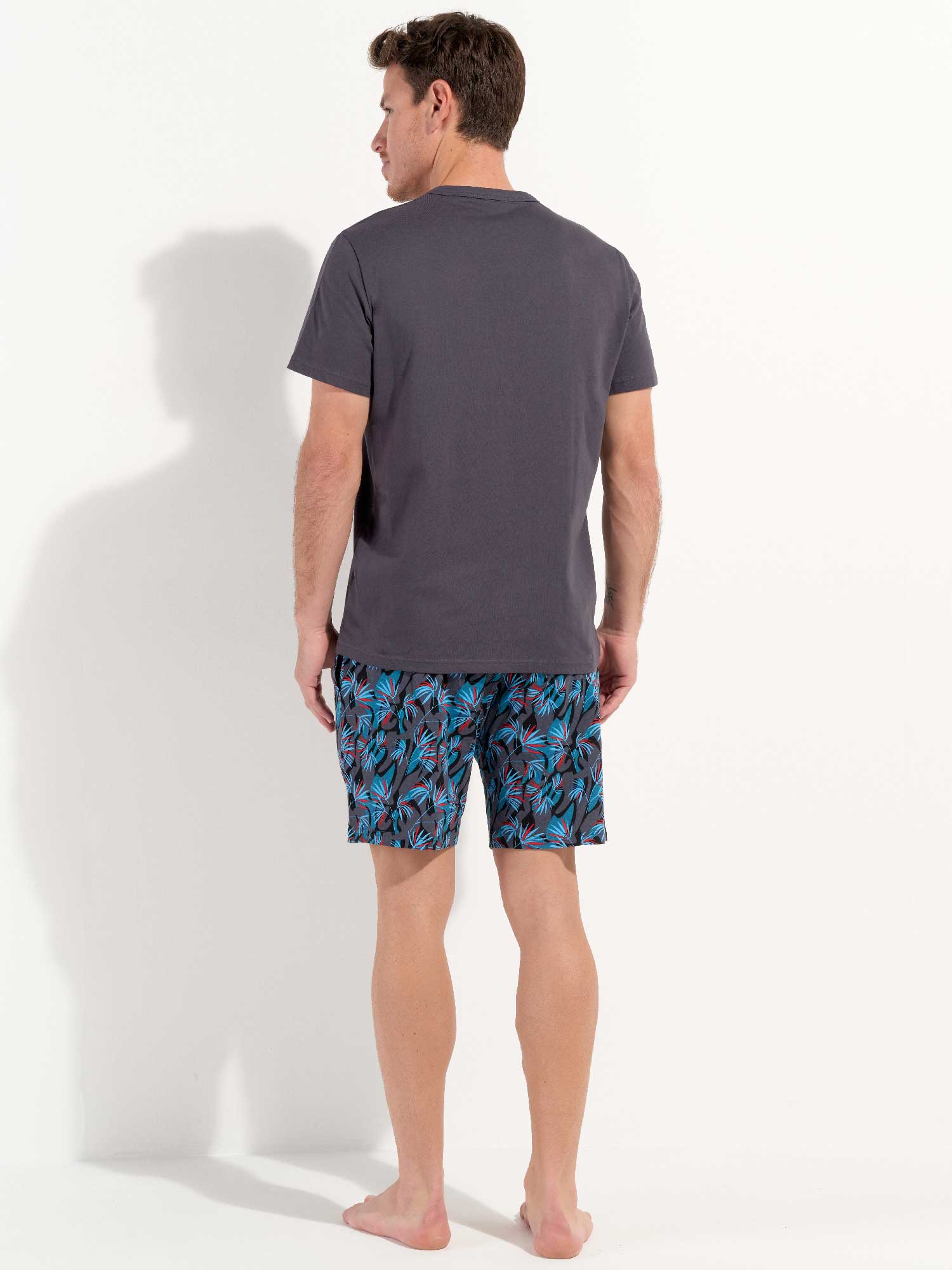 De Hanoï- Shortama is gemaakt van 100% katoen, uitgevoerd in een jersey. De pyjama beschikt over een effen grijs T-shirt met korte mouwen en heeft een ronde kraag. De korte broek is uitgevoerd met een exotische meerkleurige blader print op een grijze achtergrond. De broek beschikt over steekzakken in de zoom, aan de linker en rechterzijde en heeft een trekkoord in de heupband om deze perfect op maat te brengen.