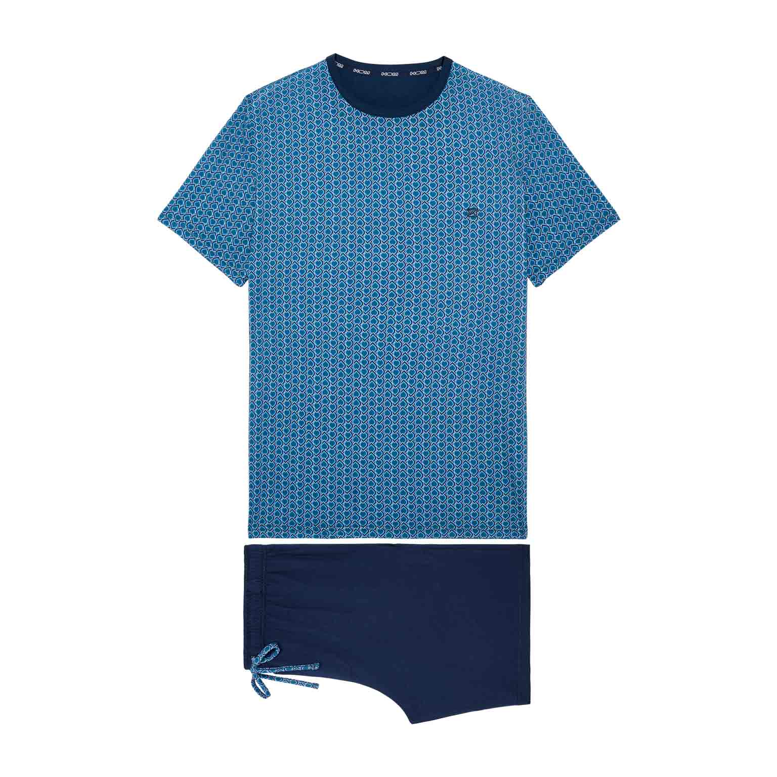 Met zijn grafische patroon en geraffineerde kleurencombinatie is de Martinez shortama van HOM een stijlvolle keuze voor warme nachten of ontspannen ochtenden. Het korte mouwshirt is uitgevoerd in een blauw Art Deco motief dat subtiel verwijst naar Egyptische ornamenten. De effen navy short met zakken heeft een elastische tailleband met een printkoord dat mooi aansluit bij het shirt. Dankzij het gebruik van 100% katoen voelt deze shortama heerlijk zacht aan en blijft hij comfortabel, ook na veelvuldig wassen. Tijdloze klasse in een modern silhouet.