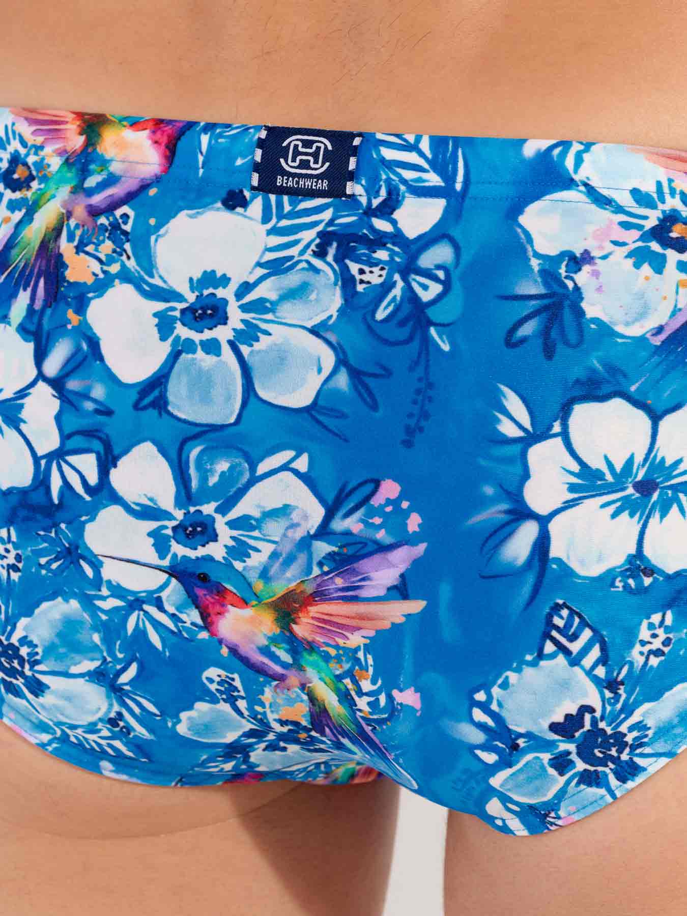 De Colibris - Swim Micro Briefs maken deel uit van de zomercollectie zwemkleding van HOM. Felgekleurde kolibries op een exotisch bloemenmotief in blauwtinten roepen de tropische sfeer van het Caribisch gebied op. De stof is elastisch, sluit mooi aan op de huid en is niet doorschijnend. Omdat dit micro briefs zijn, zitten ze laag op de heupen. Het trekkoord in de tailleband maakt het mogelijk om de zwembroek perfect af te stellen op jouw maat.