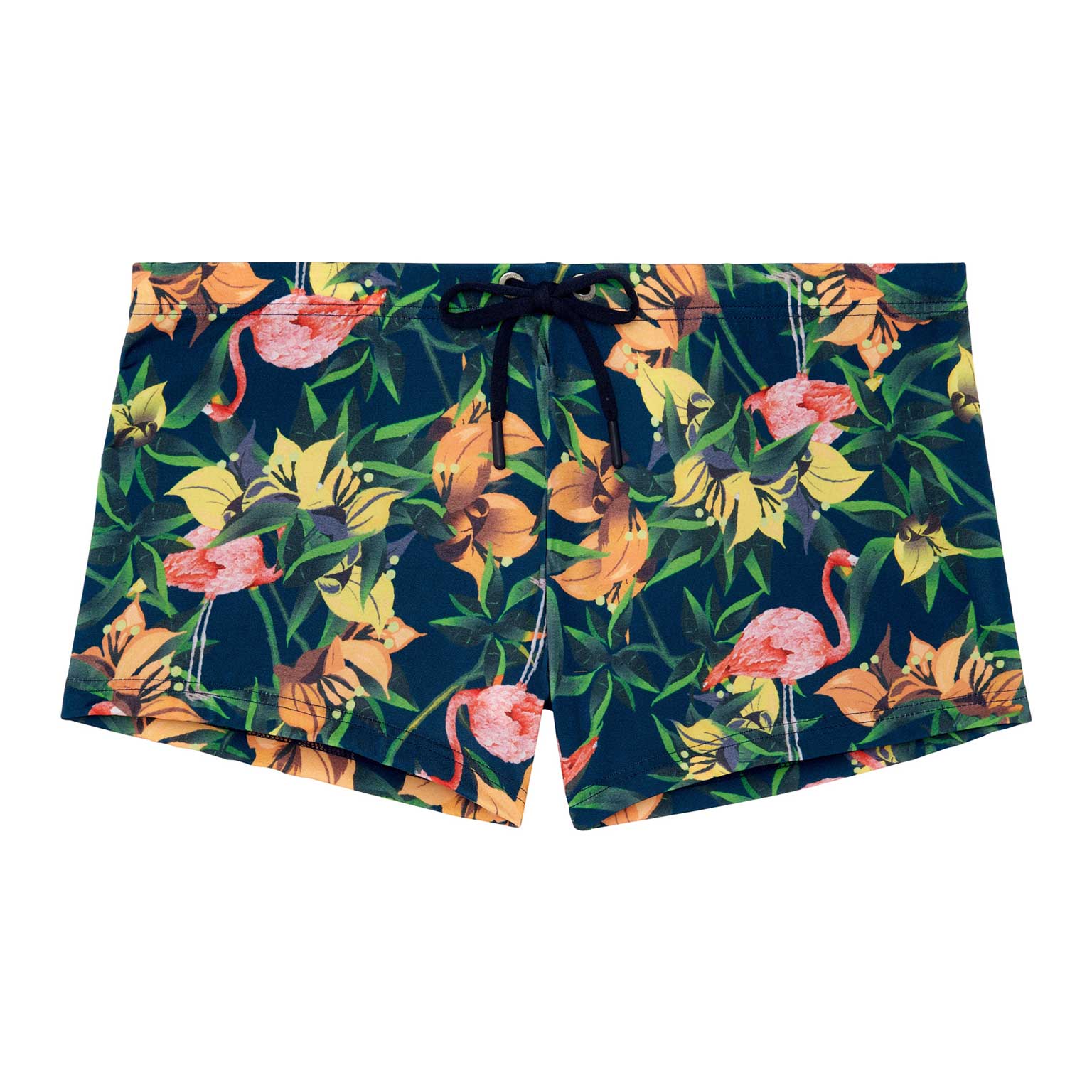 De Flamingo - Swim Shorts met een prachtige tropische look door zijn kleurrijke print met roze flamingo's op een achtergrond van gele en oranje bloemen. De stof is elastisch, sluit mooi aan op de huid en schijnt niet door. Met het trekkoord in de heupband breng je de zwemshort perfect op maat. Dit tropische mode-item geeft je een gevoel van vakantie.