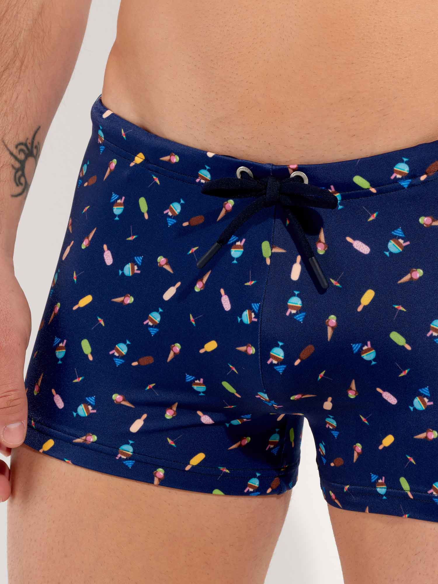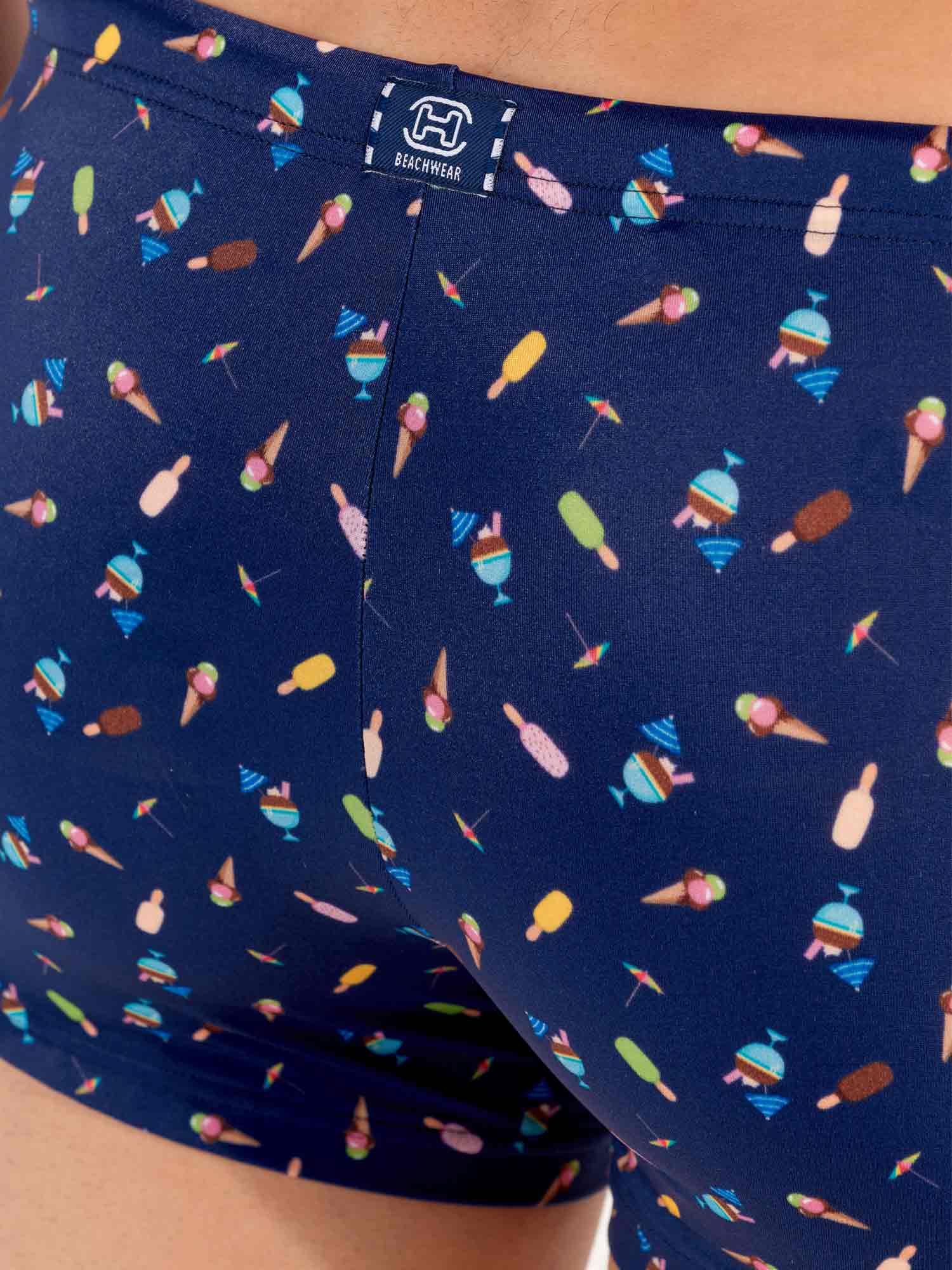 De Summer - Swim Shorts maken deel uit van de zomercollectie zwemkleding van HOM. De print toont kleurrijke ijsjes op een marineblauwe achtergrond en roept de zoetheid en zachtheid van zomervakanties op. De stof is elastisch, sluit mooi aan tegen de huid en is niet doorschijnend. Het trekkoord in de tailleband zorgt ervoor dat je de zwembroek perfect kunt afstellen voor een stevige pasvorm. Met dit mode-item breng je een vleugje vrolijkheid naar het strand of het zwembad.