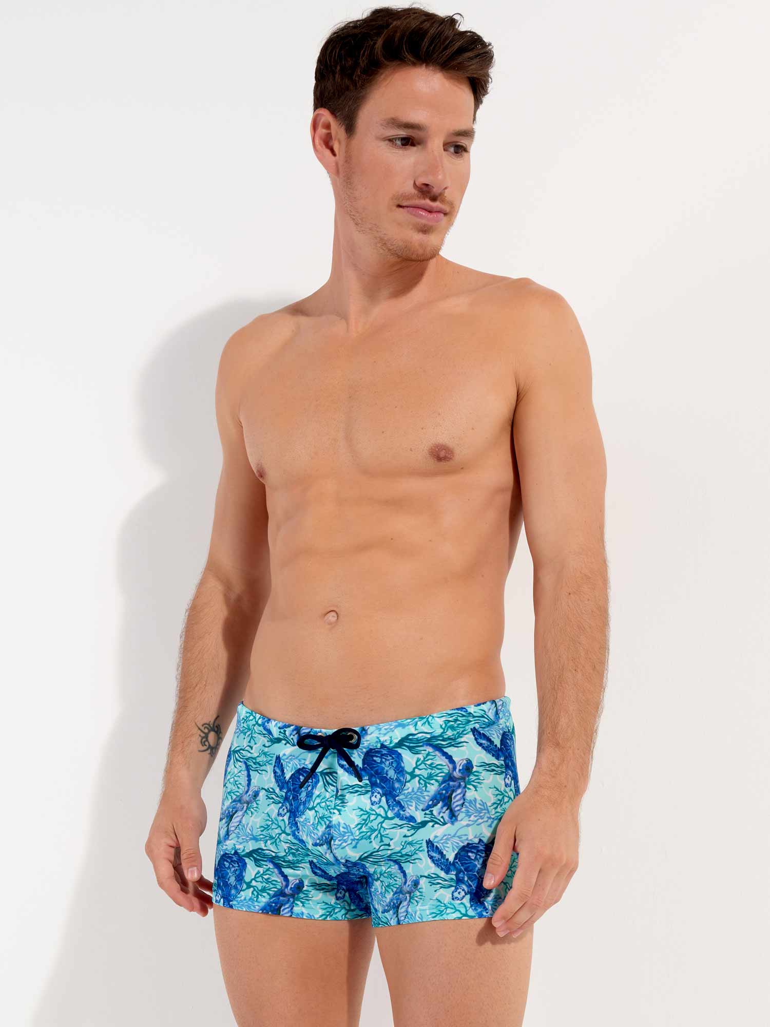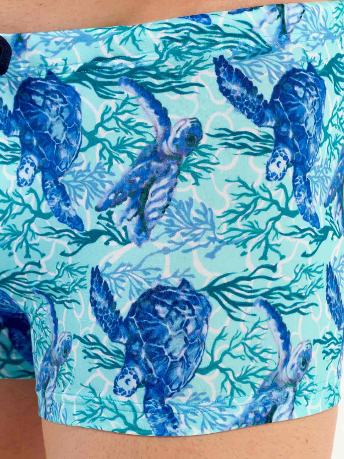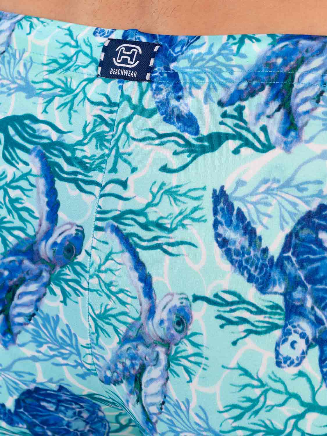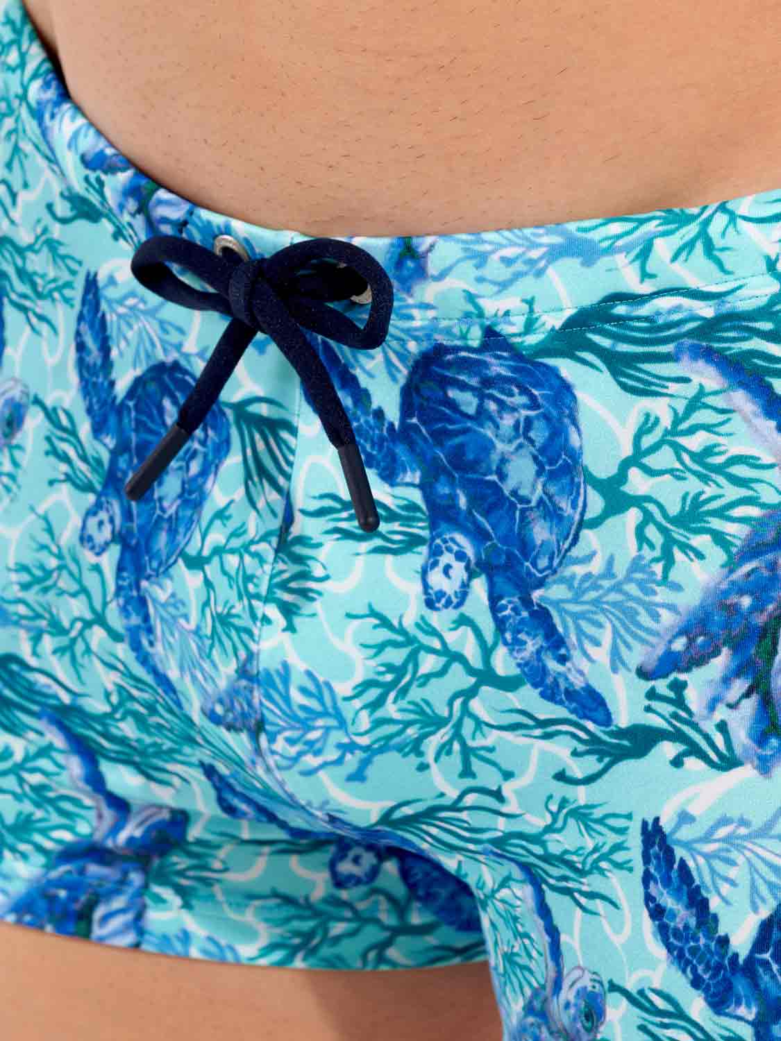 De Tartane - Swim Shorts hebben een verfrissende print met zeedieren. Blauwe schildpadden op een turquoise achtergrond sieren dit waterachtige ontwerp dat doet denken aan de zeebodem van de Caribische eilanden. De schildpad staat symbool voor wijsheid, moed en doorzettingsvermogen. De stof is elastisch, sluit mooi aan op de huid en is niet doorschijnend. Het trekkoord in de tailleband maakt het mogelijk om de zwembroek perfect af te stellen op jouw maat voor een stevige pasvorm. Met dit mode-item breng je een vrolijke noot naar het strand of het zwembad.