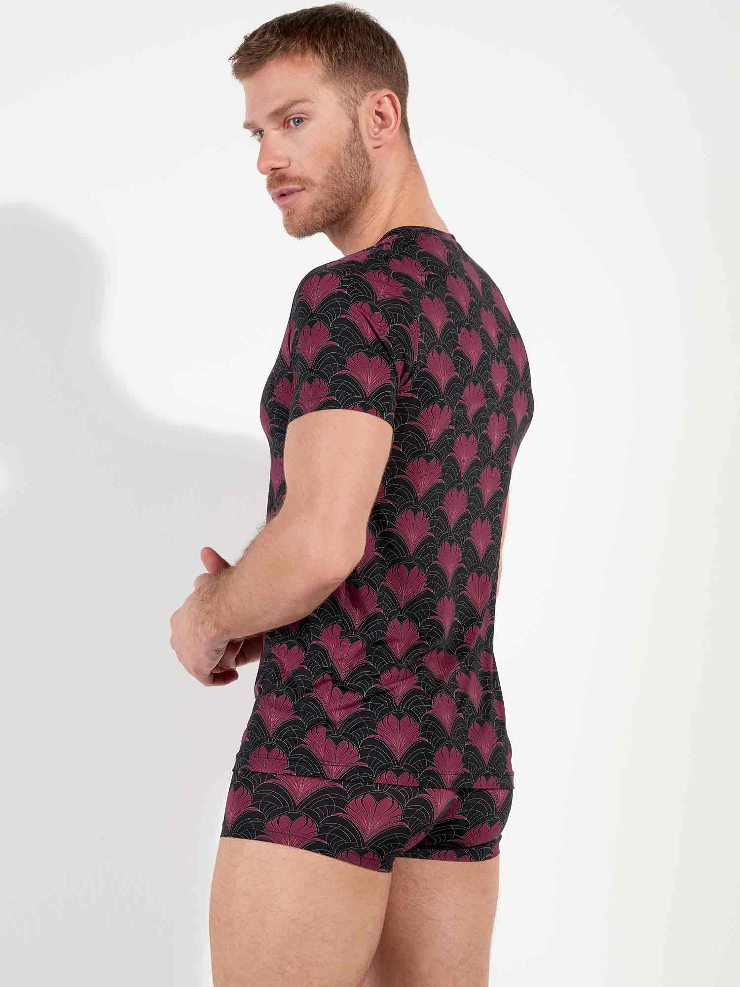 Het Carlyle shirt is meer dan een loungewear basic: het is een statement van stijl en verfijning. Het luxueuze Art Deco-patroon in bordeaux en goud komt prachtig tot zijn recht op de diepzwarte basis. De gladde, ademende microvezel voelt aan als een tweede huid en volgt moeiteloos elke beweging. Het shirt is uitgevoerd met een elegante V-hals en is te combineren met de bijpassende trunk tot een complete set.