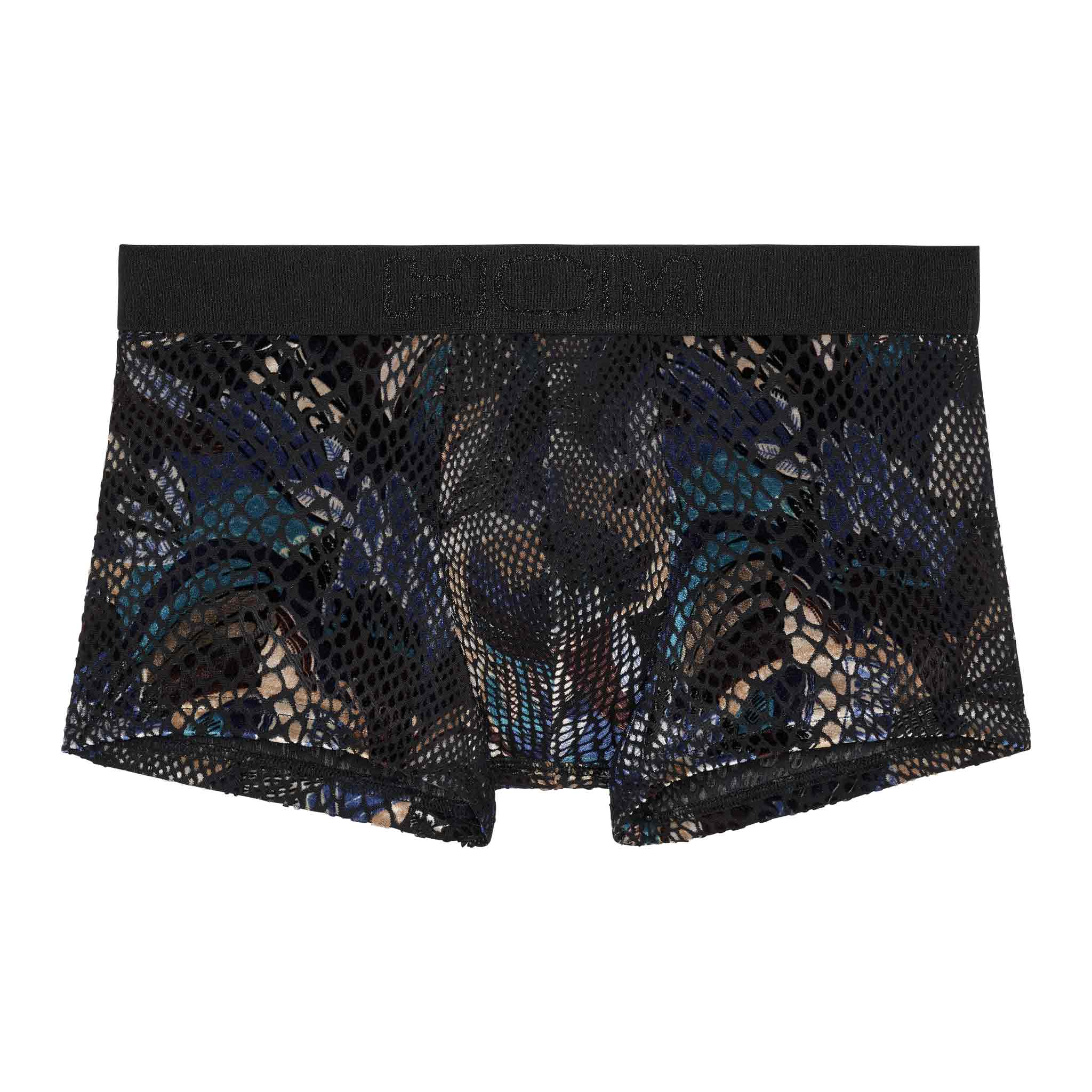 De HOM Cobra trunk is een gedurfd en sensueel model, vervaardigd uit devoré mesh met een opvallend dierenpatroon. De fluweelzachte flokprint creëert een weelderige textuur die niet alleen luxueus oogt, maar ook aangenaam aanvoelt tegen de huid. De diepe tinten blauw, brons en zwart versterken het exotische karakter. De voorkant is gevoerd voor extra draagcomfort zonder aan transparantie in te boeten. Een echte eyecatcher voor de zelfverzekerde man.
