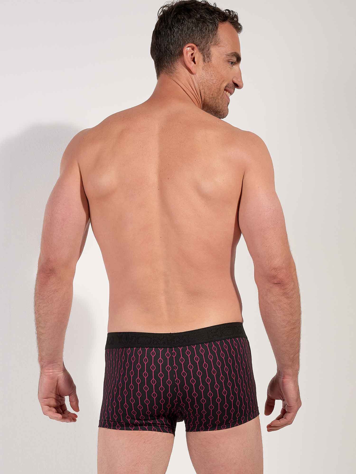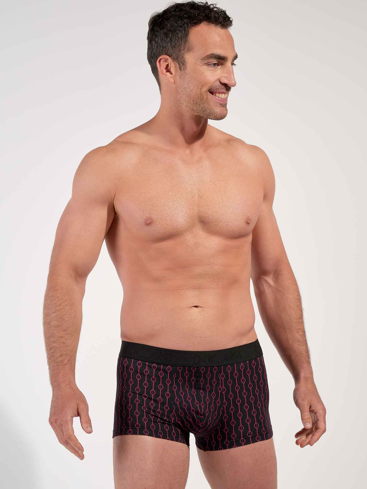 De Dunes Trunk is geïnspireerd op de retro elegantie van Las Vegas en heeft een verfijnd geometrisch design in 50’s stijl. Bordeauxkleurige vormen op diepzwart roepen de ingetogen glamour op van het legendarische Dunes hotel. De korte trunksnit zit hoog op het bovenbeen voor een moderne, strakke look en veel bewegingsvrijheid. Afgewerkt met een zachte HOM logo tailleband en een discreet elastisch paneel in de beenzoom, zodat de trunk de hele dag netjes op zijn plek blijft.