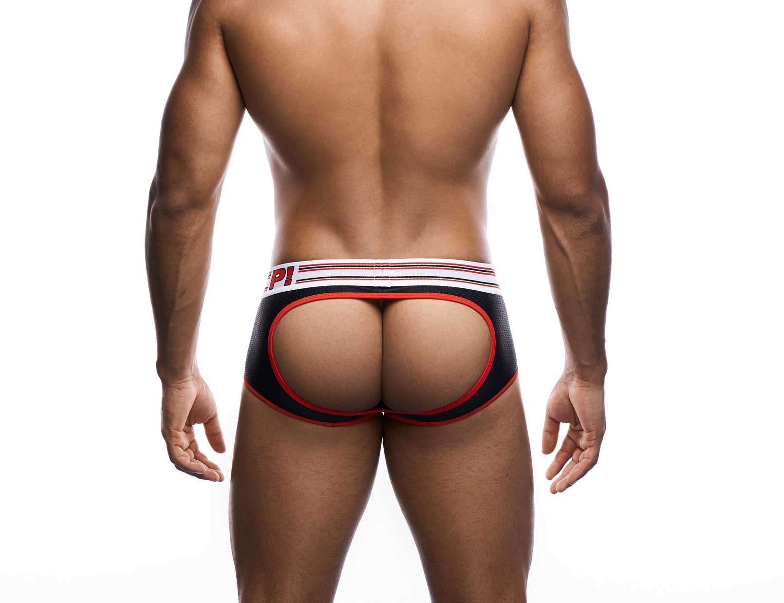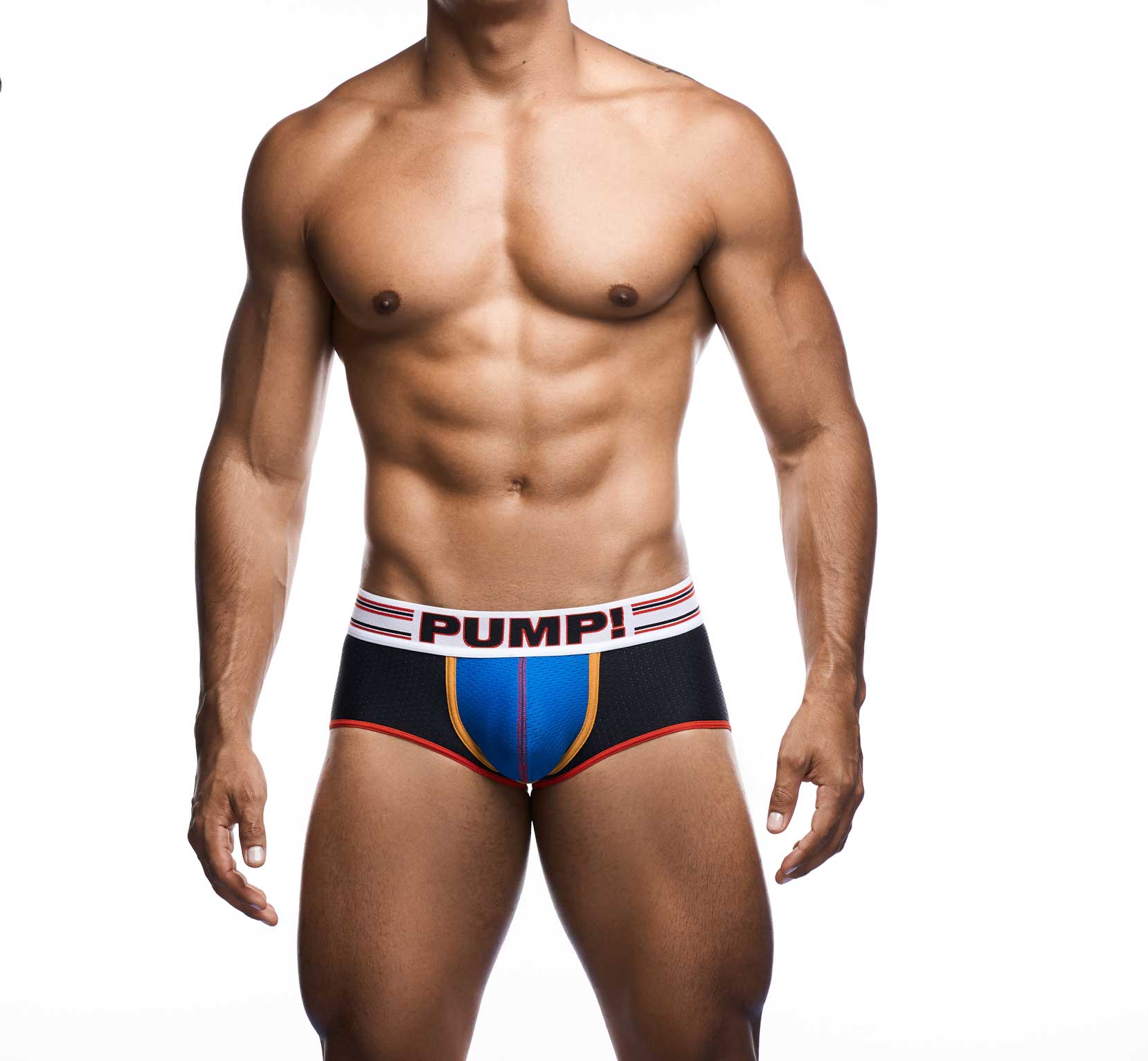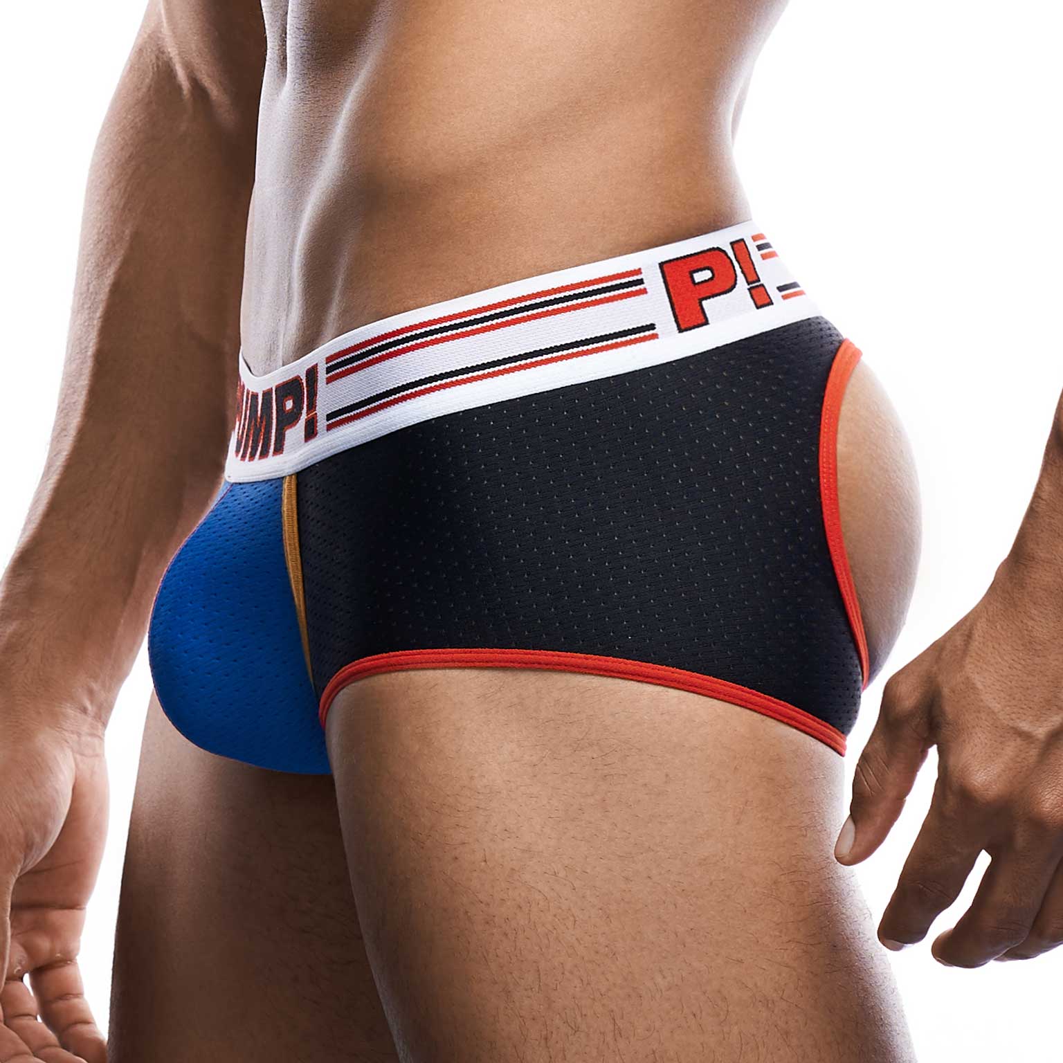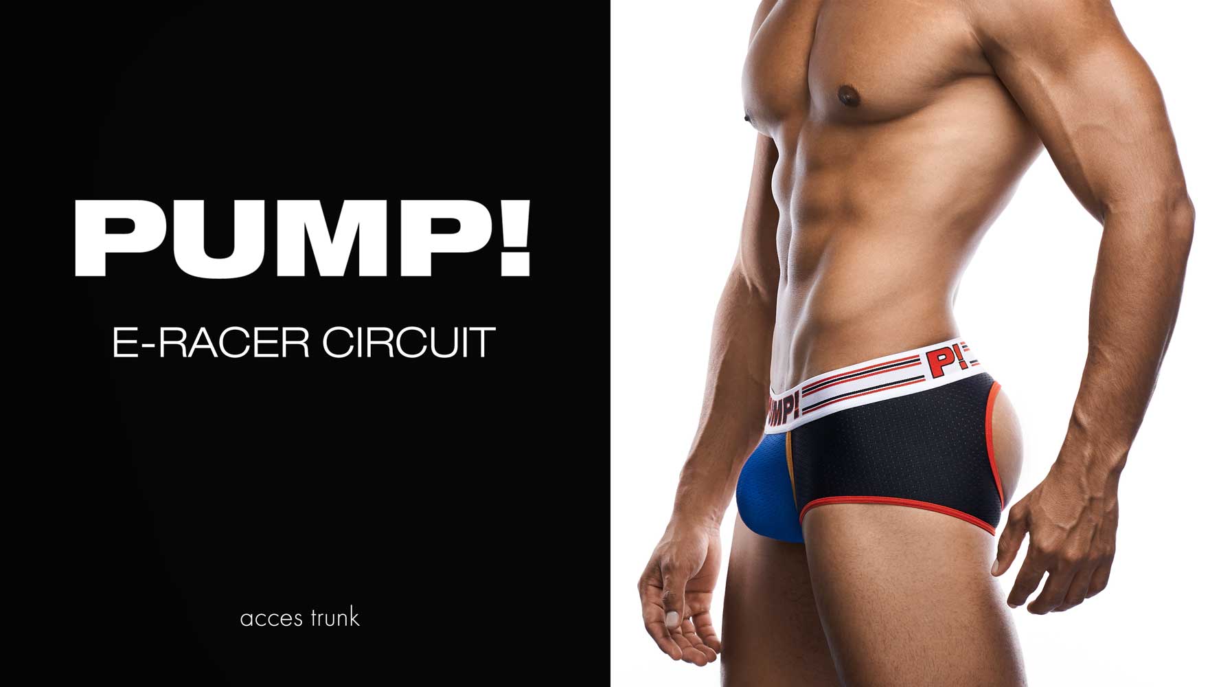 De Circuit - Acces Trunk met een zwarte mesh body en een blauwe mesh cup voor een sportieve uitstraling. De Access trunk is afgewerkt met rode en oranje biezen en stiksels, waardoor je een snel gevoel krijgt alsof je op het circuit bent bent. De stoere tailleband met race-strepen brengt je in overdrive. Als dat niet genoeg is om mensen te laten stoppen! De achterzijde is open en de billen worden ondersteund met elastiek, een trunk met het plezier van een jockstrap.