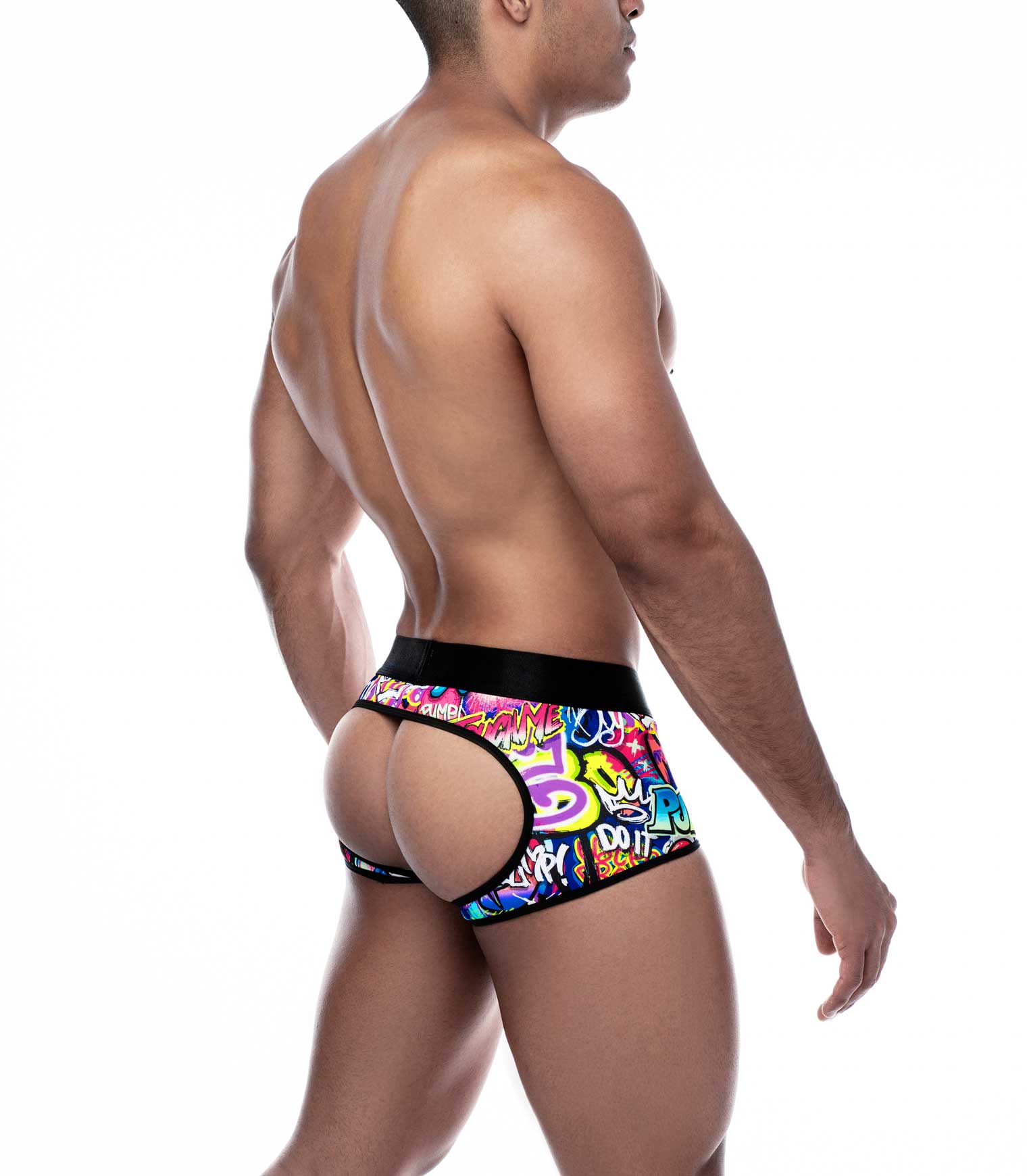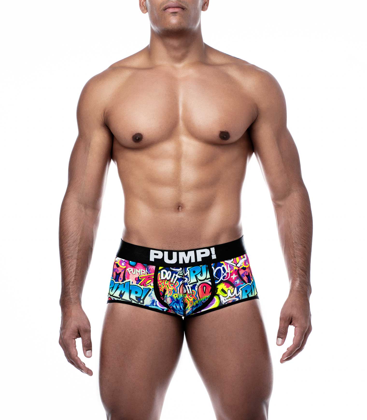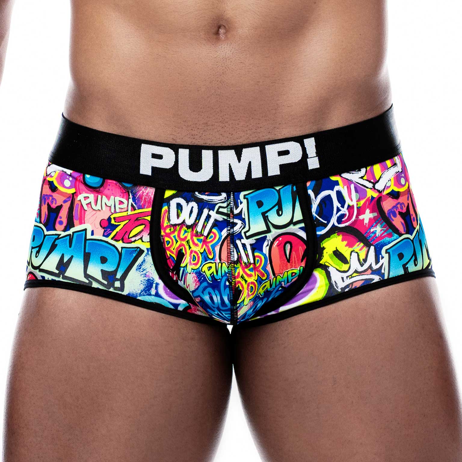 Laat je beste troeven zien met de PUMP! Drip - Access Trunk met een gedurfde graffiti print. De Acces Trunk is uniek met een open achterzijde, waarbij de stof overloopt in straps die zorgen voor ondersteuning en een lift van de billen. De stof is gemaakt van vochtafdrijvend polyester, waardoor je een comfortabel gevoel houdt wanneer je de Drip - Acces Trunk draagt. De brede zwarte tailleband is uitgevoerd met het klassieke PUMP! logo in de kleur wit. De print is op elk exemplaar anders geplaatst waardoor elk Drip- Acces Trunk uniek is.