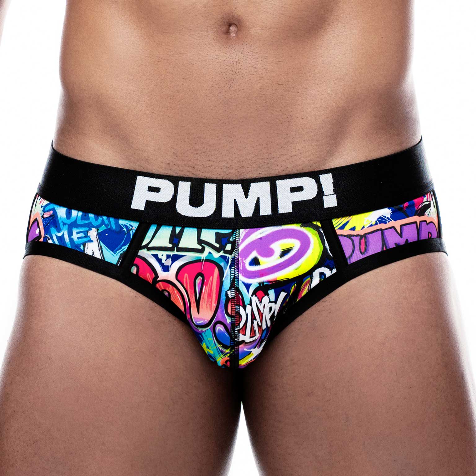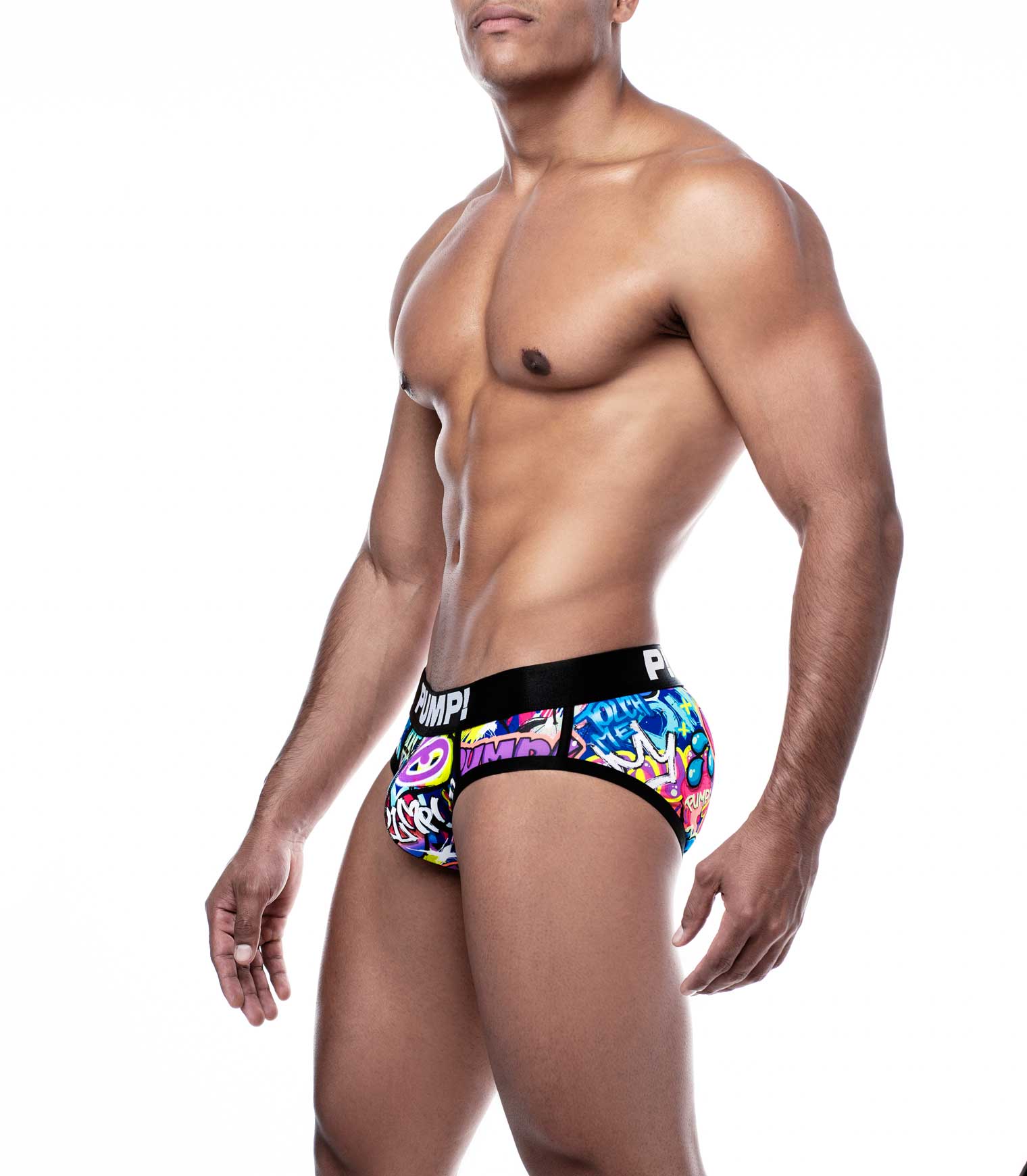 De Drip - Brief is een stoere heren slip PUMP! met een kleurrijke graffiti print gemaakt van een elastische polyester microfiber body rondom, voor optimaal comfort en flexibiliteit. De plaatsing van de graffiti-print is op elk slip anders, waardoor elk exemplaar uniek is. De vochtafvoerende, duurzame microfiber body houdt je koel, terwijl de zwarte elastische tailleband, geaccentueerd met de klassieke PUMP! logo, zorgt voor een goede en comfortabele pasvorm.