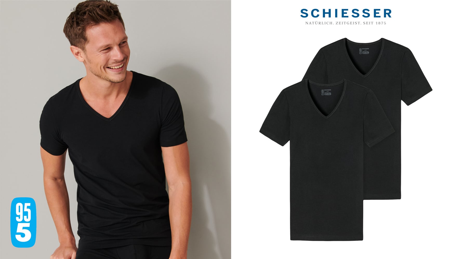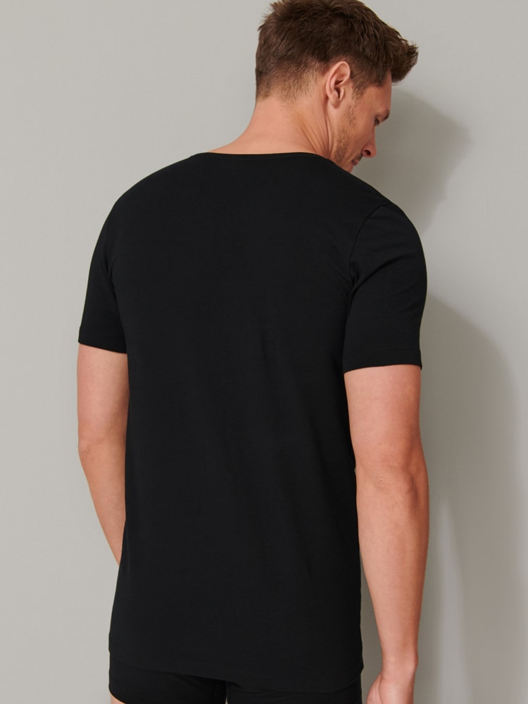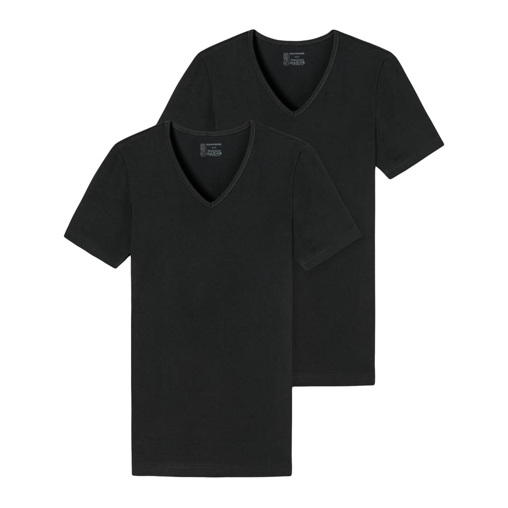 2 T-shirts met een V-hals in een voordelige duo-pack. Deze shirts van Schiesser behoren tot de 95-5 serie, gemaakt van biologisch katoen. De shirts zijn gebreid in een single jersey en door de toevoeging van elastan behouden de shirts uitstekend hun pasvorm, ook tijdens wassen op 60 graden. Kortom, 2 shirts met de kwaliteit die je van Schiesser mag verwachten.