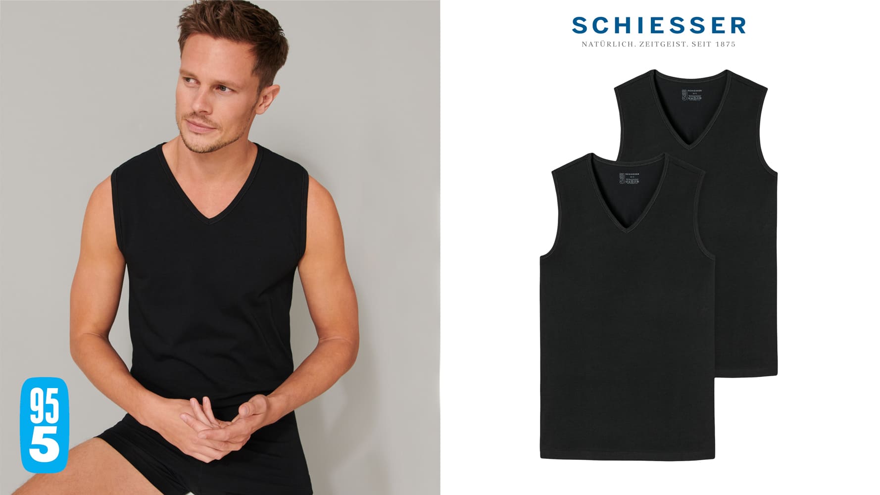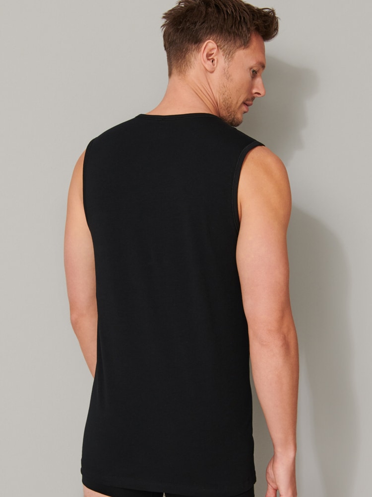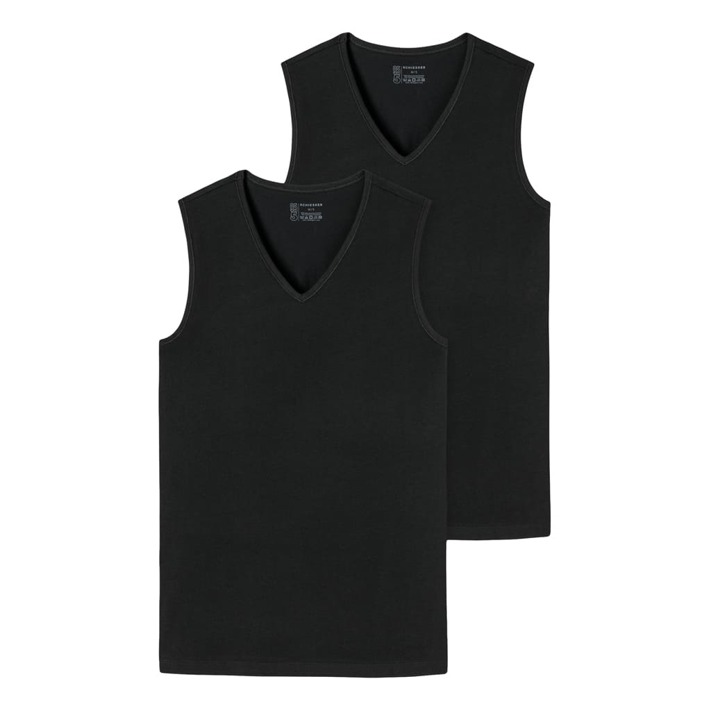2 Tanktops voor de man in een dubbelpack, uit de populaire SCHIESSER-serie "95/5". De tanktops hebben een V-hals en zijn gemaakt van 95% natuurlijk biologisch katoen en 5% elastan, Ze zijn gebreid in een perfect passende elastische single jersey kwaliteit. De 95-5 tantkops kun je wassen op een temperatuur tot 60 graden.