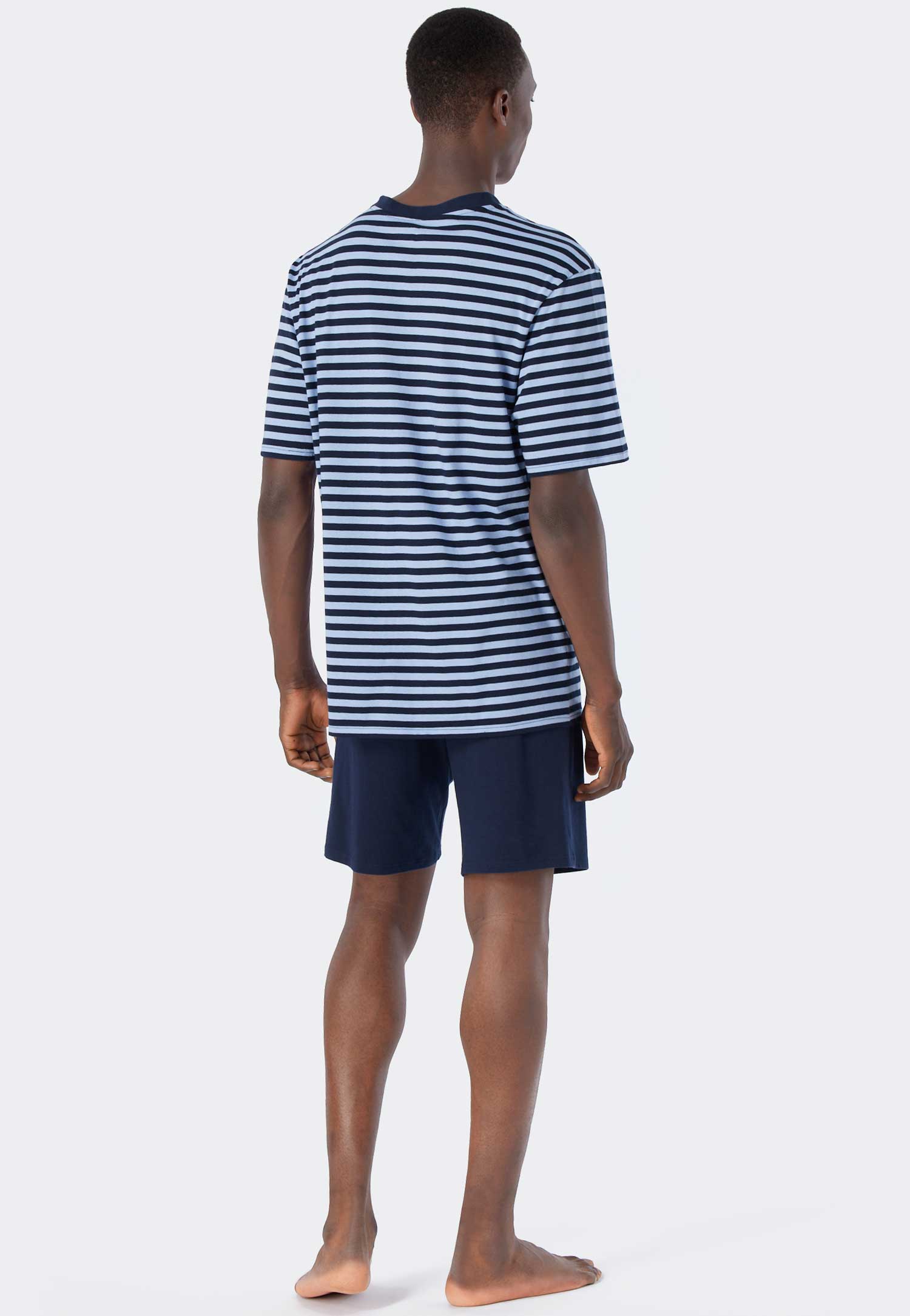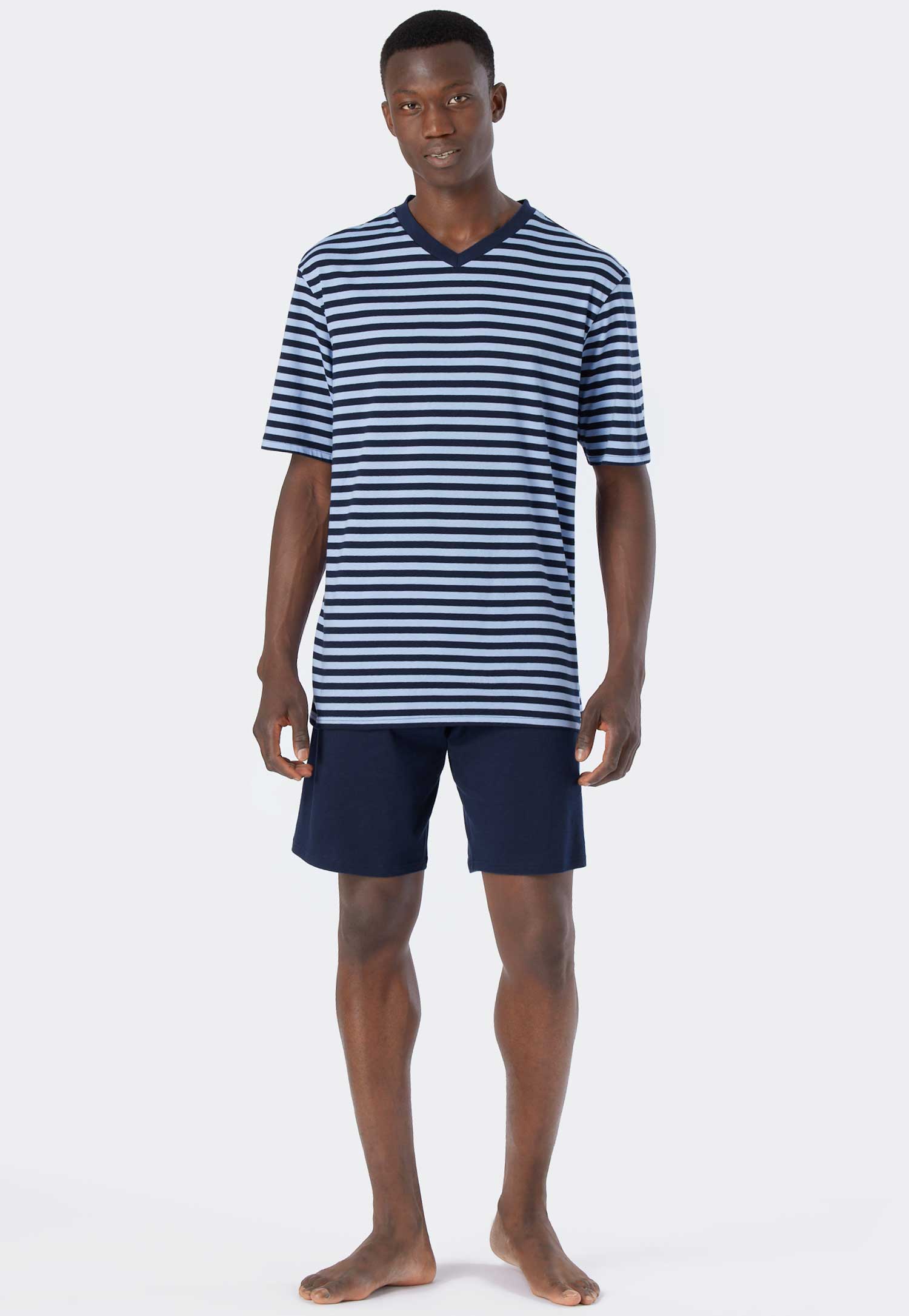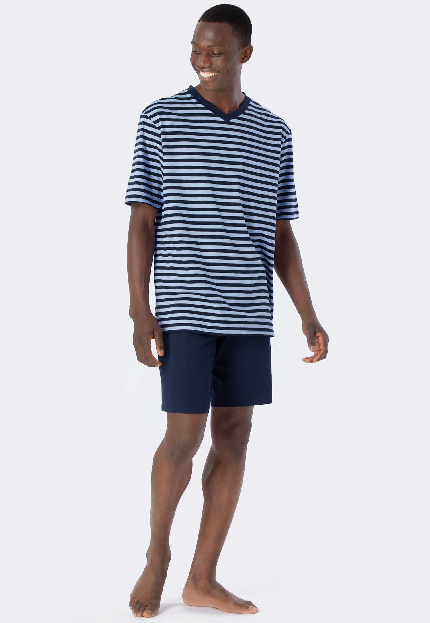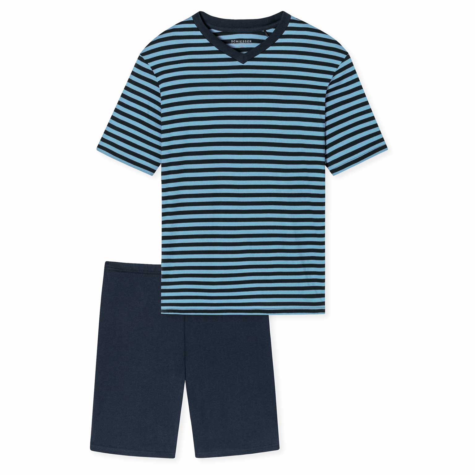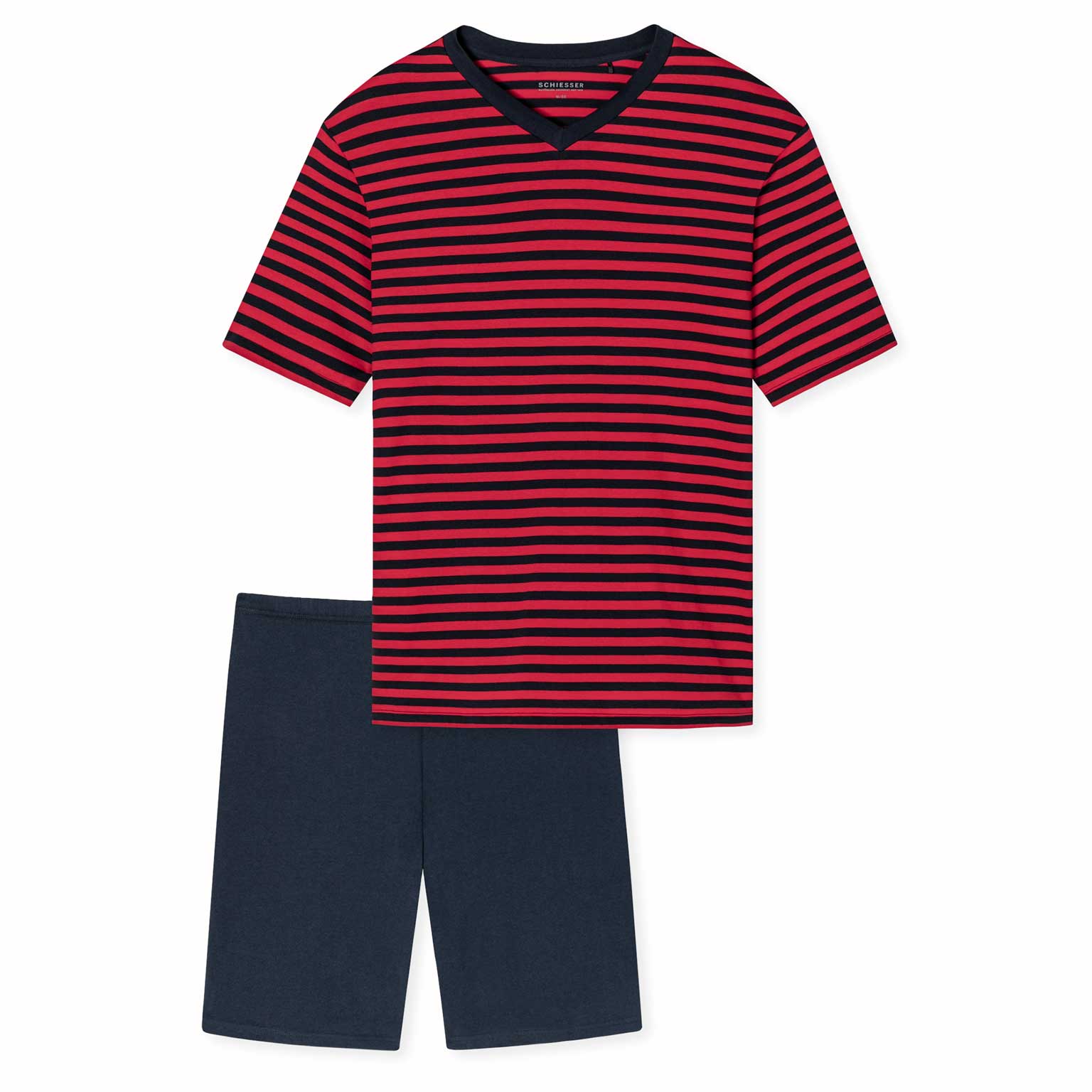 Korte heren pyjama van Schiesser gemaakt van 100% katoen. De pyjama beschikt over een effen short en een shirt met contrasterende strepen en een V-hals. De korte broek is uitgevoerd met een trekkoord in de heupband. De pyjama zit ruim en comfortabel en kun je wassen op een temperatuur van 60 graden.