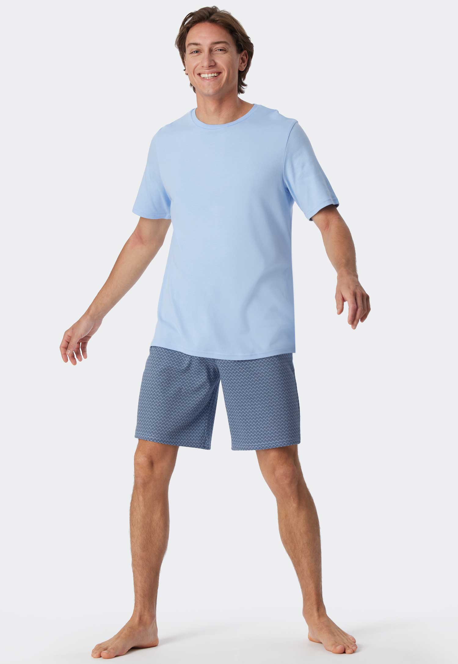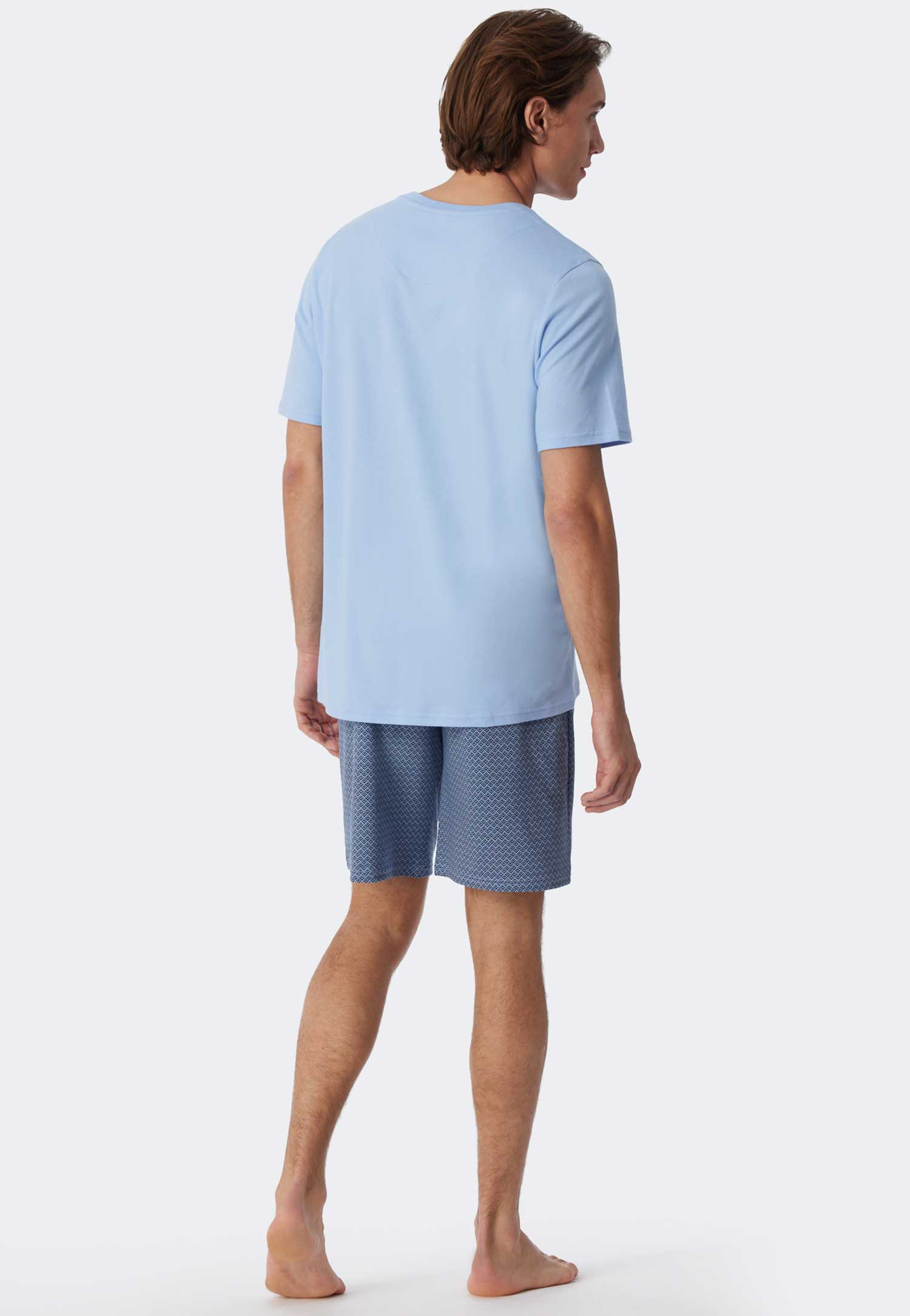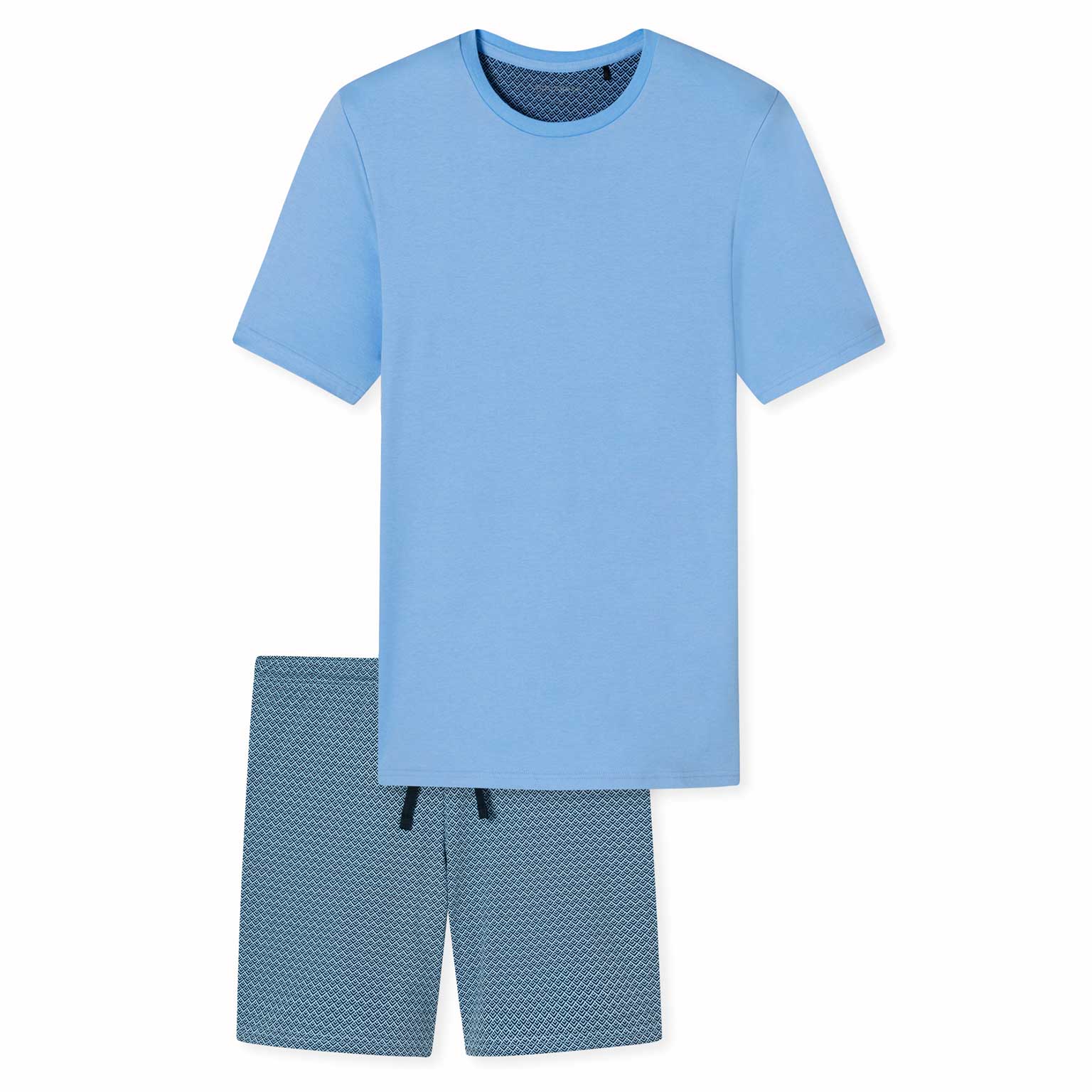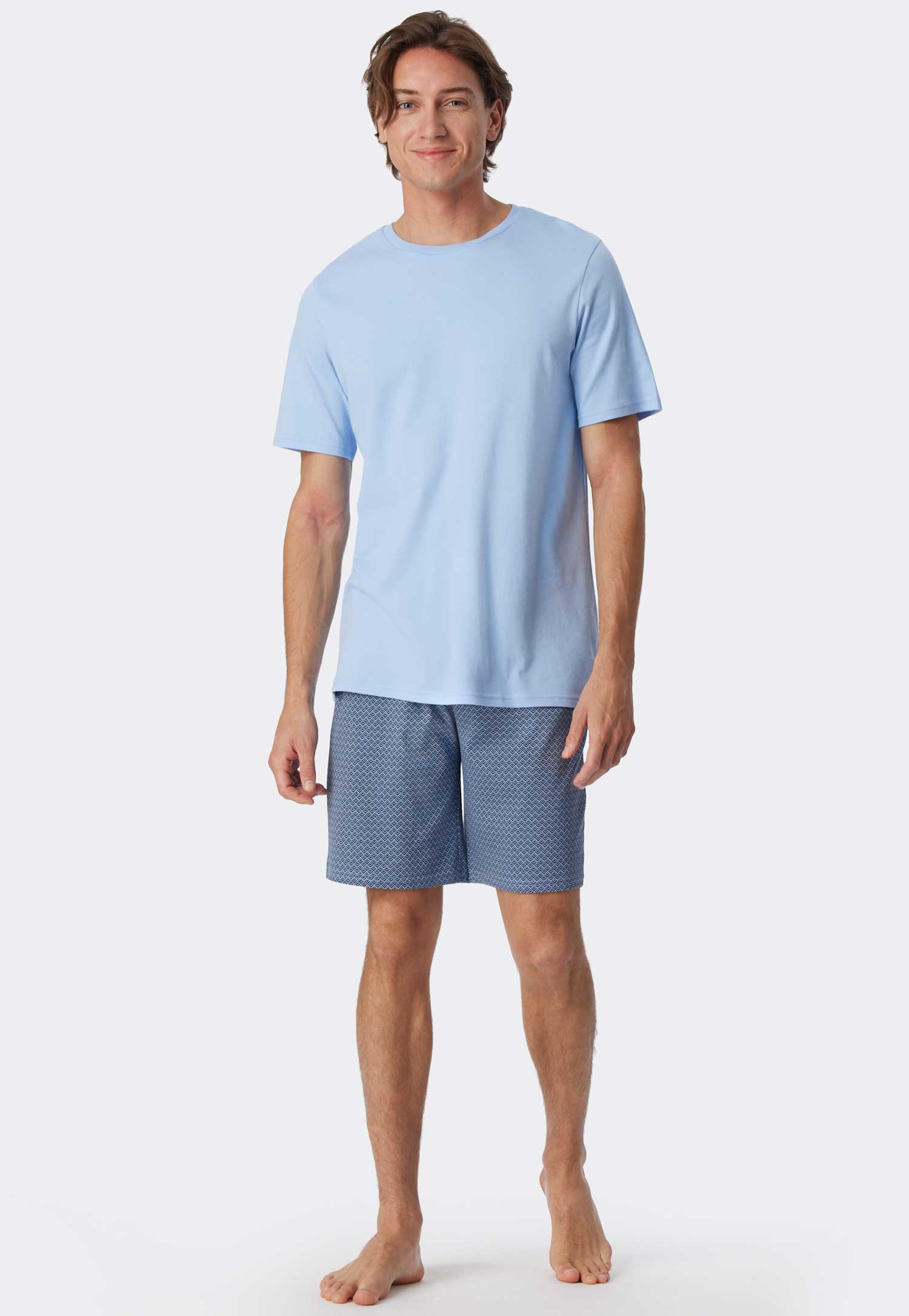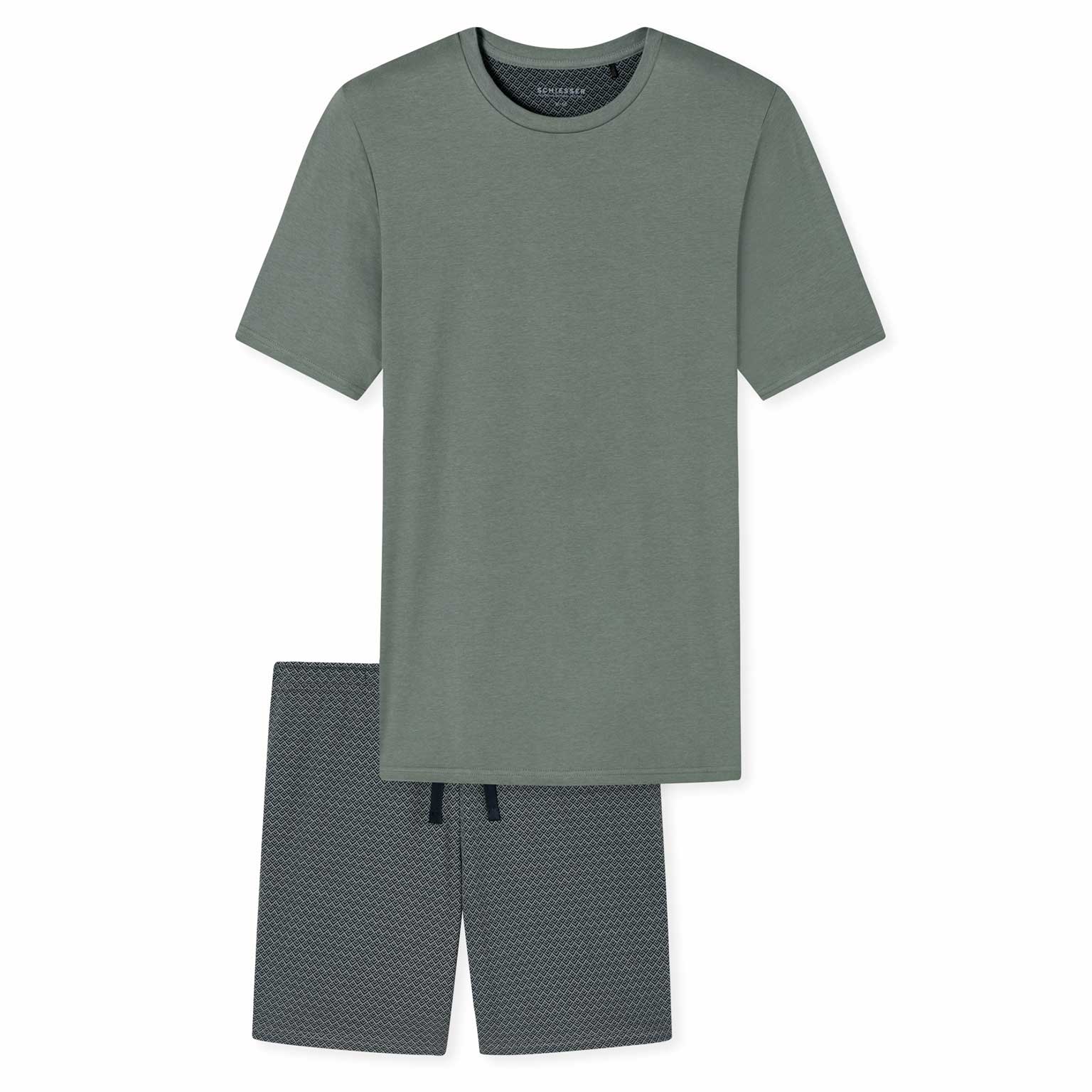 Korte heren pyjama van Schiesser gemaakt van 100% katoen, met een effen shirt en een short met een opvallend patroon. De pyjama heeft een shirt met ronde hals en een short met een trekkoord in de heuplijn voor een verstevigde fit. Geproduceerd met een interlock kwaliteit met een casual look en feel.