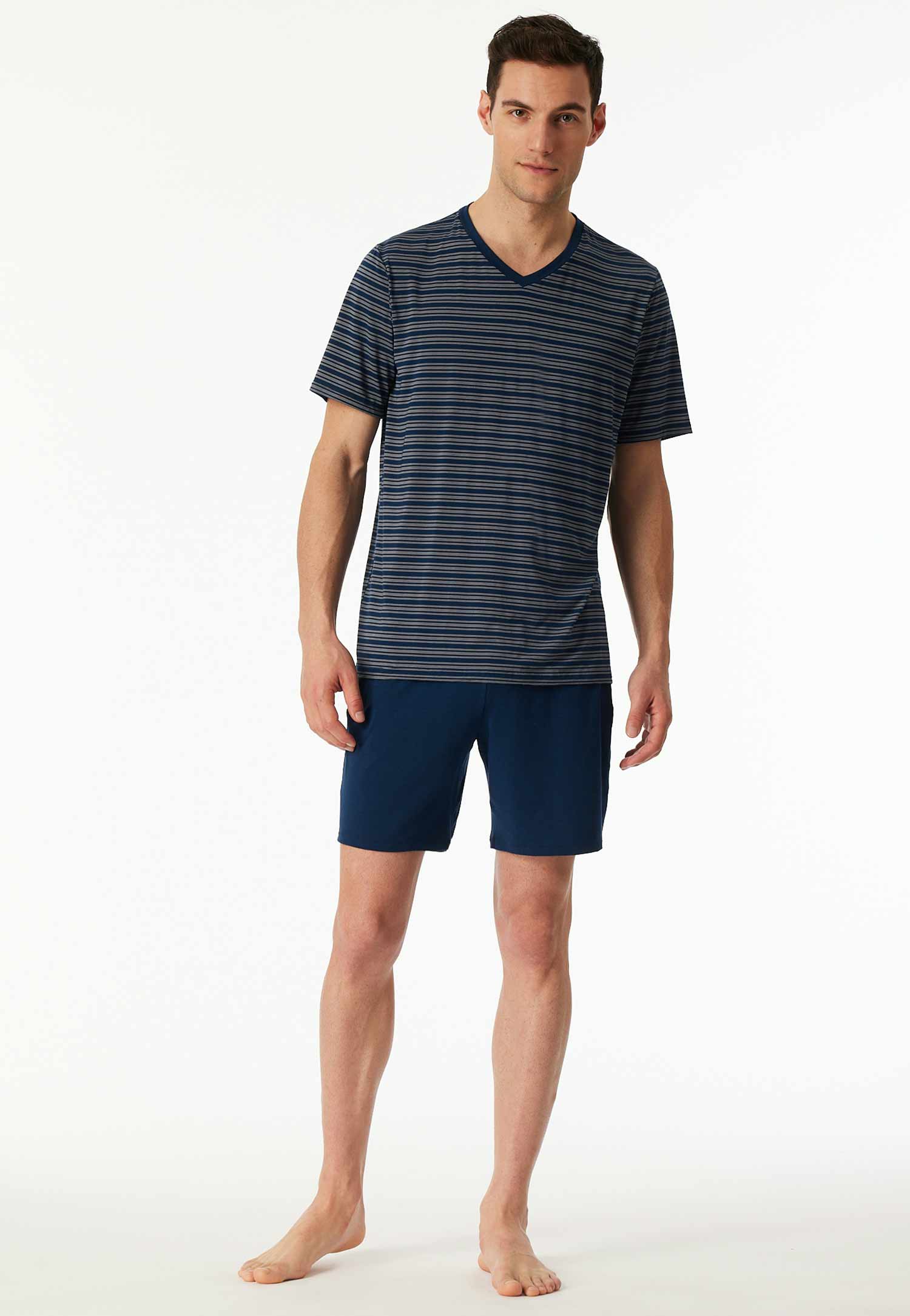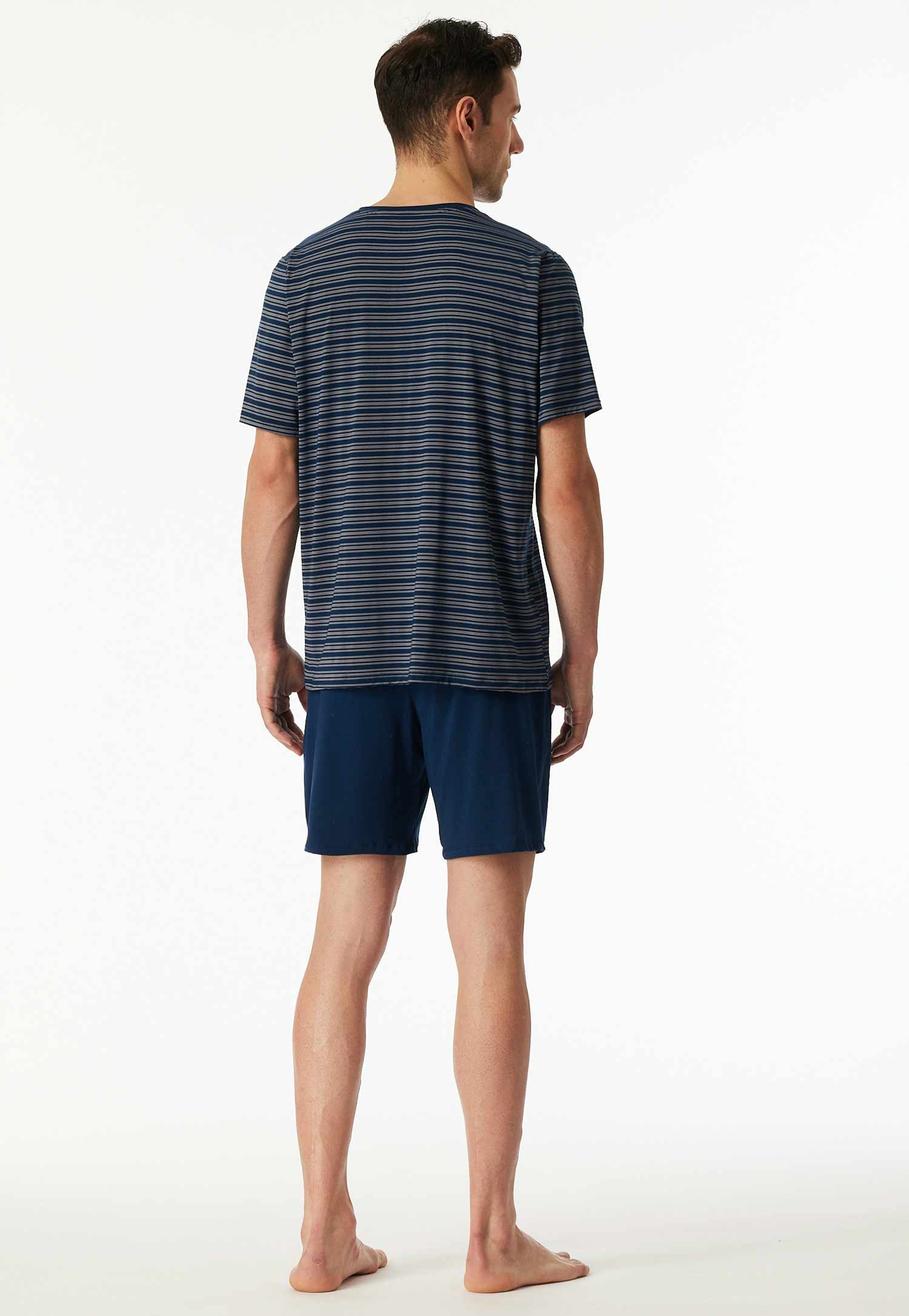 Deze shortama uit de Long Life Soft serie van Schiesser is een comfortabele en duurzame keuze voor warme nachten. Het donkerblauwe shirt is voorzien van een modern streeppatroon en V-hals, en wordt gecombineerd met een effen short in bijpassende kleur. Dankzij de hoogwaardige modalmix voelt de stof heerlijk soepel en glad aan, terwijl het optimale vochtmanagement en de vormvastheid zorgen voor langdurig draagcomfort. Perfect voor de man die kiest voor tijdloze kwaliteit in zijn nachtkleding.