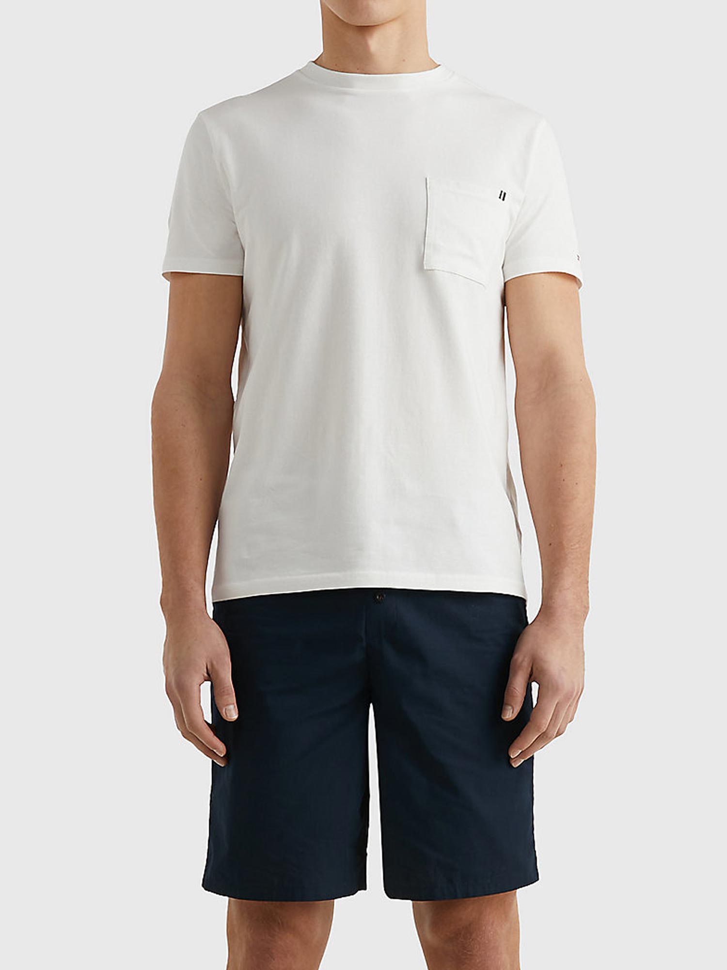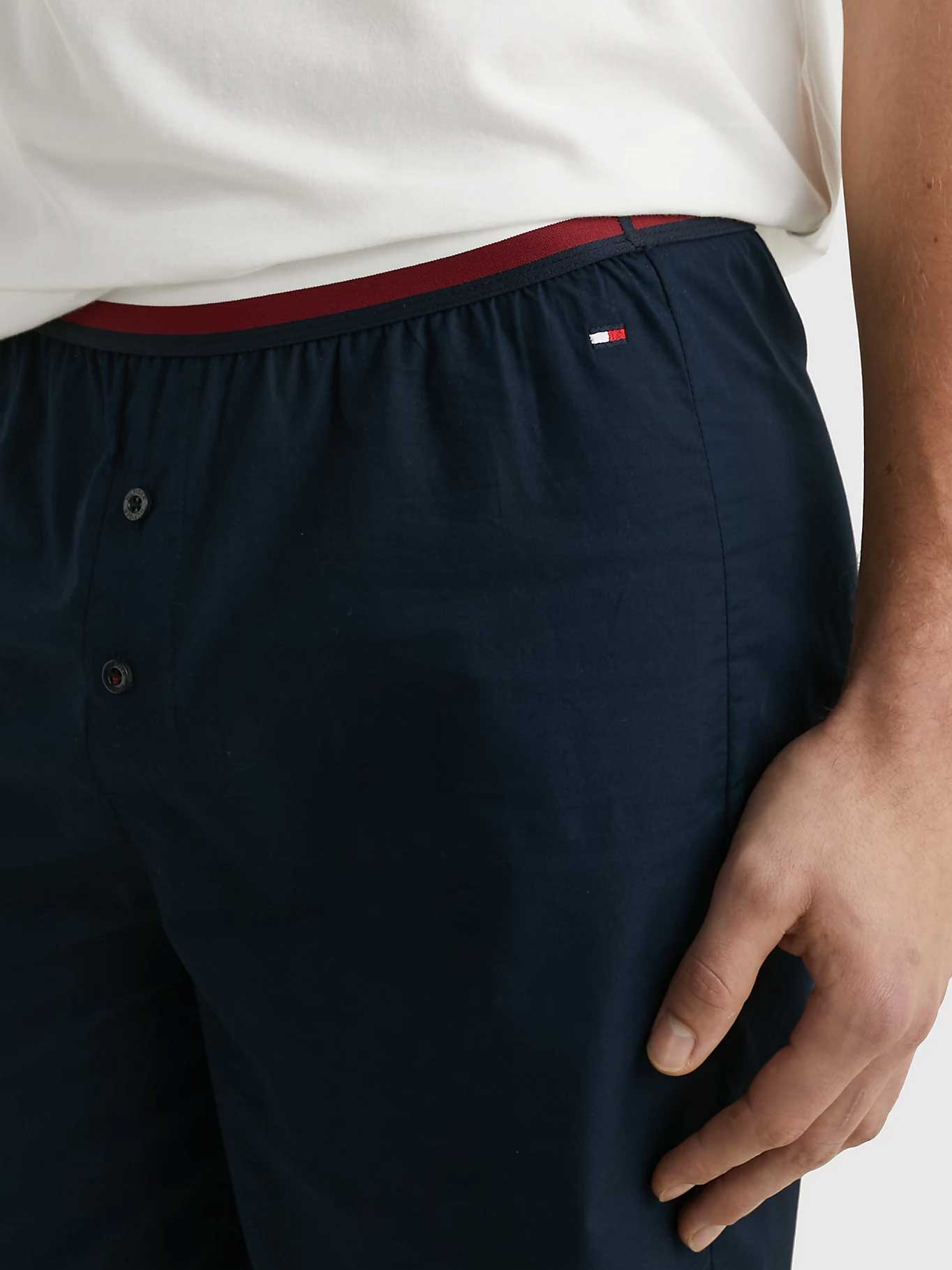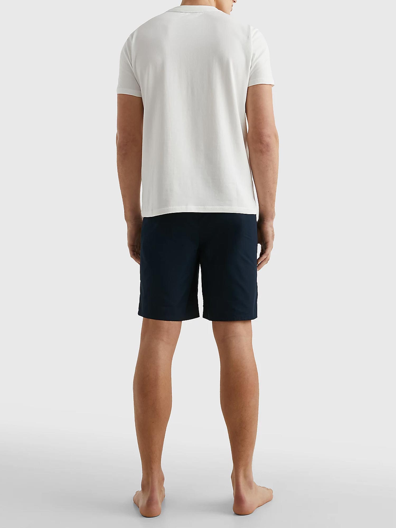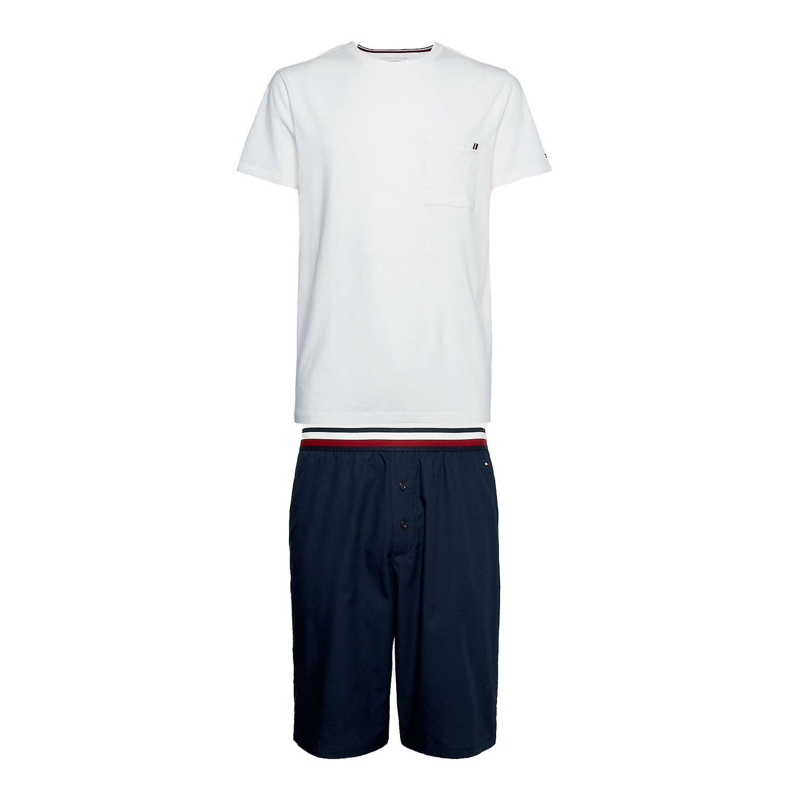 Een Shortama van Tommy Hilfiger die zich kenmerkt door eenvoud. Deze korte pyjama is gemaakt van 100% katoen gebreiden in een jersey voor een lichte stretch. De shortama bestaat uit een wit shirt met een ronde kraag en korte mouwen. Linksvoor heeft het shirt een borstzakje. De korte broek is uitgevoerd in de kleur marine blauw en heeft een elastische heupband, uitgevoerd in de Tommy Hilfiger kleuren. Het short heeft knopen heeft een gulp met knopen voor een moderne retrolook.